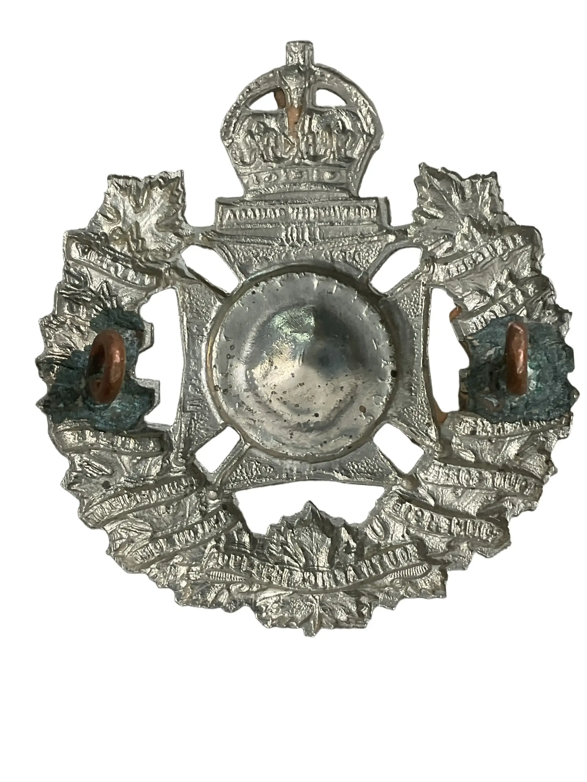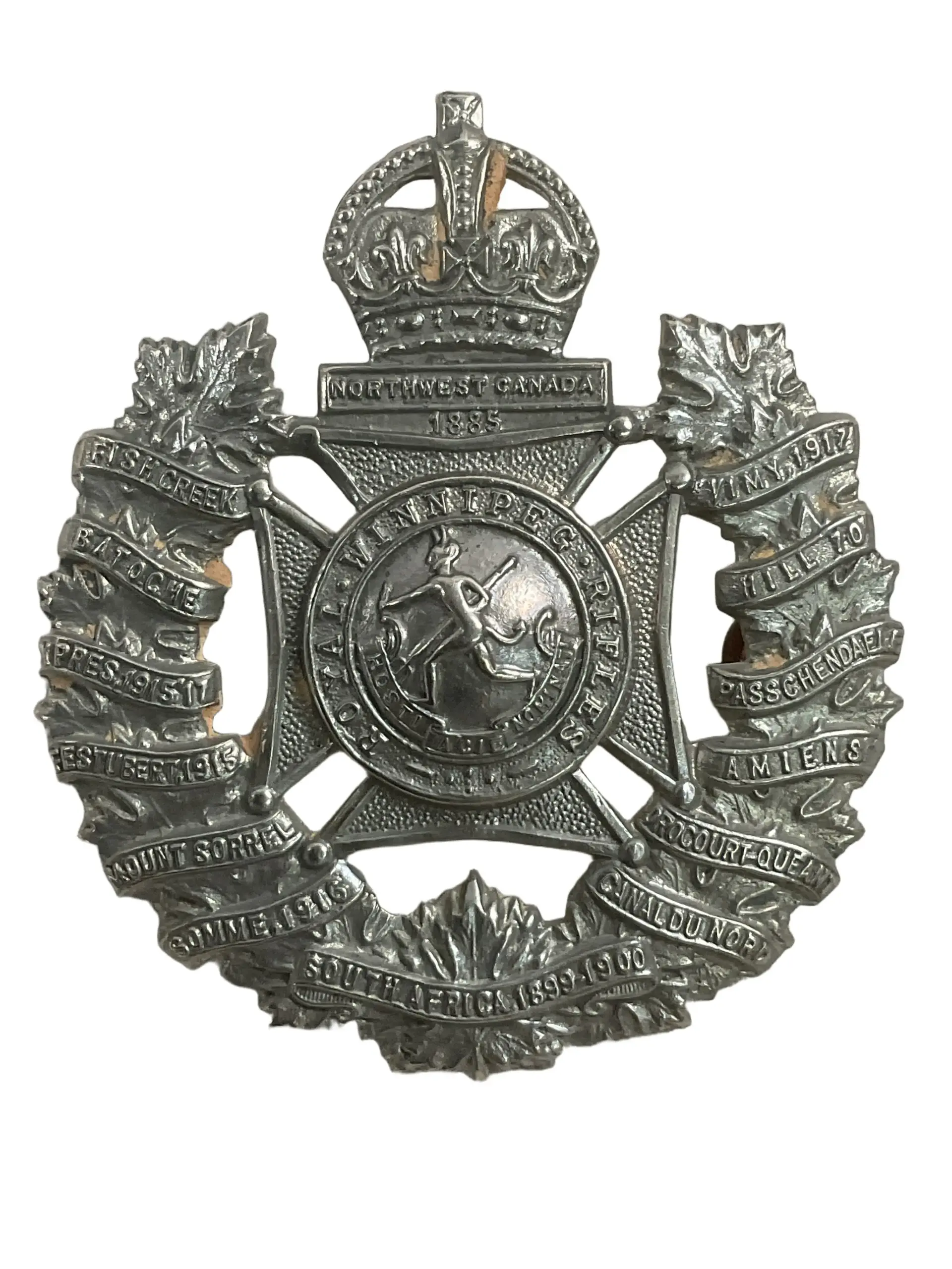 The WW2 Canadian Royal Winnipeg Rifles Cap Badge is an authentic example of military insignia issued to members of the Royal Winnipeg Rifles during the Second World War. This brass badge features a central bugle horn with the regimental motto “Hosti Acie Nominati” on a scroll, surmounted by the royal crown. The design reflects the regiment’s identity and traditions, and would have been worn on the service dress cap by soldiers for identification and esprit de corps. The Royal Winnipeg Rifles, established in 1883, served with distinction in various campaigns, including the Normandy landings and subsequent European operations during World War II. Cap badges such as this one were essential elements of a soldier’s uniform and are notable for their durable materials and fine detailing. Collector interest often centers on unit-specific features, period authenticity, and the badge’s condition. This item represents the historical legacy of the Canadian Army during the mid-20th century.