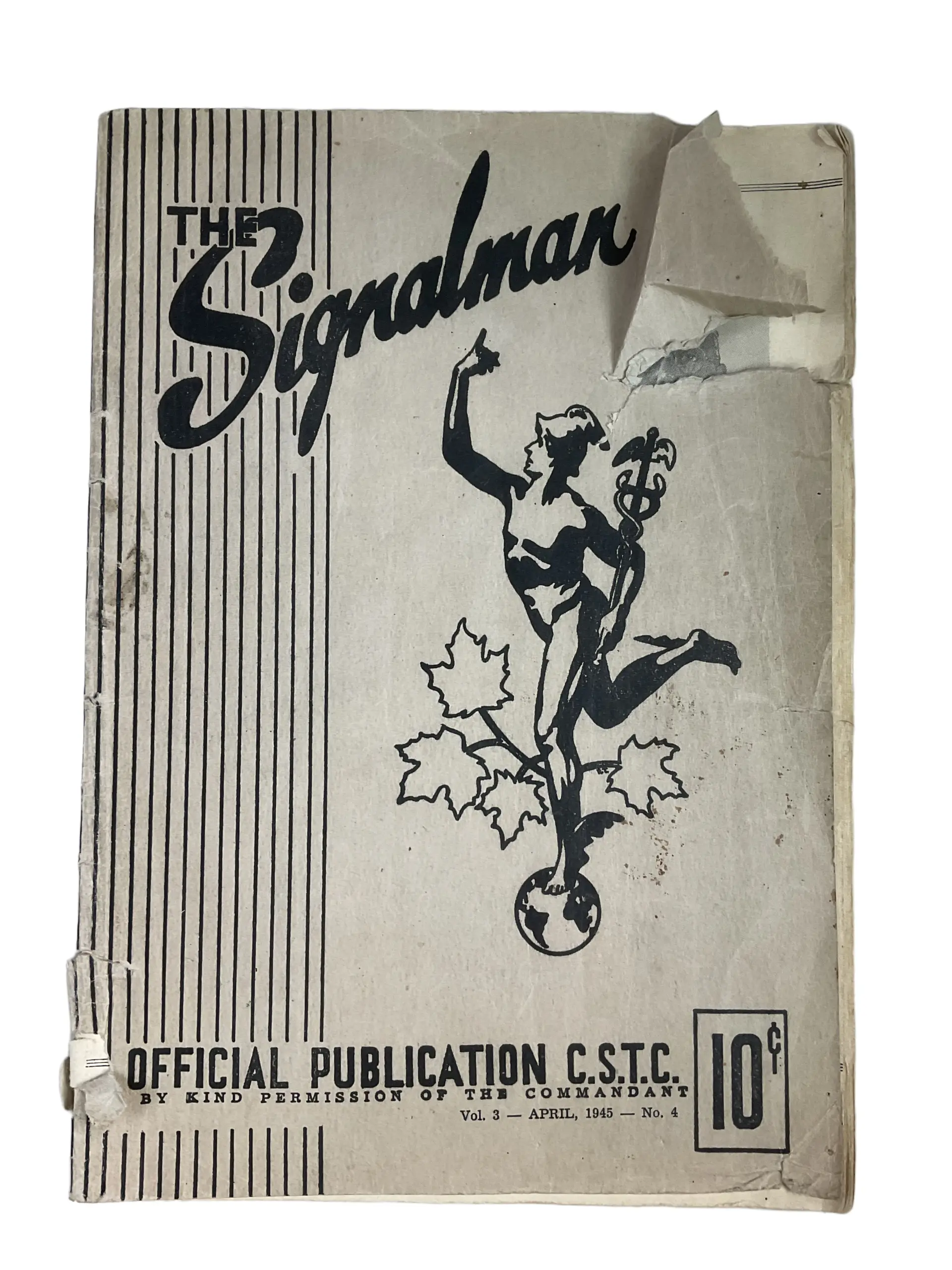 **WW2 Canadian Signalman Magazine Vol 3 No 4 April 1945 Used Softcover Reference Book** This is an original copy of *Signalman*, Volume 3, Number 4, dated April 1945. *Signalman* was an official publication produced for Canadian Army Signals personnel during the Second World War. This softcover periodical includes operational updates, articles pertaining to military communication methods, personnel news, and technical reference material relevant to signal corps activities. The content reflects the evolving role of signals units within the context of late-war operations in Europe and on the home front. As with other issues from this period, it features both photographic and illustrated content and provides insight into the daily life, responsibilities, and technological developments experienced by Canadian signalmen. The magazine is in used condition, consistent with age and handling. This issue serves as a valuable period reference for collectors, researchers, and those studying the Canadian Army’s communications branch during the final months of the Second World War.  Total of approx 50 pages.
