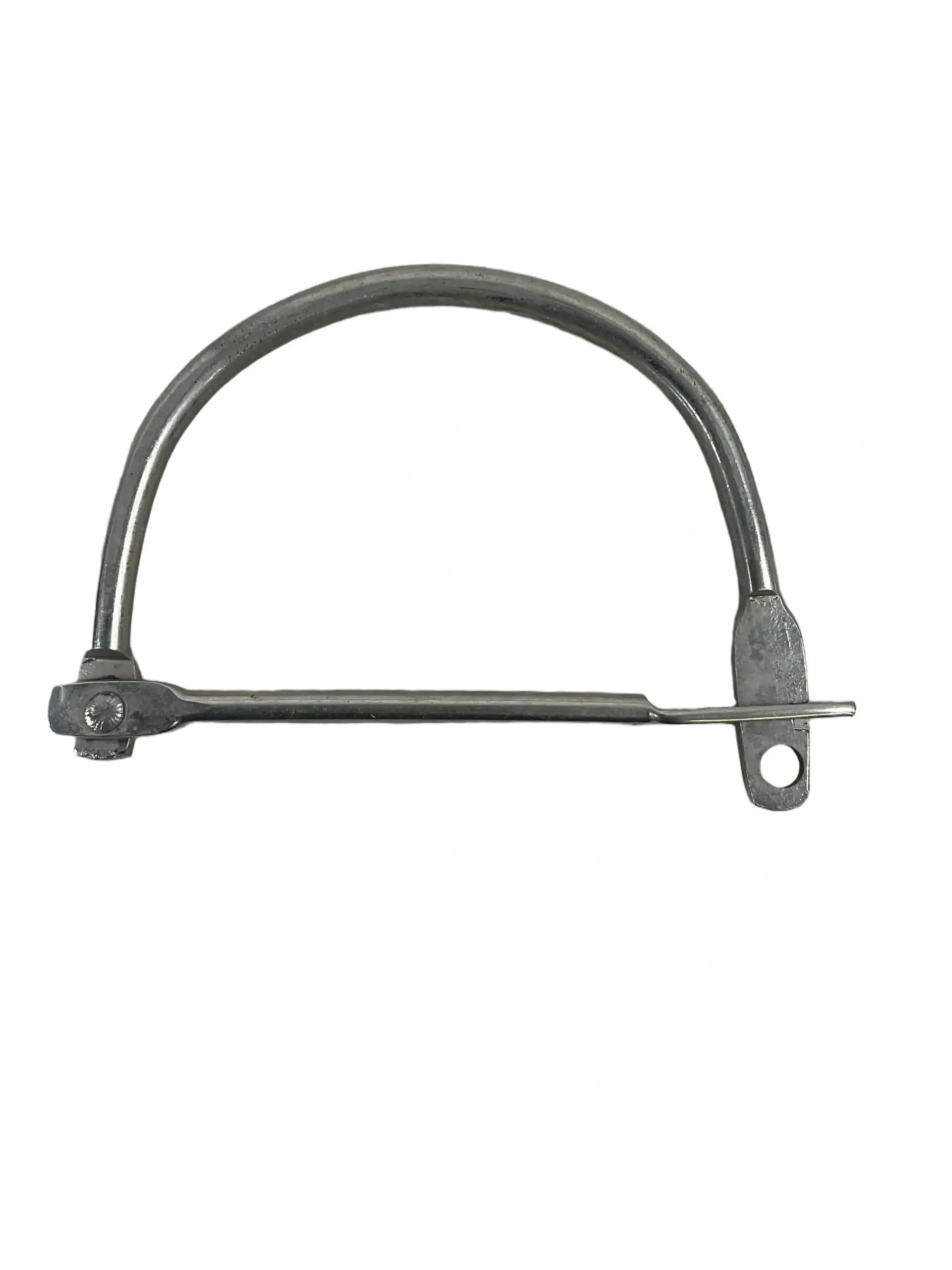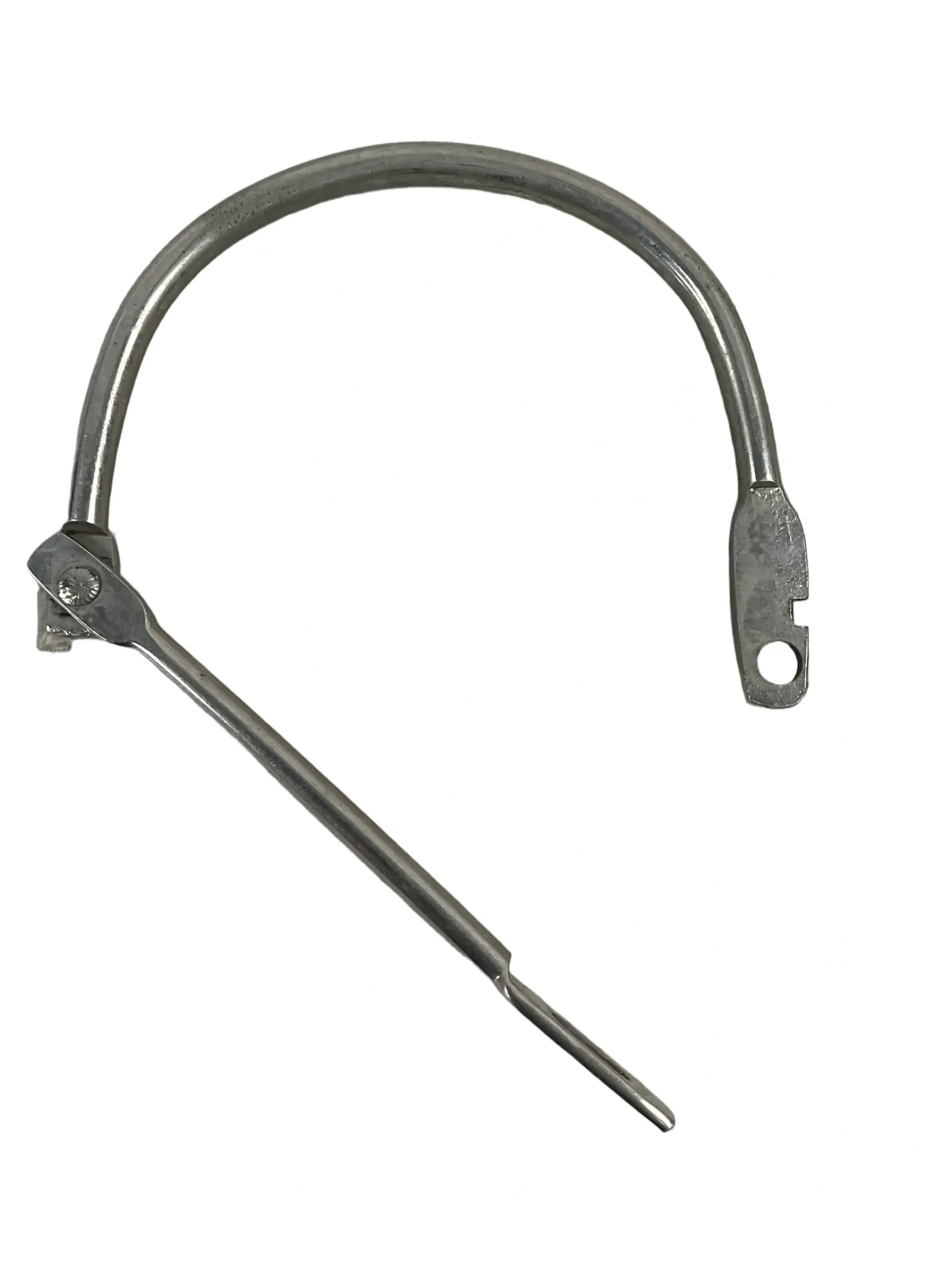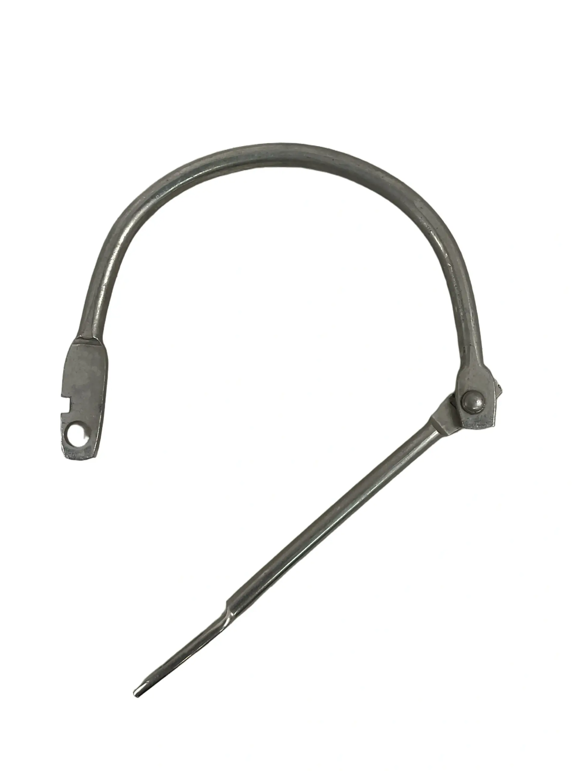 The WW2 Canadian Silver Duffle Bag Handle is an original component utilized in military-issued duffle bags by Canadian forces during the Second World War. Constructed from sturdy metal with a distinctive silver finish, the handle was designed to facilitate easy carrying and secure closure of duffle bags under demanding conditions. Its compact, ergonomic form allowed soldiers to transport personal equipment and supplies efficiently. Typical handles of this type were affixed through reinforced loops or brackets on canvas duffle bags, contributing to the container’s functionality and durability. This handle reflects standard Canadian military equipment specifications of the 1939–1945 period, characterized by robust construction and practical design suited to wartime use. The surface may display signs of wear or patina consistent with age and service. Items such as these are valued for their historical significance and offer a tangible representation of Canadian military logistics and material culture during World War II.