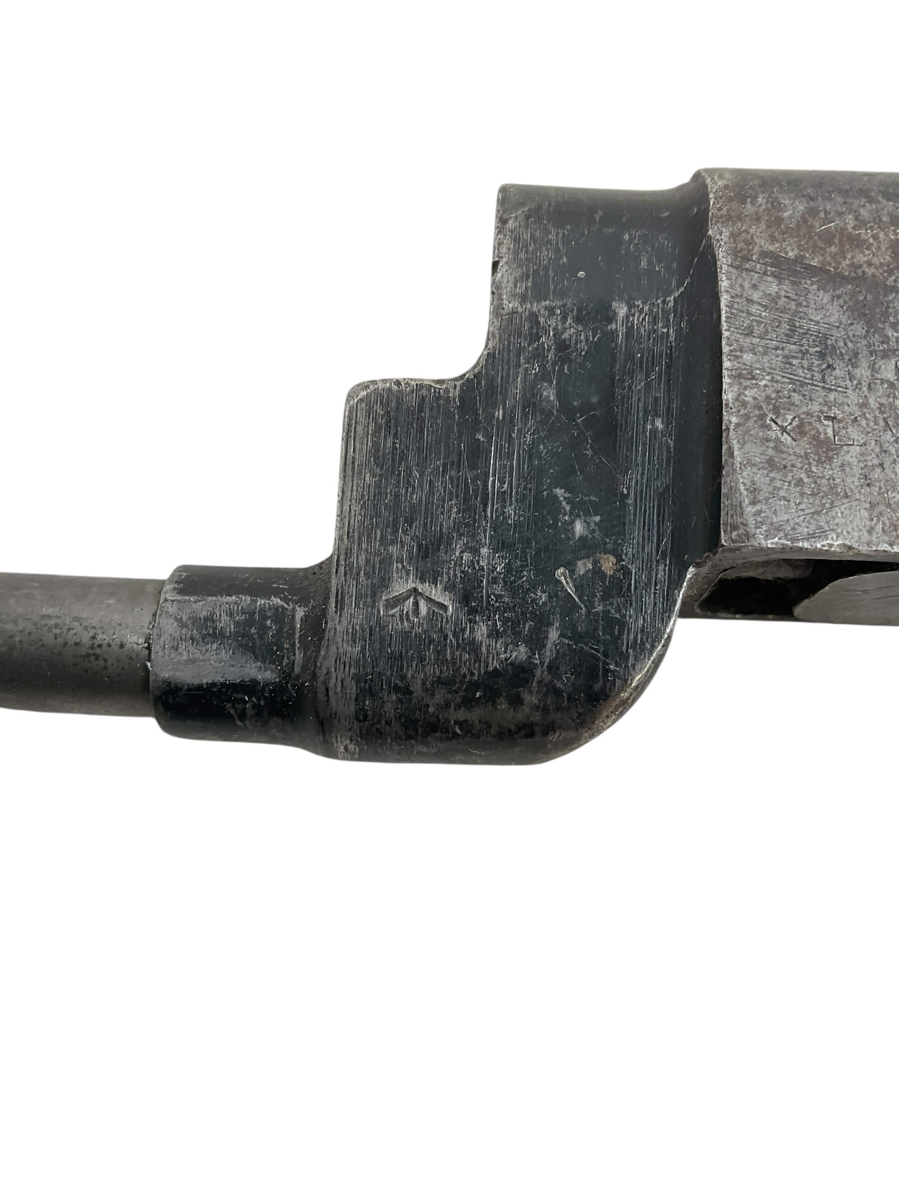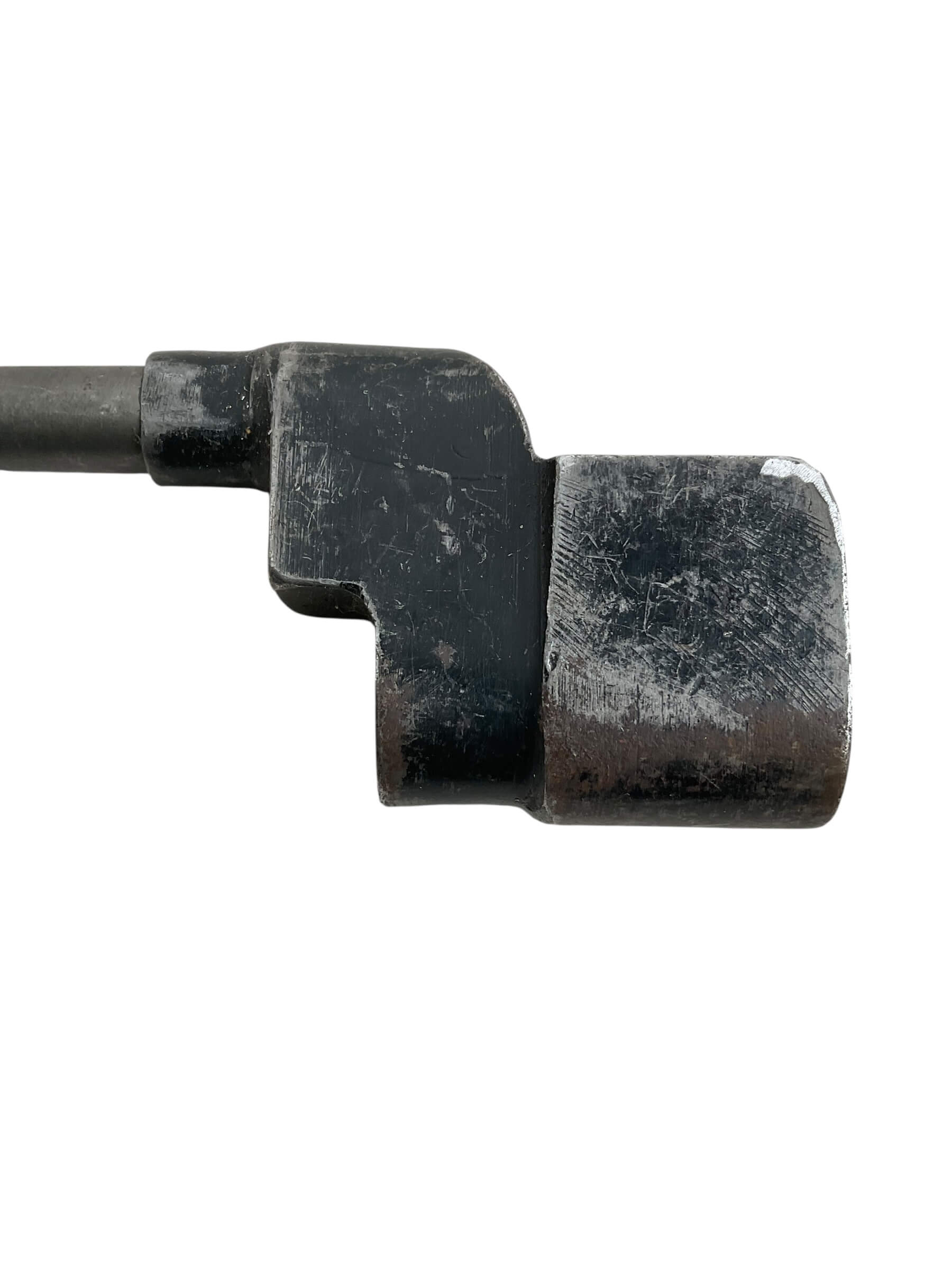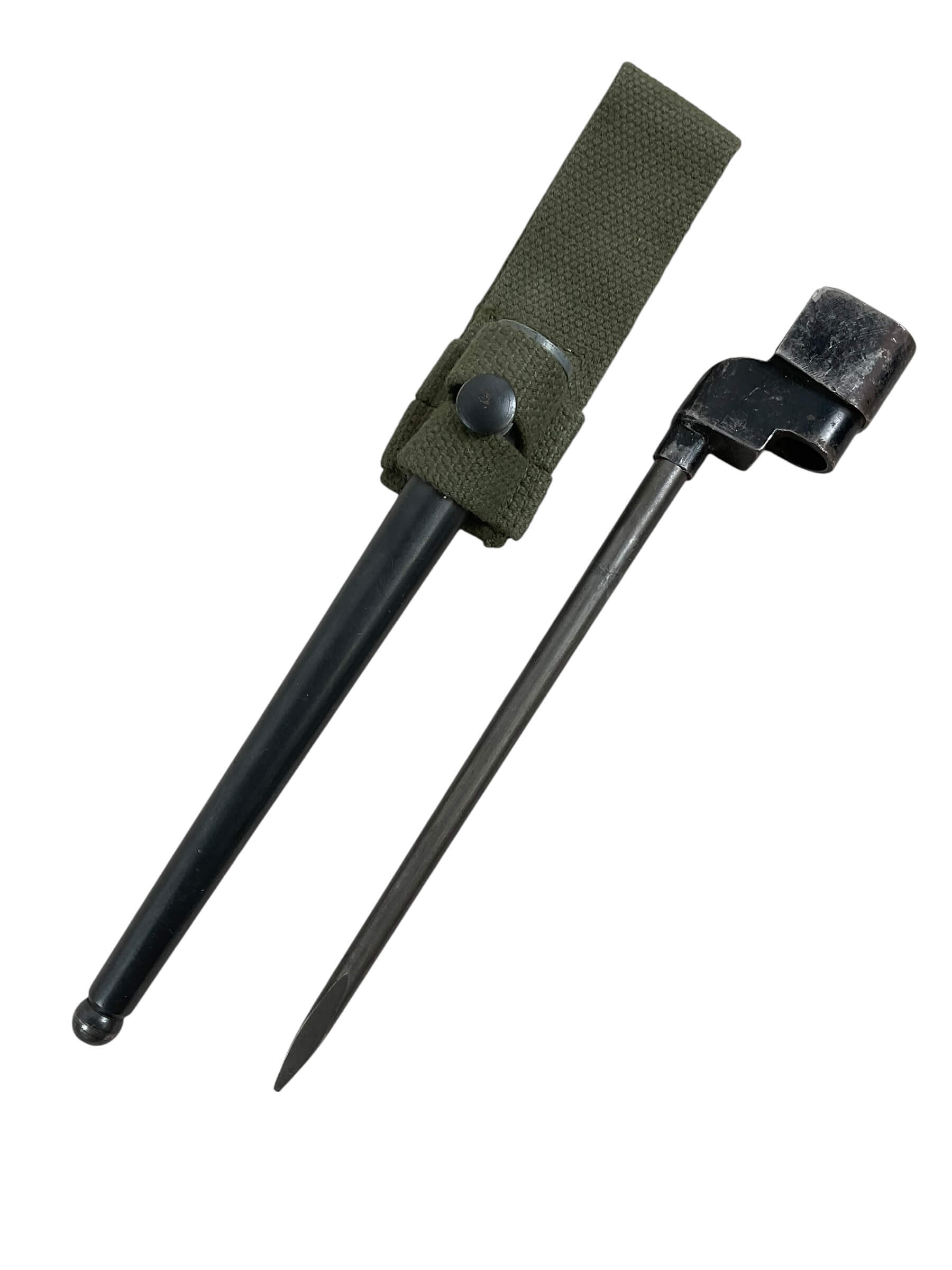 This is a remarkable piece of military history: a WW2 Canadian Spike Bayonet with its original Scabbard and a 1952 dated Frog. The spike bayonet, a crucial weapon for Canadian soldiers during the Second World War, has been preserved in excellent condition, bearing the marks and patina that attest to its authenticity and historical value. Its accompanying scabbard, designed to protect and carry the bayonet, is equally authentic and original. The set also includes a 1952 dated Frog, a device used to attach the scabbard to a belt, adding to its historical value and appeal. This trio of items is a significant artifact from a pivotal era and would be a prized addition to any military memorabilia collection. It not only stands as a testament to Canadian contributions to the war effort but also showcases the functionality and design of military equipment.