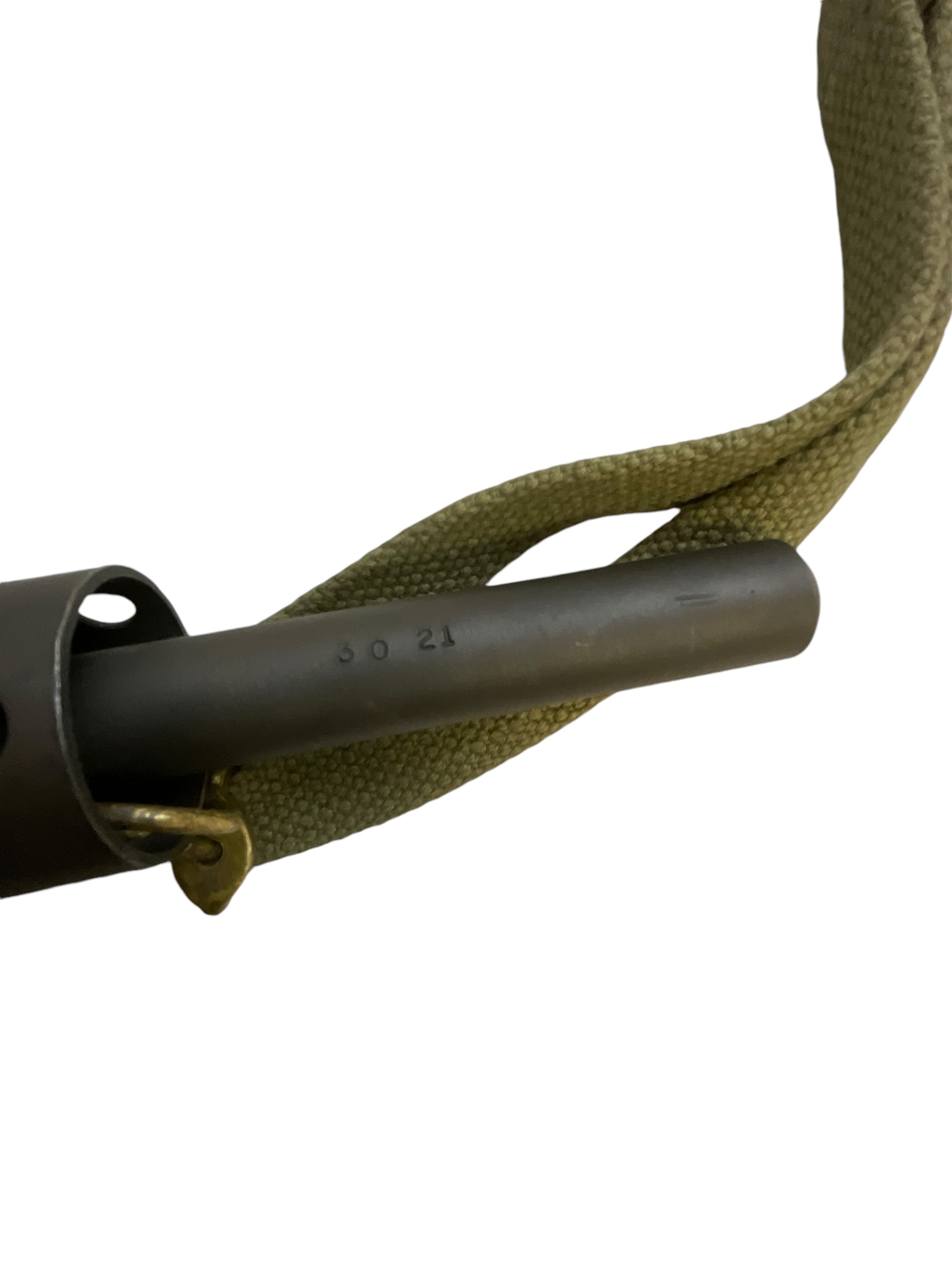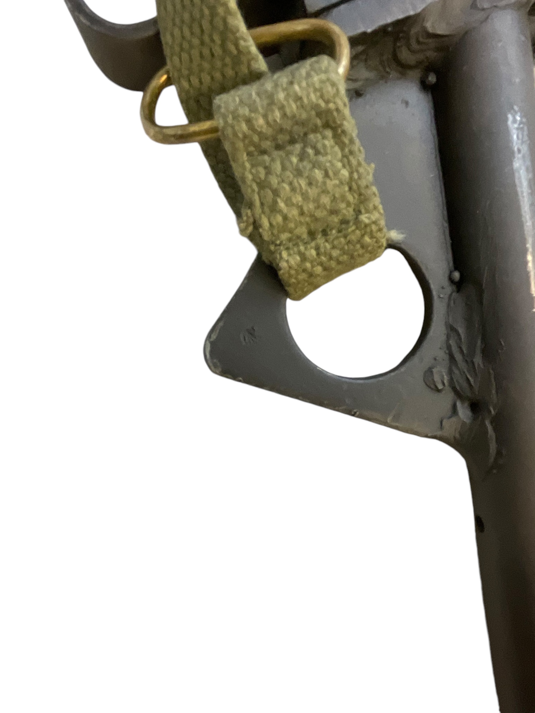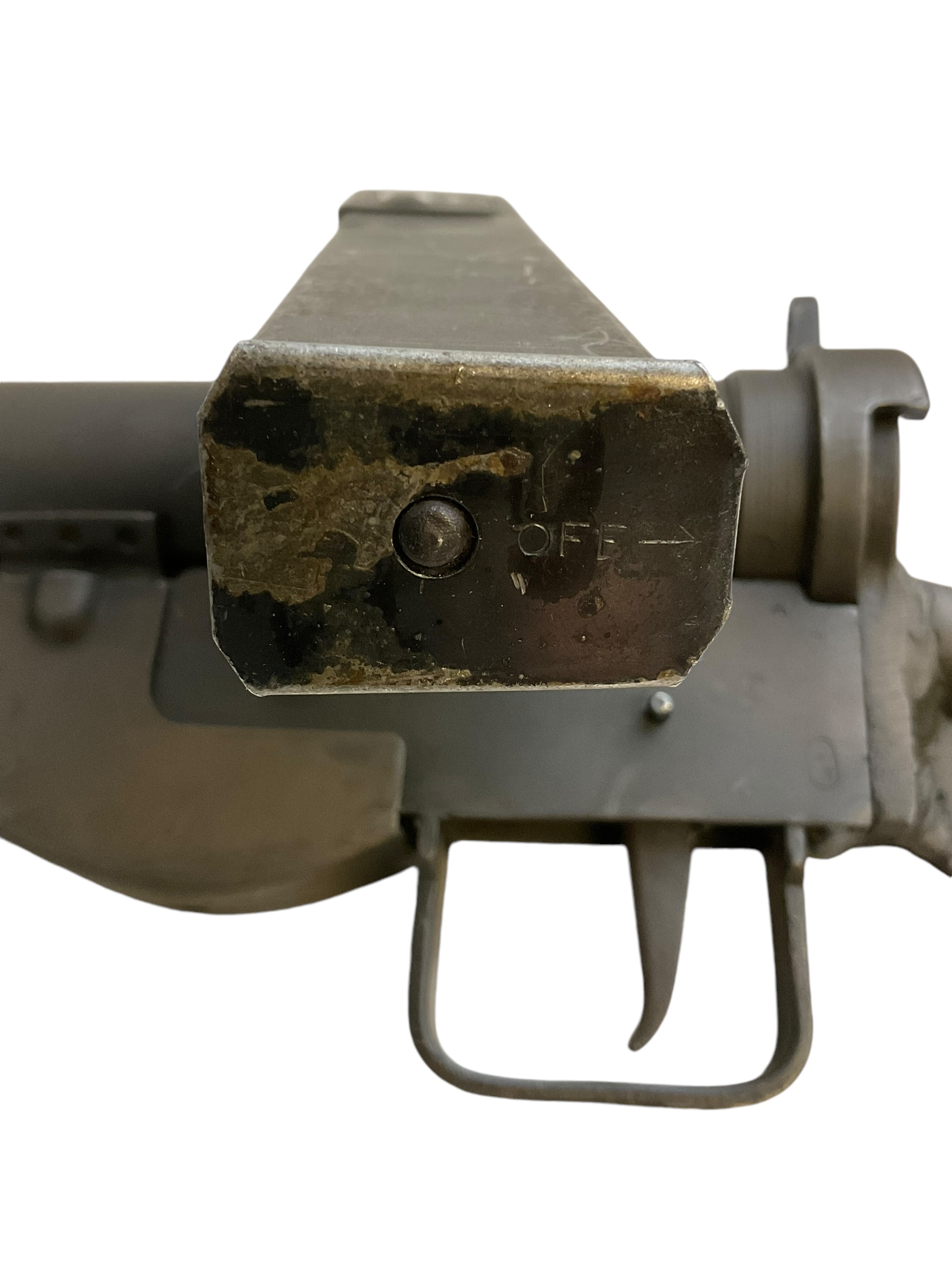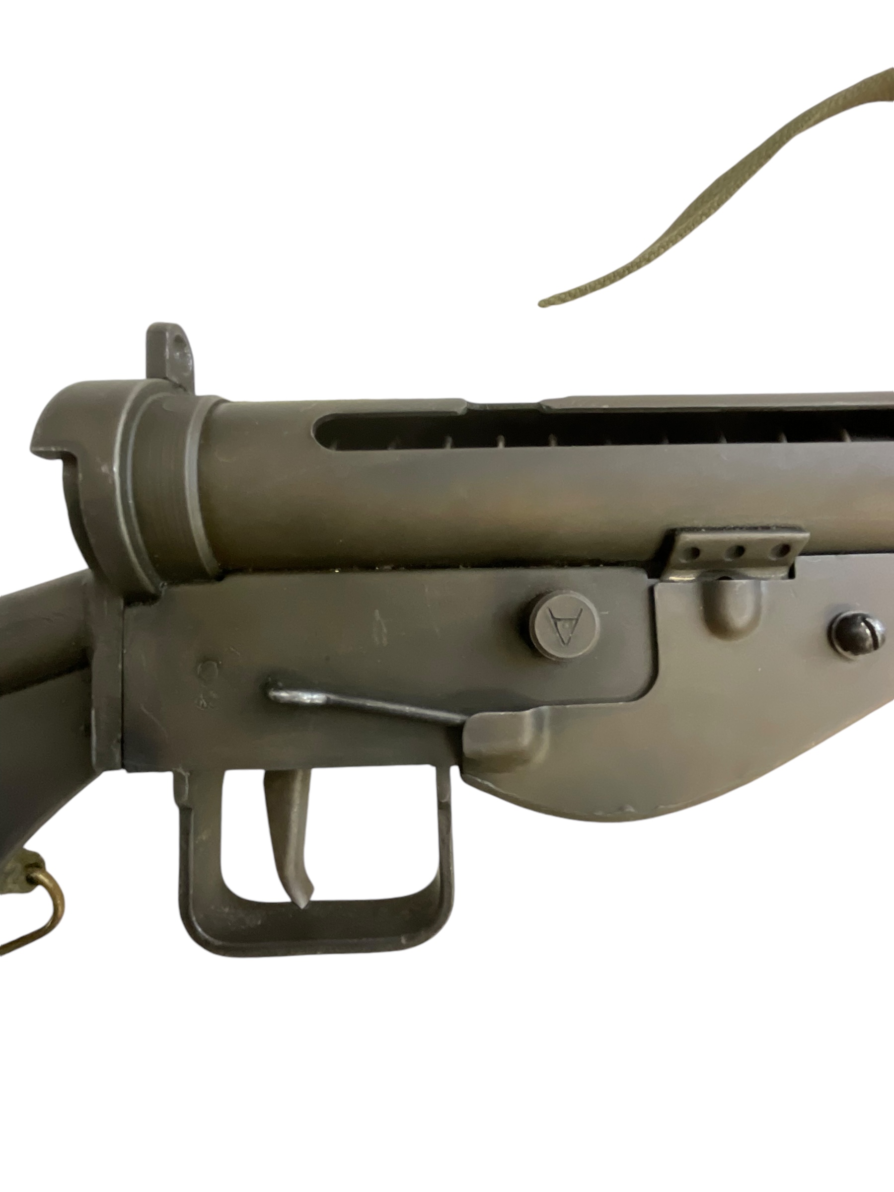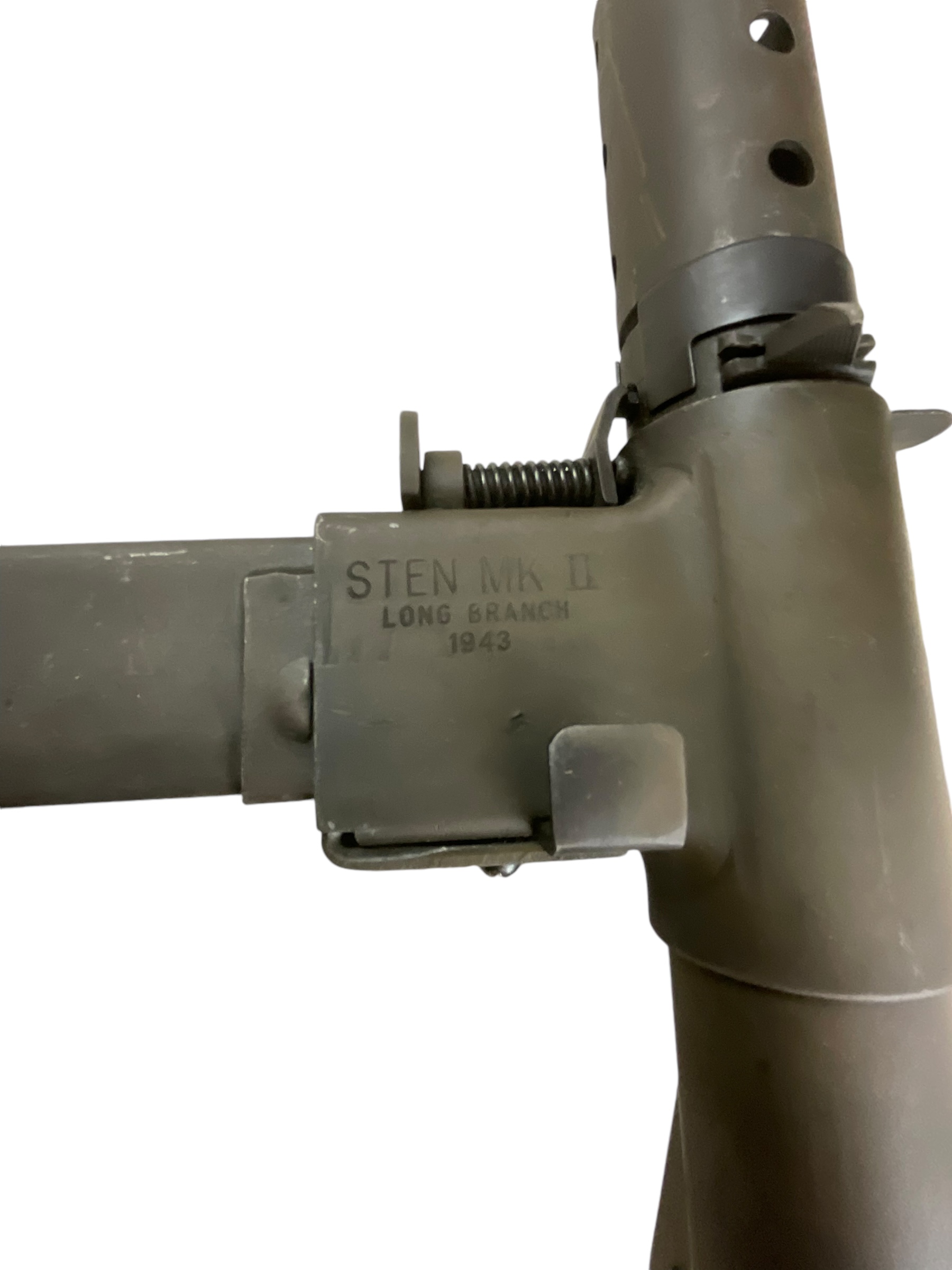 The WW2 Canadian Sten Gun Long Branch 1943 Dated DEWAT is a notable piece of military and Canadian history. Manufactured during the height of the Second World War in 1943 by the Long Branch Arsenal in Long Branch, Ontario, this Sten Gun was a pivotal weapon used by Canadian troops. The Sten Gun is a British 9mm submachine gun known for its simple design and effective combat performance. DEWAT, an acronym for ‘Deactivated War Trophy,’ signifies that this gun has been rendered incapable of firing for safe collection and display purposes. This piece retains its original markings and shows the patina of time, making it an attractive addition to any military memorabilia collection.