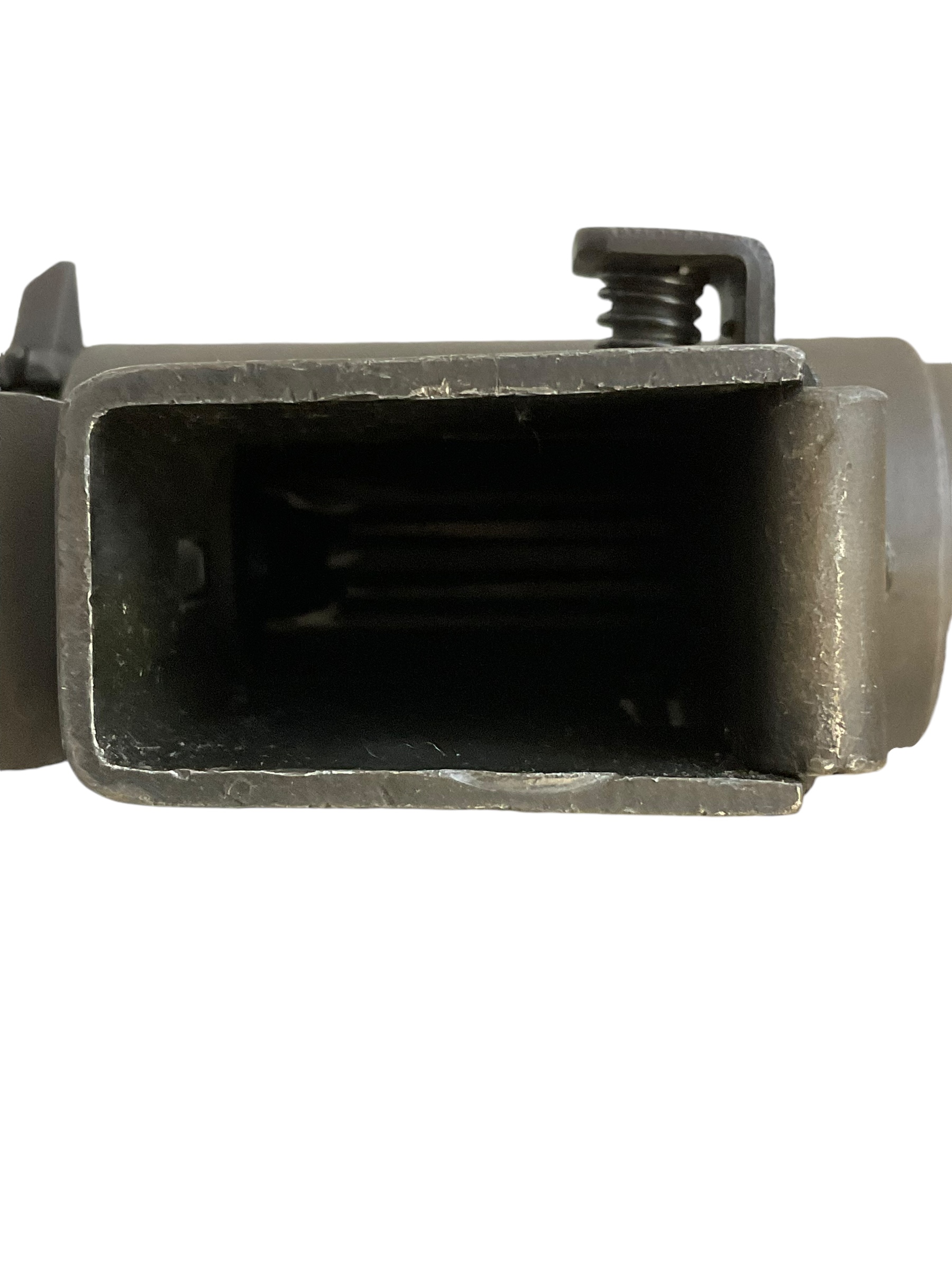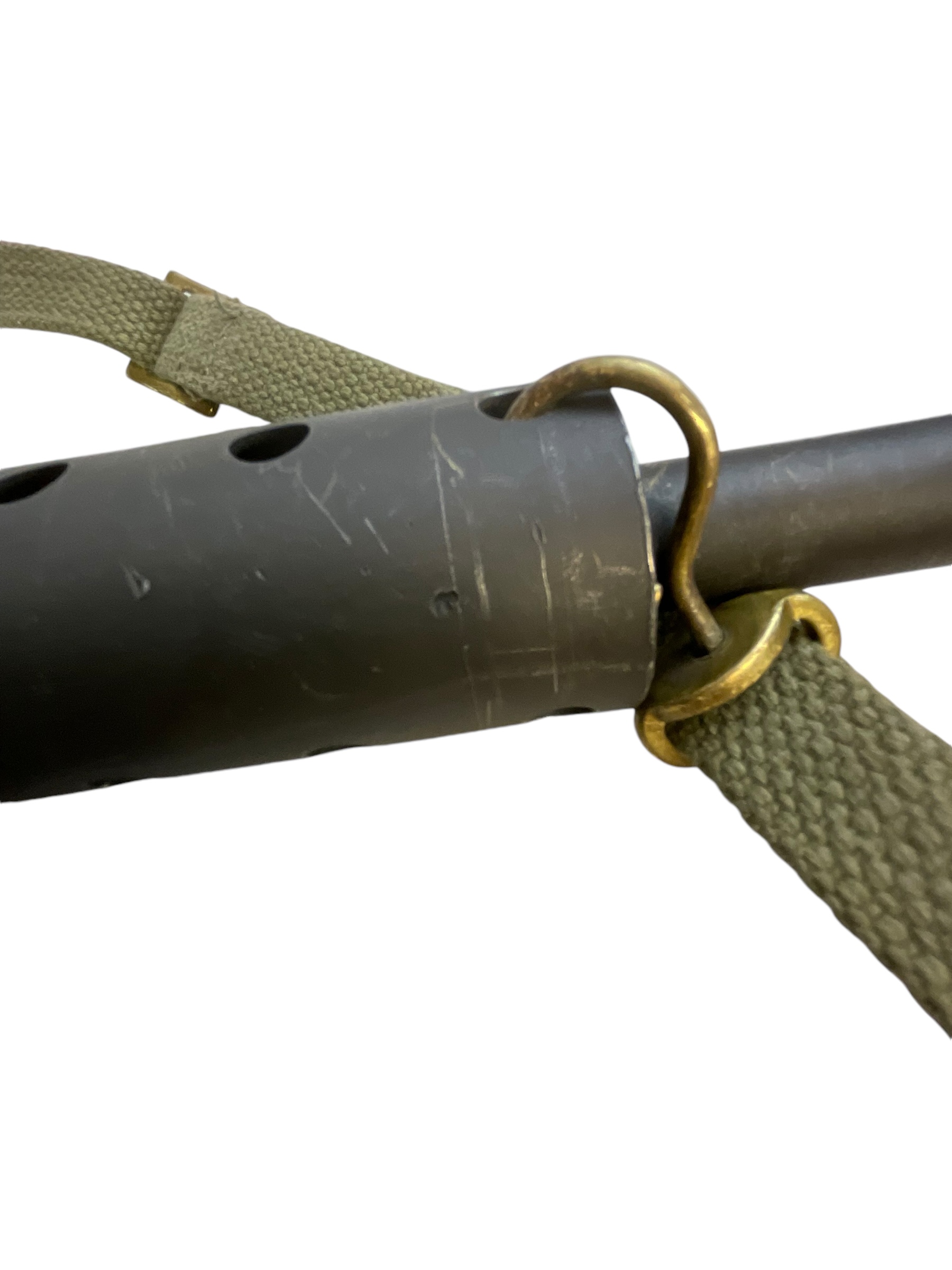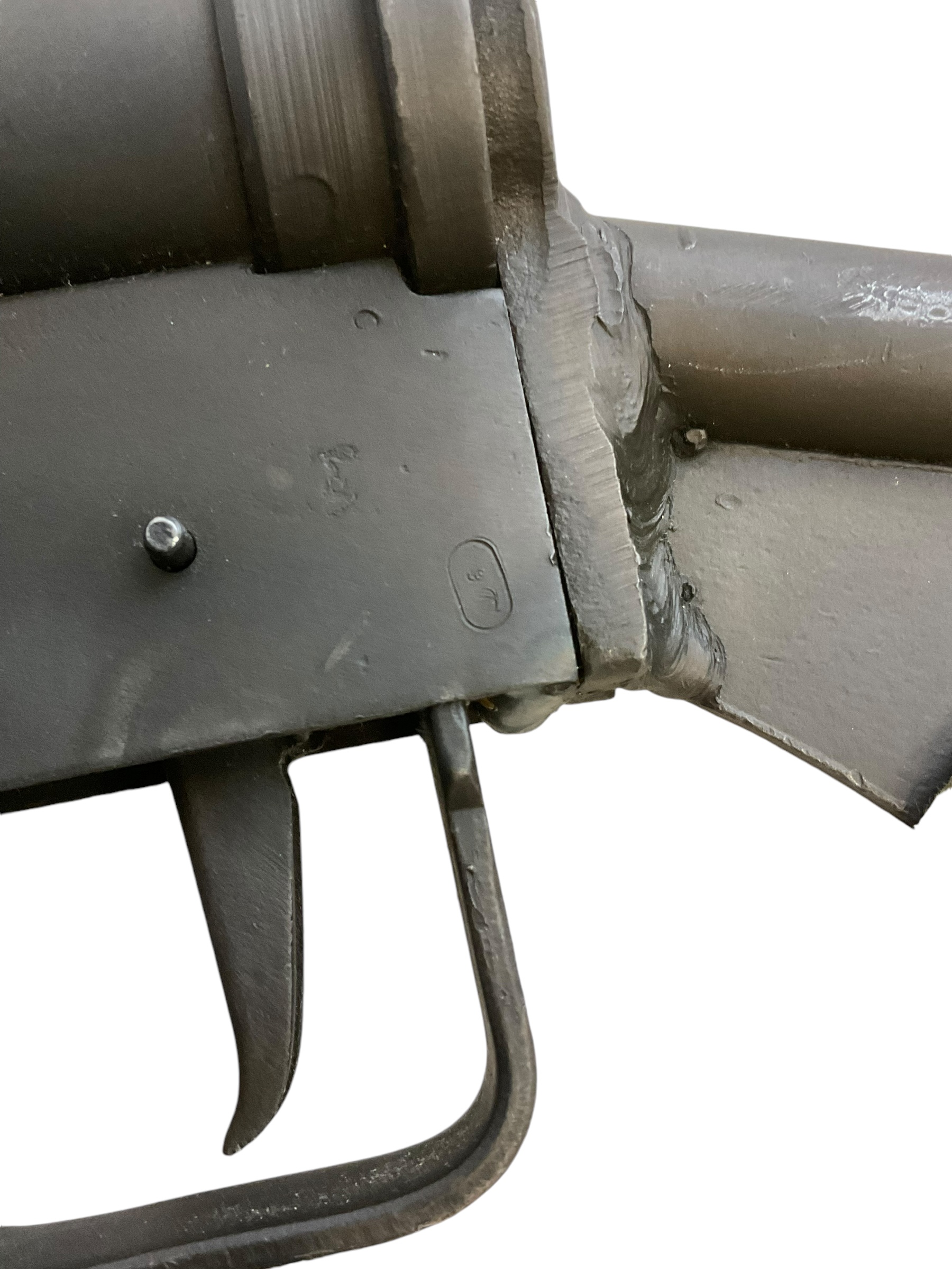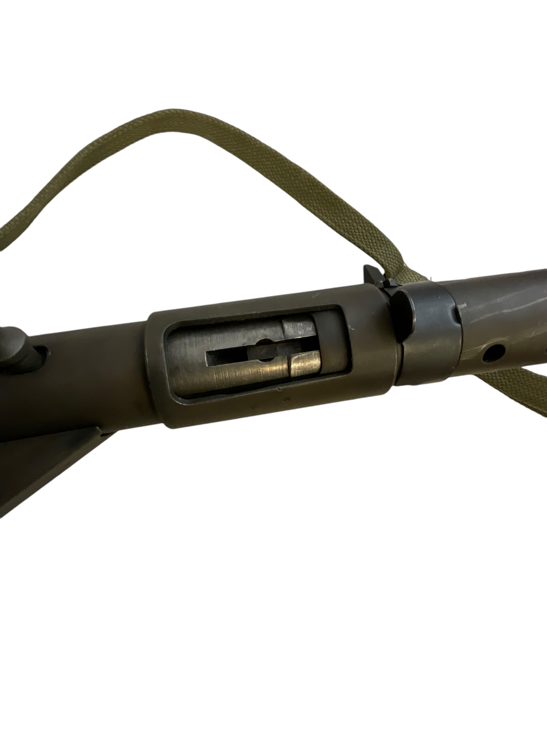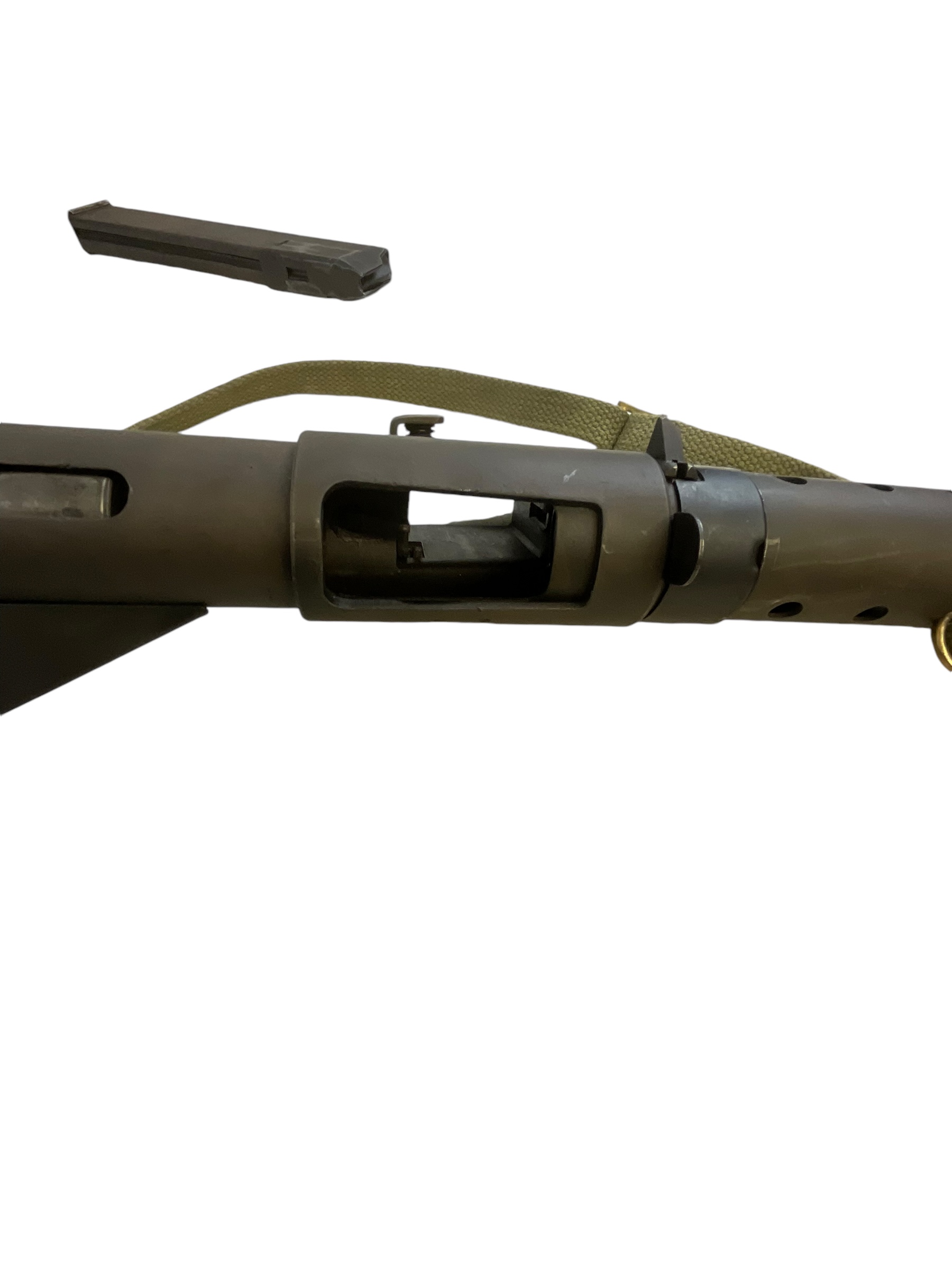 The WW2 Canadian Sten Gun Long Branch 1943 Dated DEWAT is a notable piece of military and Canadian history. Manufactured during the height of the Second World War in 1943 by the Long Branch Arsenal in Long Branch, Ontario, this Sten Gun was a pivotal weapon used by Canadian troops. The Sten Gun is a British 9mm submachine gun known for its simple design and effective combat performance. DEWAT, an acronym for ‘Deactivated War Trophy,’ signifies that this gun has been rendered incapable of firing for safe collection and display purposes. This piece retains its original markings and shows the patina of time, making it an attractive addition to any military memorabilia collection.