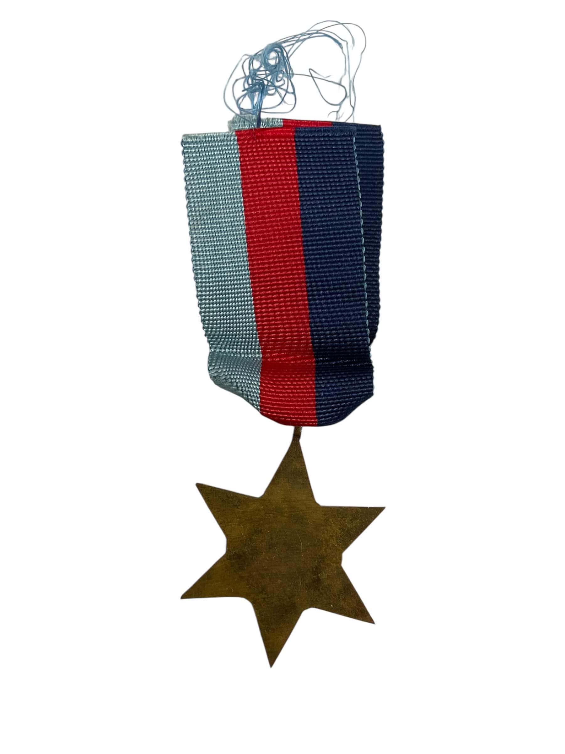The 1939 to 1945 Star is a military campaign medal awarded to personnel of the British Commonwealth, including Canadian forces, for operational service during the Second World War. Instituted in July 1945, the medal recognizes a minimum of six months of service between 3 September 1939 and 2 September 1945 in operational areas. The full-size medal features a six-pointed star made of yellow copper zinc alloy. The obverse displays the Royal Cipher “GRI VI” (for King George VI) surmounted by a crown and encircled by the inscription “THE 1939-1945 STAR.” The reverse is plain. The ribbon, 32mm wide, is colored with dark blue, red, and light blue stripes, representing the Royal Navy, Army, and Royal Air Force respectively. This medal represents significant service during the entirety of the Second World War and is an important item for Canadian military history collections.