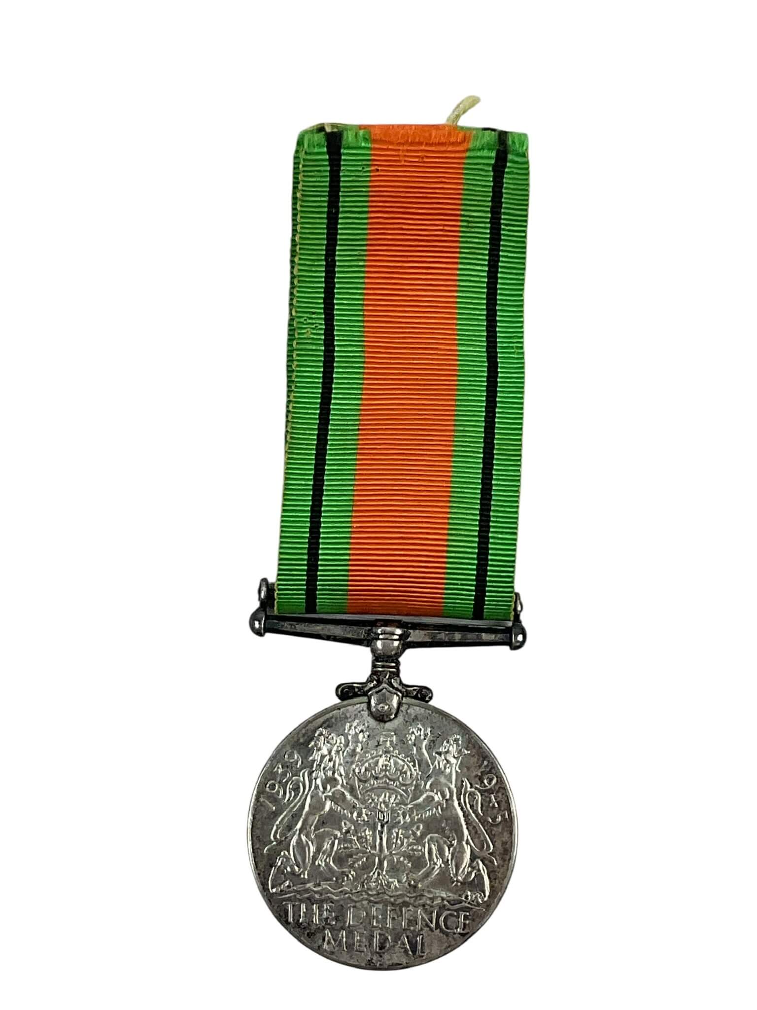 The Defence Medal 1939-1945 is a full-size campaign medal issued by the United Kingdom and Commonwealth countries, including Canada, to recognize service during the Second World War. Authorized in 1945, the medal was awarded to military and certain civilian personnel who served in non-operational zones subjected to air attack or closely threatened from 3 September 1939 to 2 September 1945. The medal is circular, struck in cupro-nickel, and measures 36 millimeters in diameter. The obverse features the crowned effigy of King George VI, while the reverse displays two lions flanking an oak sapling, symbolizing resilience. The ribbon comprises a green stripe representing the green fields of England, flanked by narrow black stripes for the blackout and broad orange stripes symbolizing firebombing raids. This medal was commonly awarded to members of the Canadian armed forces and select civilian organizations who contributed to home defense during the war.