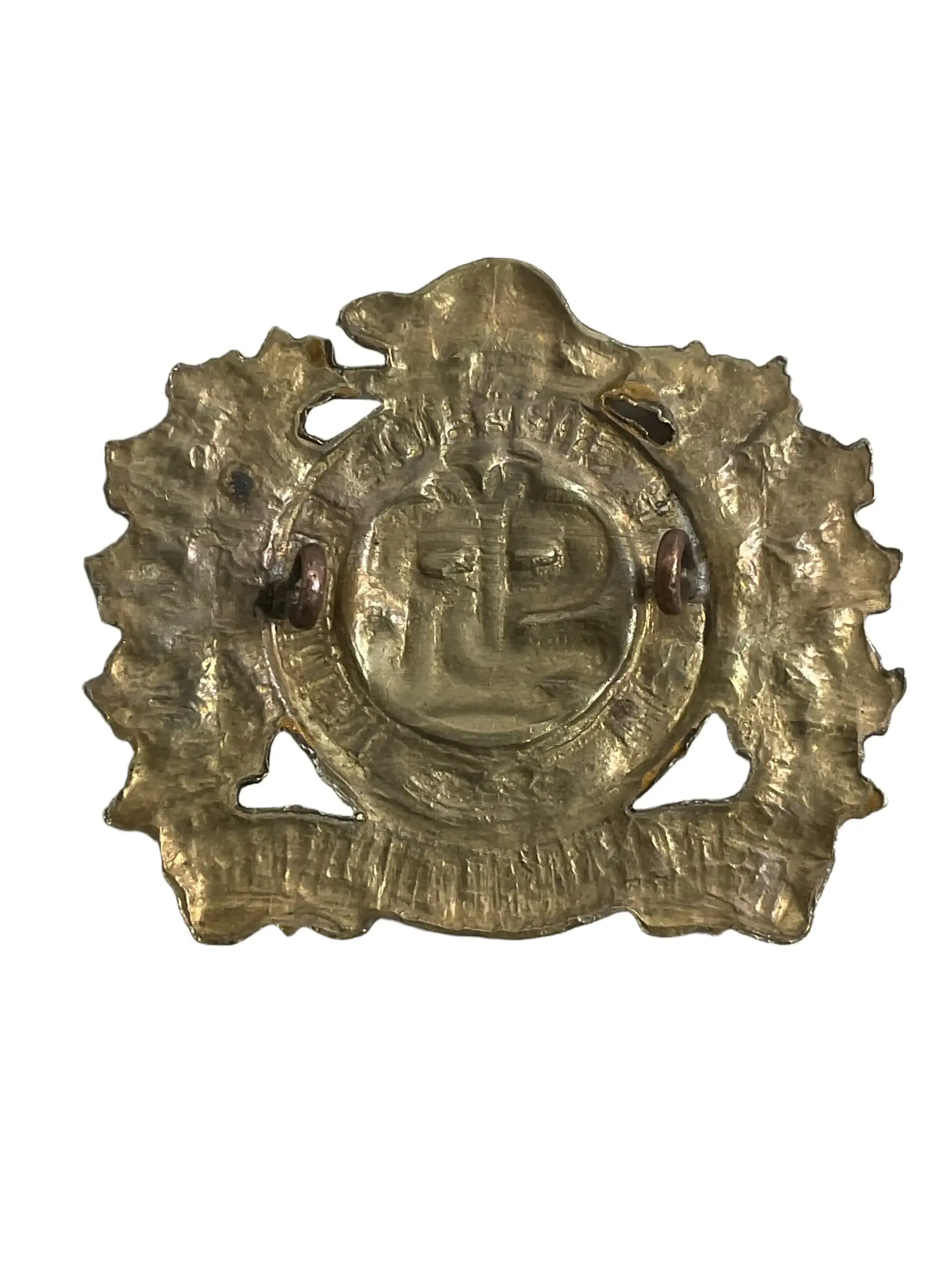 The WW2 Canadian The Lake Superior Regiment Cap Badge is an original military insignia issued to members of the Lake Superior Regiment during the Second World War. The badge is designed in brass and features the regiment’s distinctive emblem, which typically includes a central shield, crossed rifles, and the unit’s name. Worn on the service dress cap, it served to identify regimental affiliation and foster unit cohesion among Canadian Army personnel. The Lake Superior Regiment was mobilized for active service in 1940 and participated in key operations in Northwest Europe as part of the 4th Canadian (Armoured) Division. The cap badge reflects the regiment’s heritage and role within the Canadian Expeditionary Force. Measuring approximately 45 mm by 40 mm, the badge includes lugs or slider fittings on the reverse for attachment to headgear. This item is relevant for collectors and historians interested in Canadian military insignia and the history of the Lake Superior Regiment during World War II.