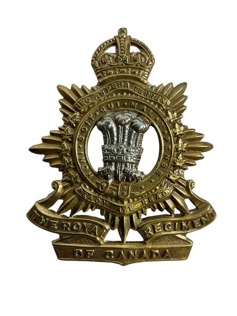 The WW2 Canadian The Royal Regiment of Canada Cap Badge is a rare and significant piece of military history. This authentic artifact symbolizes the bravery and dedication of soldiers who served in Canada’s largest infantry regiment during the World War II era. The badge features the regiment’s distinctive emblem, a star of St. George enclosed in a circle with the Latin motto ‘Pro Patria’ – meaning ‘For Country’. Crafted with exceptional detail, this cap badge is made of brass, a common material used during this period due to its durability. As a collectible, it holds immense historical value for both military enthusiasts and historians. This cap badge is not only a testament to Canada’s rich military heritage, but also a tribute to the courage of those who served in The Royal Regiment of Canada during a pivotal time in world history.