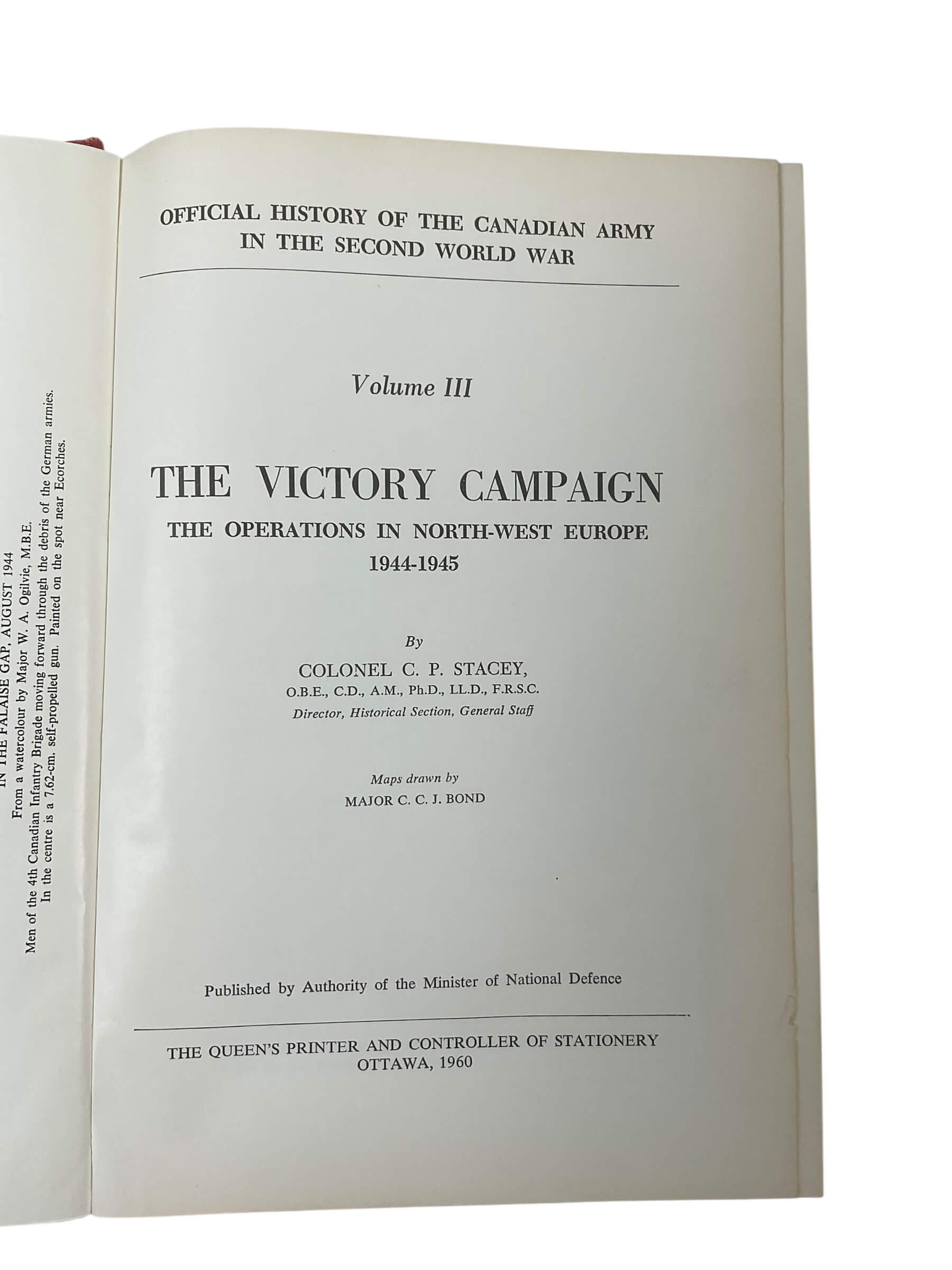 **WW2 Canadian The Victory Campaign Operation in North-West Europe Vol 3 Used Hardcover Reference Book** This hardcover reference book, titled “The Victory Campaign: Operations in North-West Europe Vol 3,” is a comprehensive historical account published as part of the official Canadian Army history series. The volume covers the final phase of World War II in Europe, focusing on Canadian military operations from the Normandy breakout to the end of hostilities in north-west Europe. Detailed analyses of strategic planning, battle progressions, and troop movements are provided, supplemented by maps, photographs, and appendices with official documents. The book offers factual information on significant actions involving Canadian forces, including key engagements, logistical considerations, and the broader context of Allied operations. As a used hardcover edition, it is intended for researchers, collectors, and those interested in military history with particular emphasis on Canadian participation in the European theatre during WWII. This reference is considered an authoritative source for Canadian military campaigns of the era.  Total of 770 pages.
