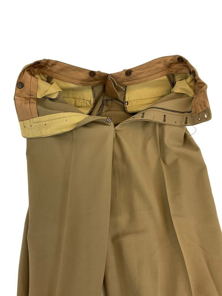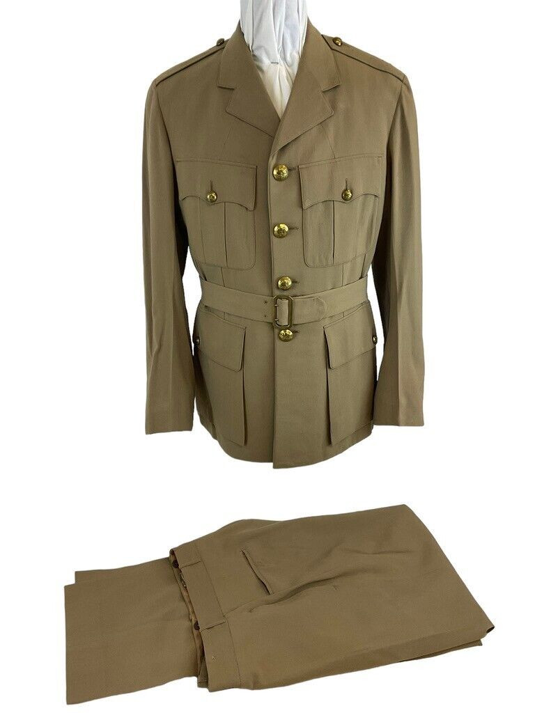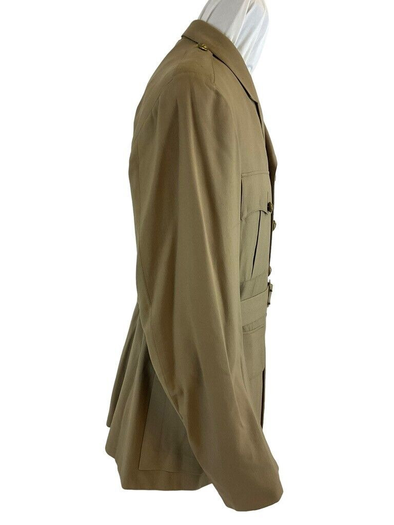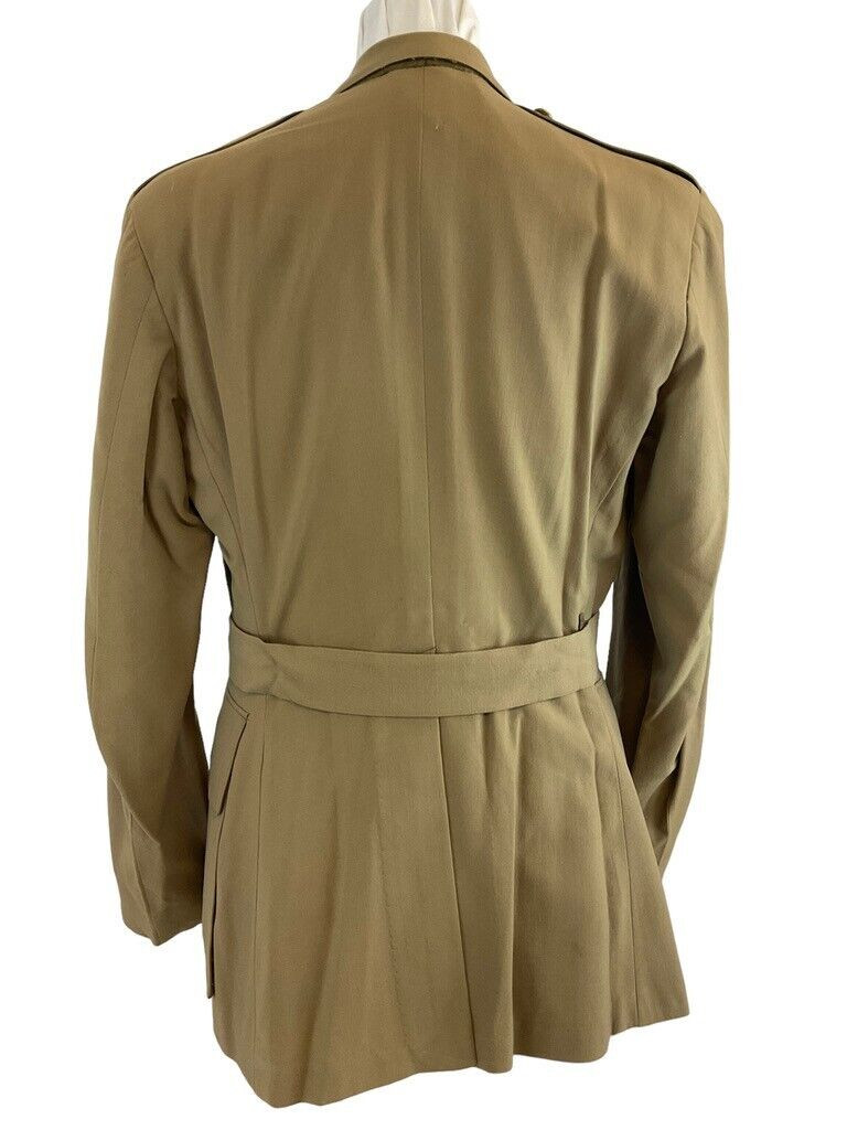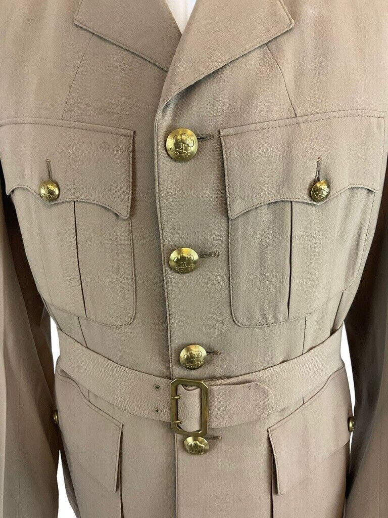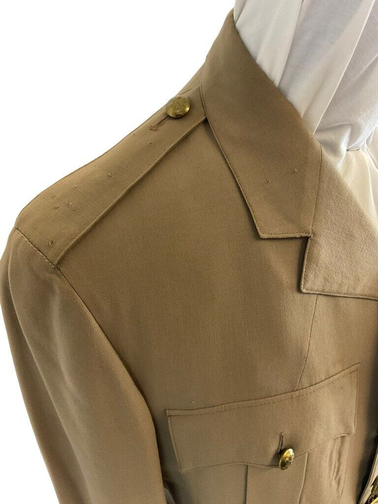 This WW2 Canadian University of Toronto COTC Tropical Worsted Service Dress and Pants set is a remarkable artifact from the era of World War II, reflecting the commitment and discipline of the Canadian Officer Training Corps (COTC). Meticulously tailored from tropical worsted wool, the ensemble is designed for warmer climates, ensuring comfort and breathability while maintaining a sharp, professional appearance. The service dress features traditional military styling, including brass buttons, epaulettes, and insignias identifying its University of Toronto origins. The coordinated pants complement the jacket perfectly, showcasing the same high-quality construction. This uniform set not only represents a significant period in Canadian military history but also highlights the role of academic institutions like the University of Toronto in supporting the war effort through the training and preparation of officers. Collectors and historians alike will find this piece an invaluable addition to any collection of military memorabilia.
