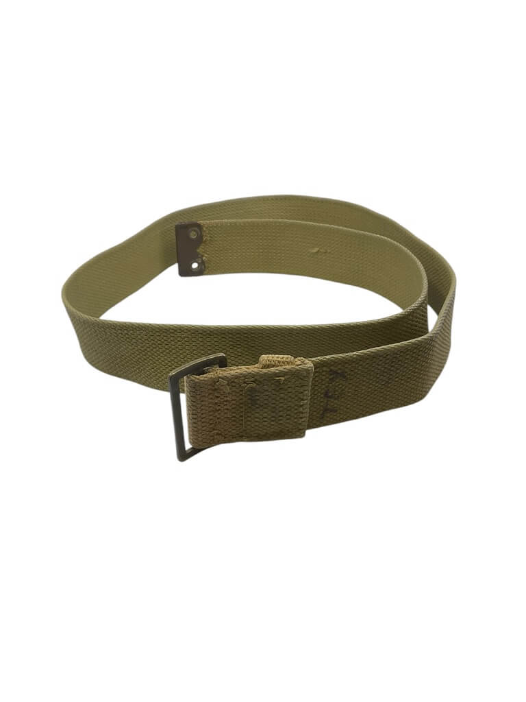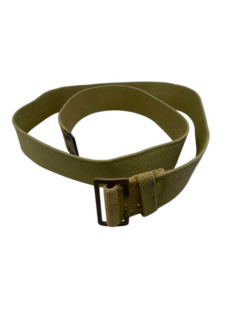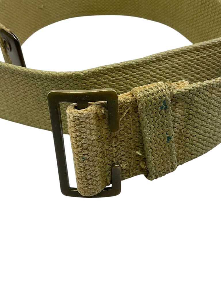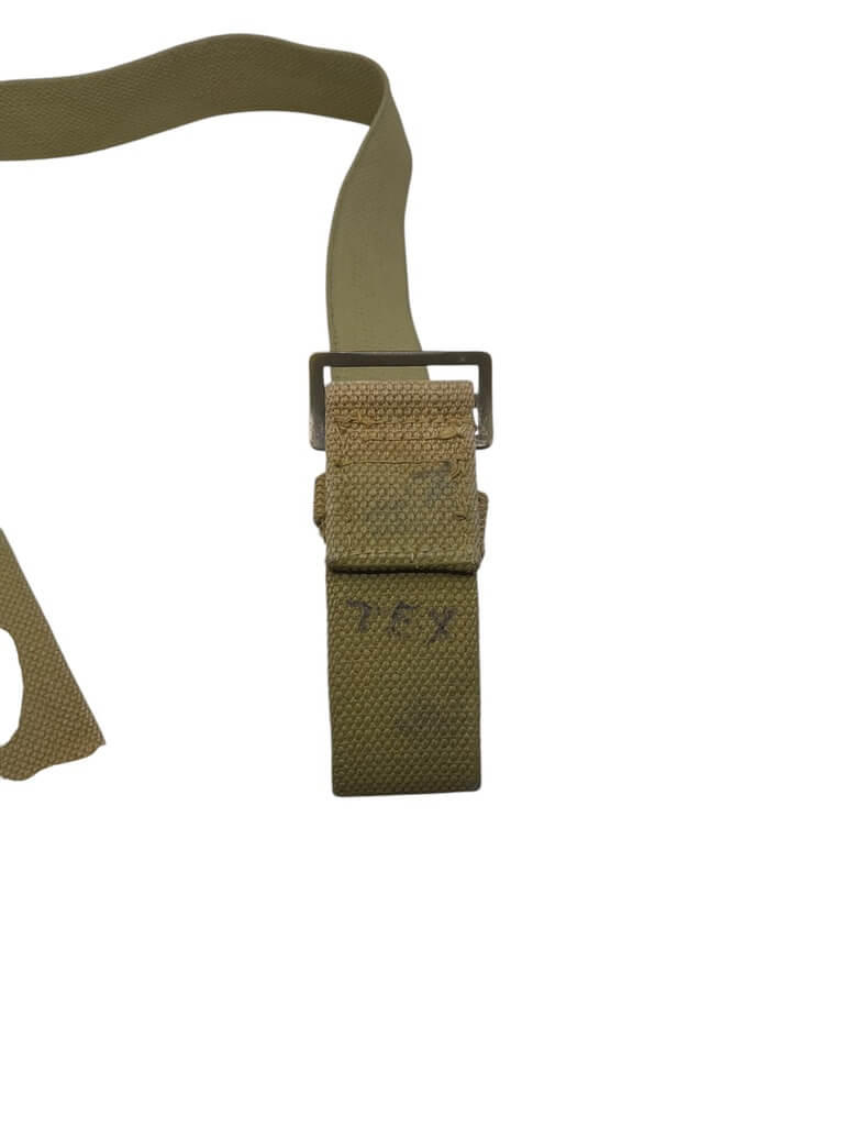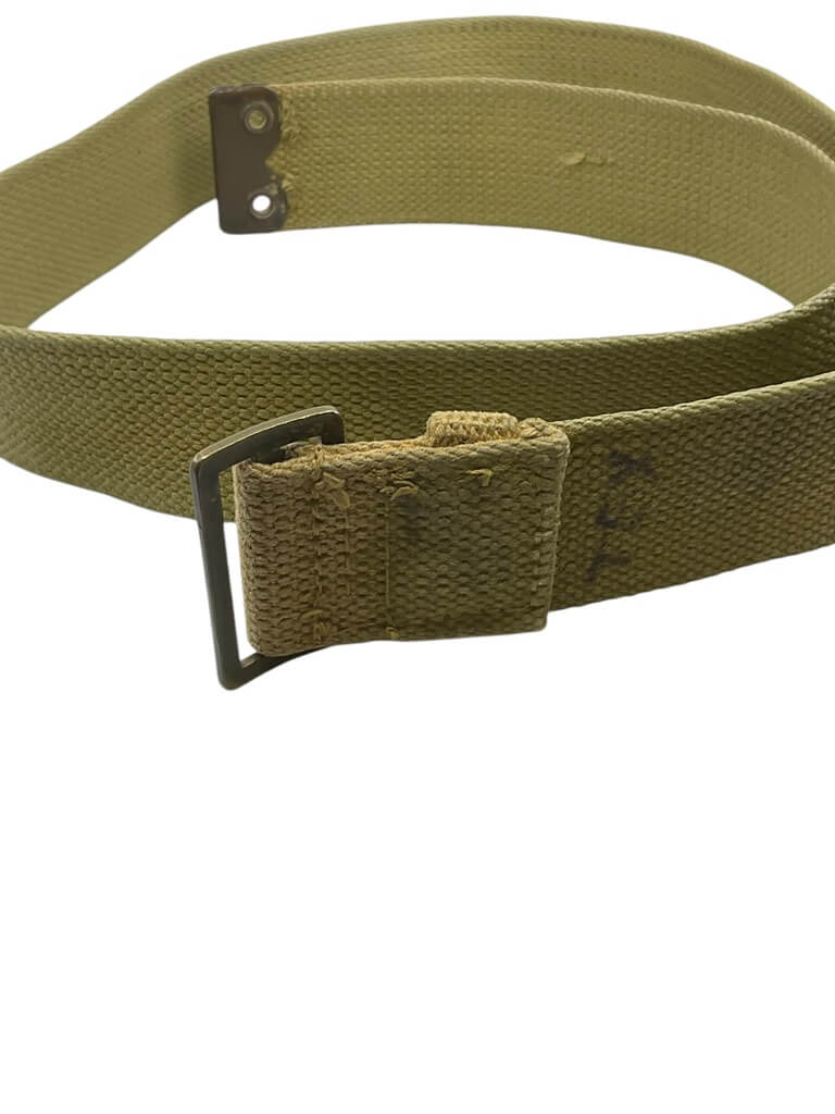 This WW2 Canadian Web Belt Size Medium Blancoed is a remarkable piece of war memorabilia. It is an authentic, military-issued belt used by Canadian soldiers during the Second World War. The belt, made of sturdy, woven webbing, exhibits the robustness required in the battlefield. It has been blancoed, a process of whitening or cleaning to maintain the belt’s appearance. The medium size ensures it fits most individuals comfortably. This belt features the classic metal buckle, which is adjustable for an ideal fit. It carries significant historical value and is an exceptional addition to any military collection. Despite its age, it remains in good condition, testament to its durability. It serves as a poignant reminder of the sacrifices made by the brave soldiers in the largest and deadliest conflict in human history.
