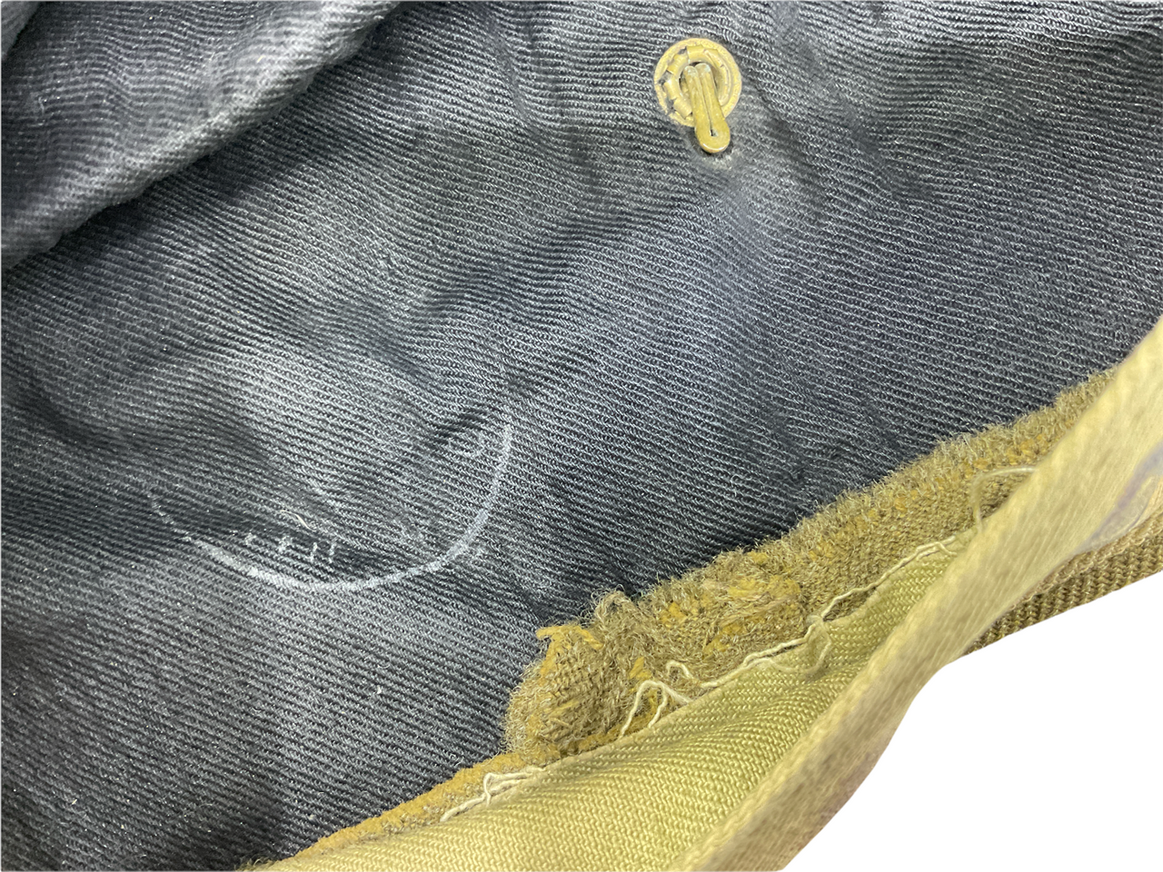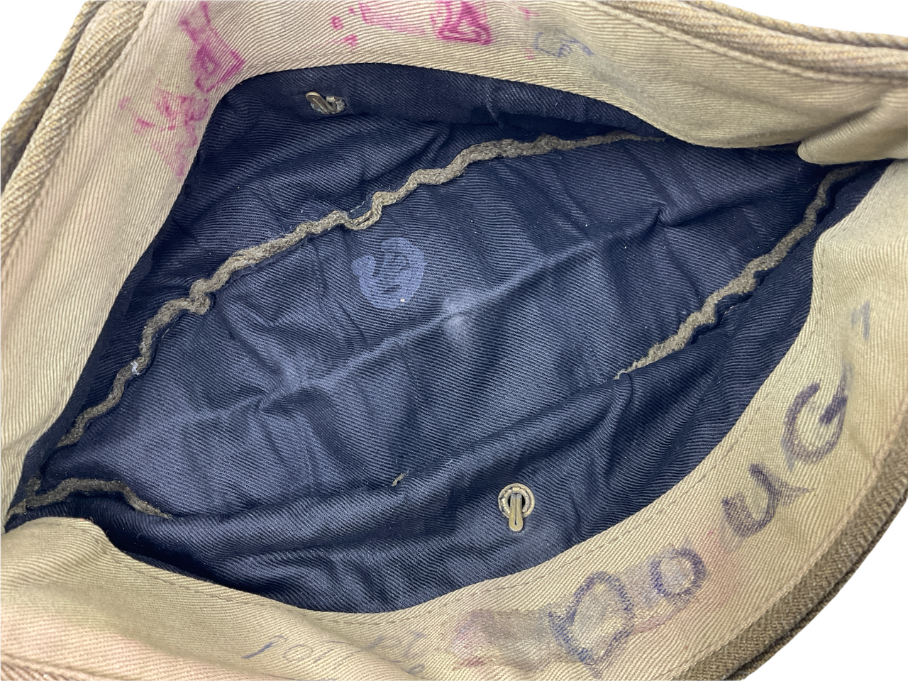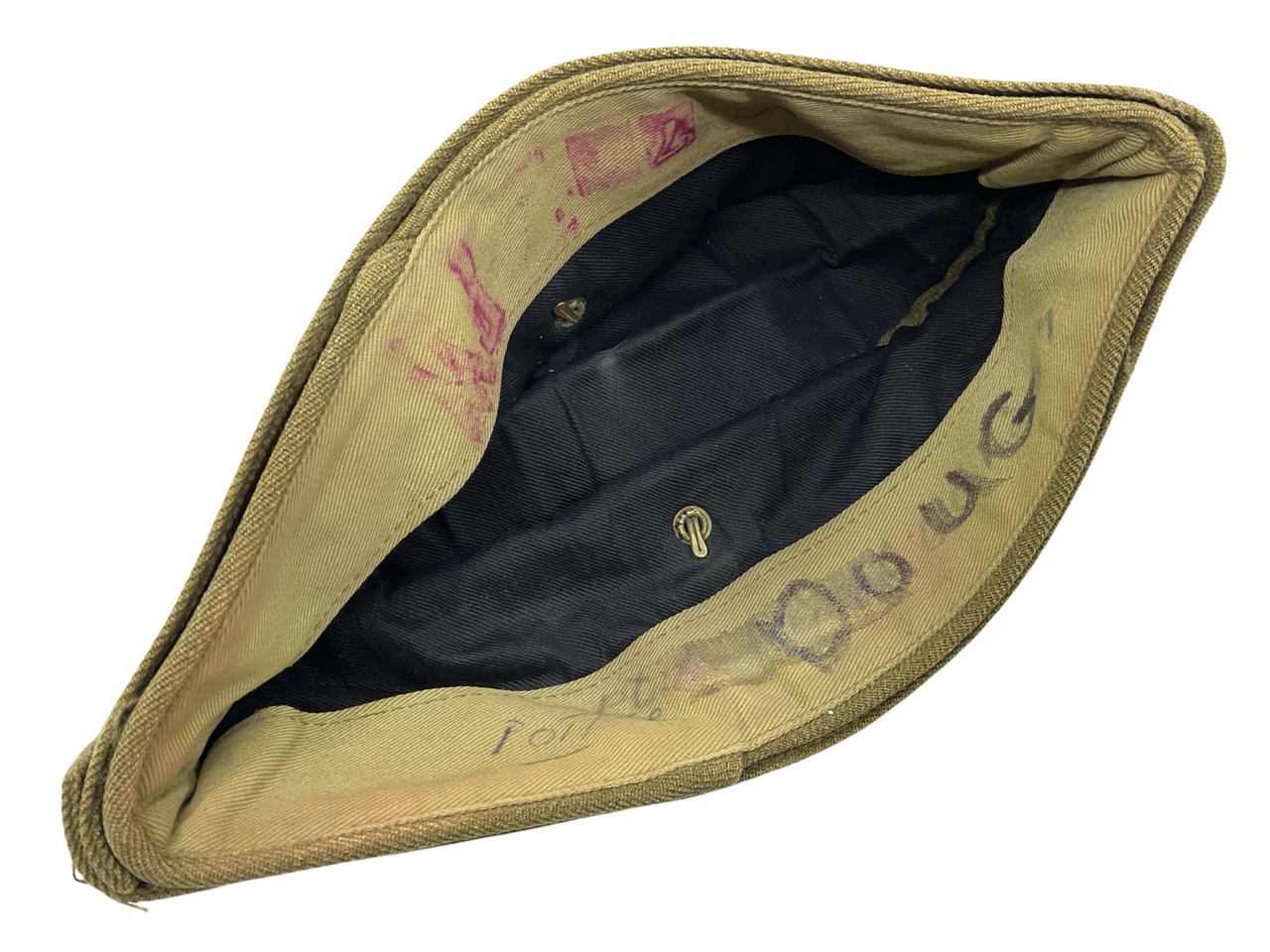 The “WW2 Canadian Wedge Cap Named & C Broad Arrow Marked” is a fascinating piece of military history from World War II. This traditional wedge cap, used by Canadian forces, features the distinctive “C” Broad Arrow marking, signifying government property. The cap is named, adding a personal touch that connects it to an individual soldier. This marking not only authenticates its origins but also highlights its role in the wartime efforts of the Canadian military. The cap is a symbol of bravery and dedication, offering a tangible link to the past and the sacrifices made during the war. Collectors and historians will appreciate its historical significance and the glimpse it provides into the daily lives of Canadian soldiers. Whether displayed in a collection or studied for research, this wedge cap is a valuable artifact representing Canada’s rich military heritage.