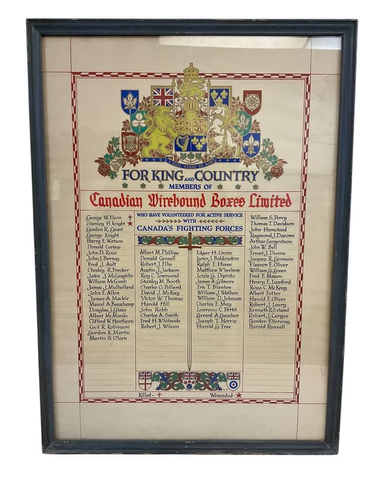 This item is a memorial plaque, measuring 25 X 18, dedicated to those brave Canadians who volunteered their services during the tumultuous times of World War II. Encased in a sturdy frame, the plaque is a testimony of those who volunteered to fight that worked for the Canadian Wirebound Box Company. These boxes were quintessential in the transportation of goods and artillery, underlining the integral role Canada played in the global conflict. The plaque serves as a tribute to the unsung heroes who worked tirelessly behind the scenes, contributing to the war effort. Handcrafted with meticulous detail, it reflects a powerful blend of history and art. This WW2 Canadian Wirebound Boxes Memorial Plaque is not only a piece of decor but also a piece of history, evoking memories of courage, resilience, and unity. It’s an ideal purchase for history enthusiasts or those with a personal connection to Canada’s World War II history.
