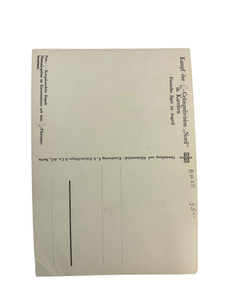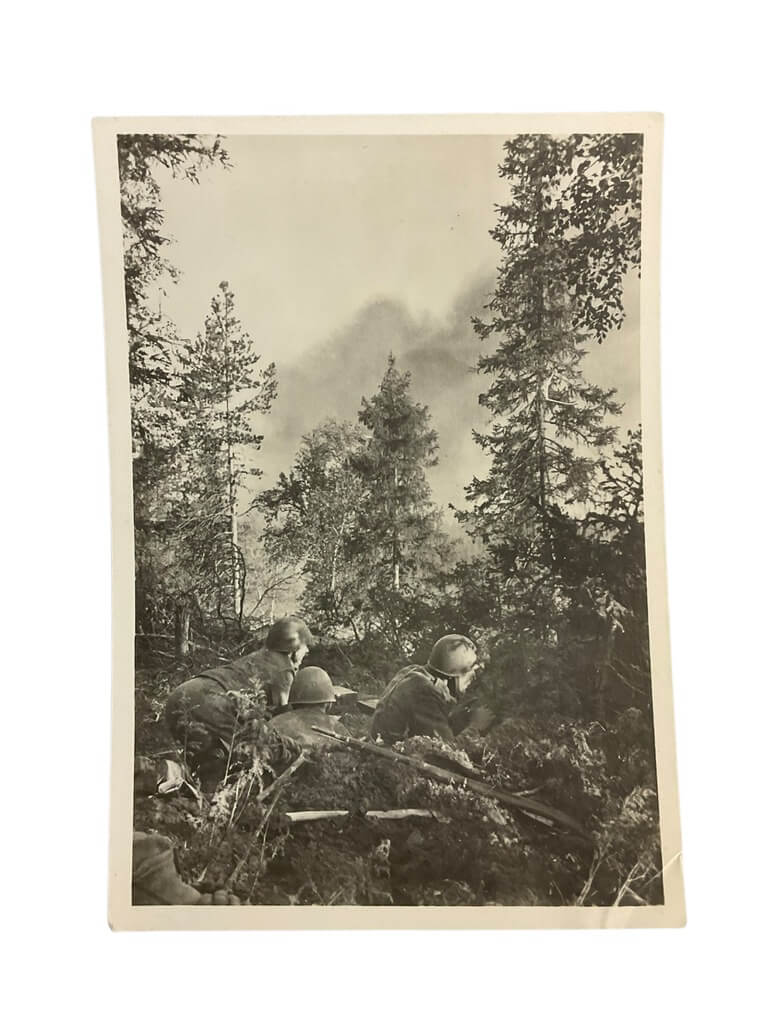 This item is a postcard featuring WW2 Finnish Mountain Troops, measuring 5.5 X 4 inches. The postcard showcases a captivating image of the determined Finnish soldiers, suited in their winter gear and positioned against the backdrop of harsh, snowy mountainous terrain. It commemorates the bravery and resilience of these troops, who were renowned for their endurance in the most unfavourable conditions. This postcard is not just a piece of paper, but a tangible piece of history. The back of the postcard is blank, allowing for personal messages or simply keeping it as a historical collectible. This is a rare and valuable item for any collector with interest in World War II memorabilia or military history, providing a unique glimpse into the lives of the Finnish Mountain Troops during the harsh winters of the war.