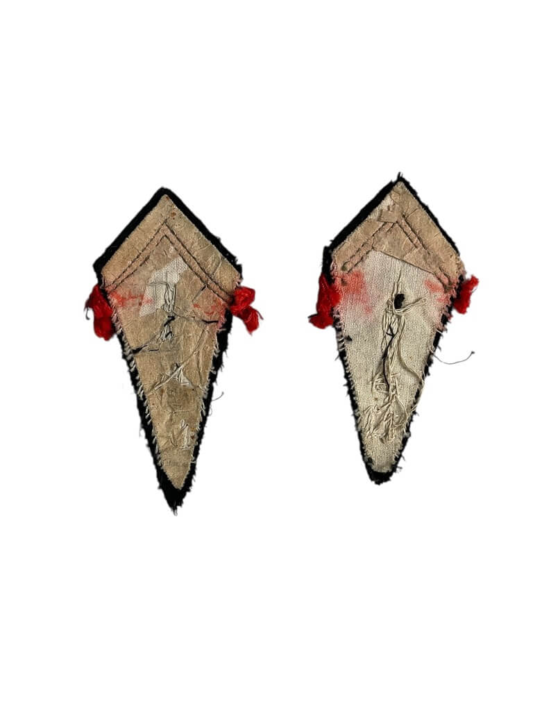This item is a matching pair of bullion wire collar insignia from the French Army’s 6th Engineer Regiment, 11th Company, dating to the Second World War. Each insignia is constructed with fine metallic bullion wire, skillfully embroidered in the traditional French military style of the era. The design features elements specific to the engineer corps, with details and composition corresponding to period regulations for unit identification worn by officers or senior non-commissioned personnel. These collar insignia would have been displayed on the uniform tunic, signifying regiment and company affiliation. The 6th Engineer Regiment served a critical support role within the French Army during WW2, focusing on engineering duties such as construction, demolition, and logistical support in the field. The pair is indicative of interwar and wartime French uniform embellishments and provides insight into the distinctions within regimental structure. Typical wear and aging are present, consistent with original mid-20th-century insignia.