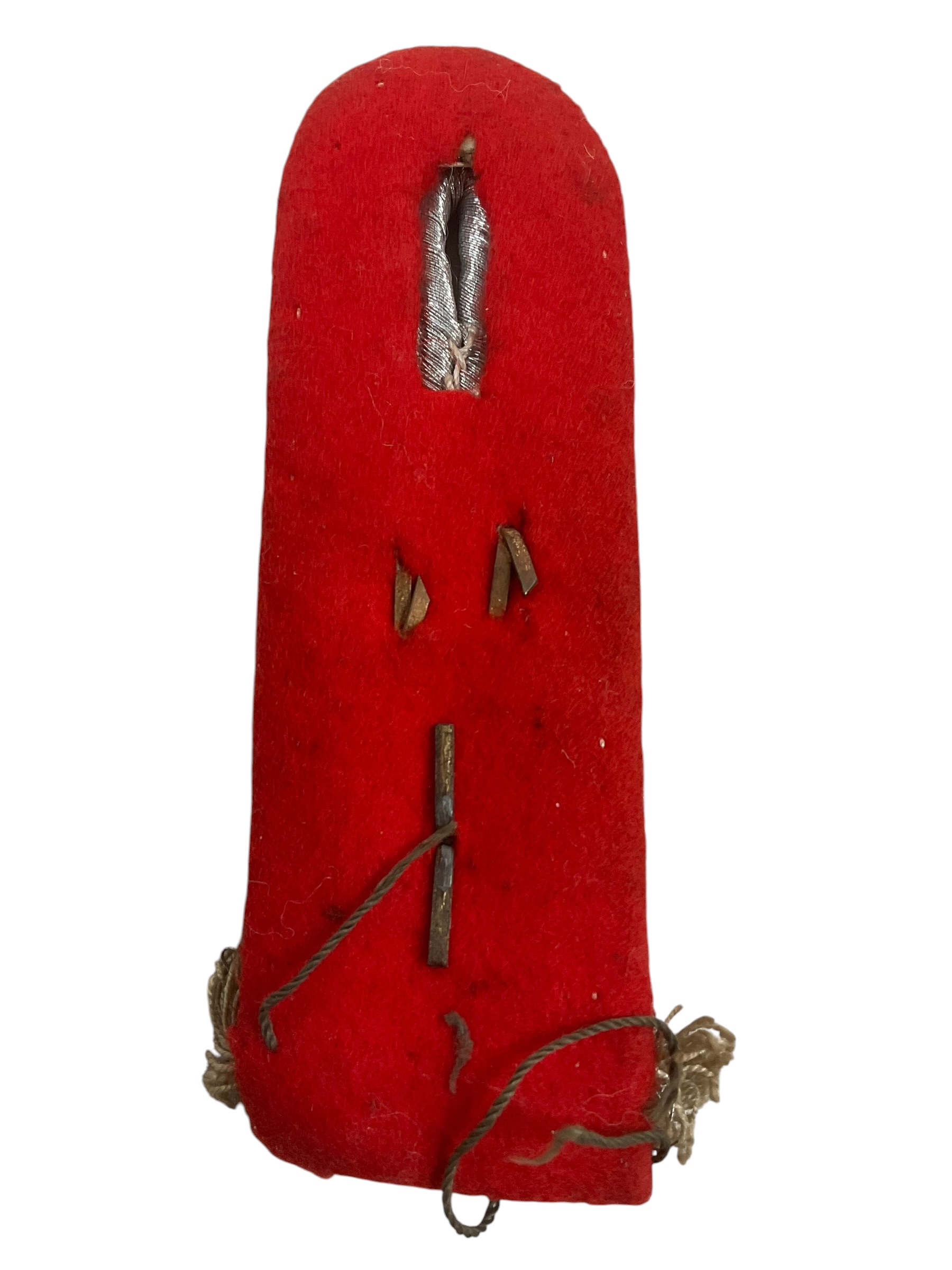 The WW2 German 18th Artillery Officers Shoulder Board Insignia Single is a representative piece of military insignia used by the German Wehrmacht during the Second World War. This shoulder board, designed for an officer in the artillery branch, features the characteristic braided silver bullion cord atop a red wool underlay, indicating the wearer’s branch of service. The gold-colored metal numeral “18” is affixed to the board, signifying the officer’s assignment to the 18th Artillery unit. Officers’ shoulder boards served both as rank indicators and as indicators of military branch and specific unit affiliation. This type of insignia was typically worn on the uniform’s shoulder and was secured by a button and tongue. Variations in construction and material can be observed, reflecting period production methods. Shoulder boards such as this played a significant role in military dress and identification during the era, adhering to the strict uniform regulations of the German military structure.