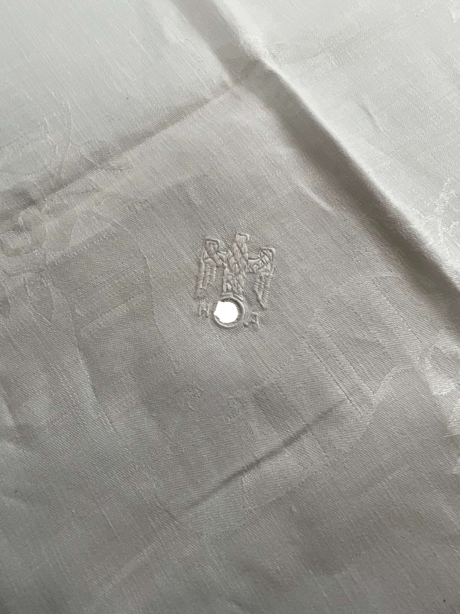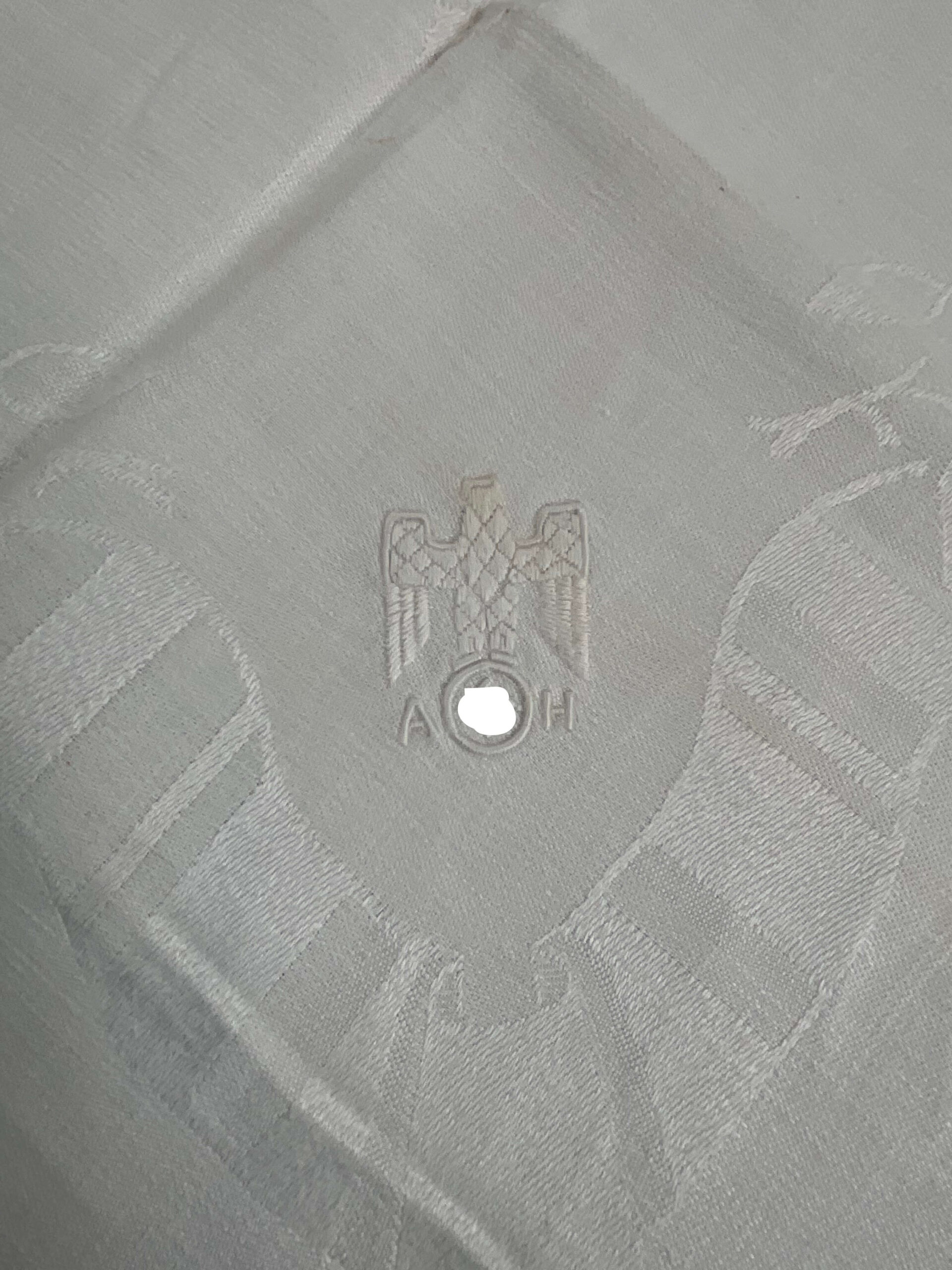 This vintage World War II German Adolf Hitler Table Cloth measures 24 1/2″ x 26 1/2″ and showcases a significant part of history. A remarkable artifact from the WWII era, the table cloth features the iron eagle emblem, a symbol strongly associated with the Third Reich and the Nazi party, of which Adolf Hitler was the infamous leader. The item is woven from high-quality fabric, and despite its age, it remains in excellent condition. Its size makes it versatile for display or for use in historical reenactments. This WWII German Adolf Hitler table cloth not only serves as a piece of memorabilia but also as a stark reminder of a pivotal period in world history. A unique item for collectors of WWII artifacts or those with a keen interest in historical items.