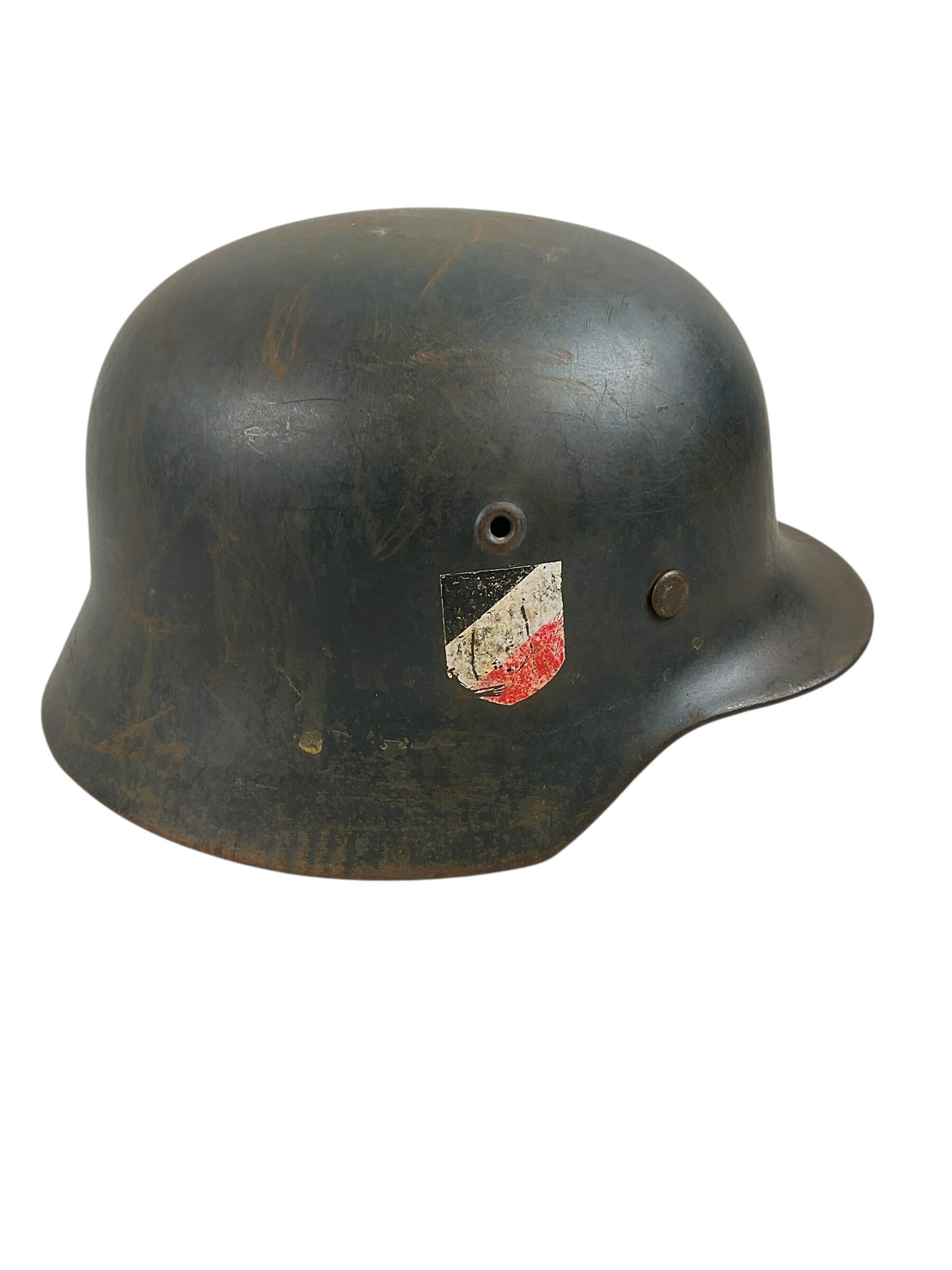 This is a restored replica of the WW2 German Air Force (Luftwaffe) M40 Steel Helmet ET64, meticulously crafted to reflect the original design. However, it’s important to note that this is not an original piece from the WWII era, but a high-quality imitation. The helmet is robustly constructed from steel, offering a true-to-life feel of the heavy-duty military gear used by Luftwaffe personnel. Its size, ET64, is precisely replicated, ensuring an authentic look. The helmet features the signature Luftwaffe grey-blue paint, applied with great detail to match the original style. It’s ideal for history enthusiasts, collectors seeking WWII memorabilia, or reenactment participants. This restored fake provides a tangible glimpse into history without the high cost of genuine artifacts.