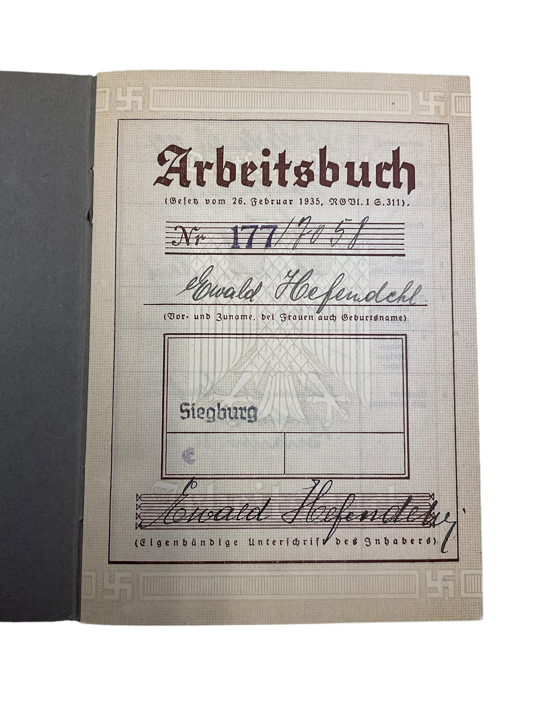 WW2 German Arbeitsbuch Employment Record Book – Hefendehl