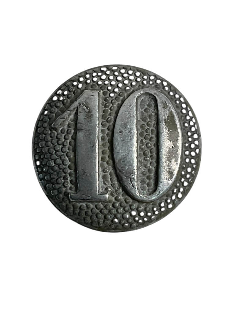 This is a World War II German Army 10th Company button. The button is a standard military uniform accessory produced for the German Wehrmacht during the Second World War, used to designate regimental or company affiliation within the army. It is typically constructed from metal, featuring a raised or stamped numeral “10,” indicating assignment to the 10th Company. Such buttons were attached to tunics or greatcoats through either sewn or shank fittings. The design and size conform to period army regulations, with surface finishes varying between silvered, gray, or field-painted, depending on manufacturer or service requirements. These buttons formed part of the standardized uniform system adopted by the German armed forces, facilitating rank and unit identification at a glance. The item offers insight into the material culture and organizational structure of the German military during the 1939-1945 conflict. Wear, patina, and construction details correspond to artifacts from the era.