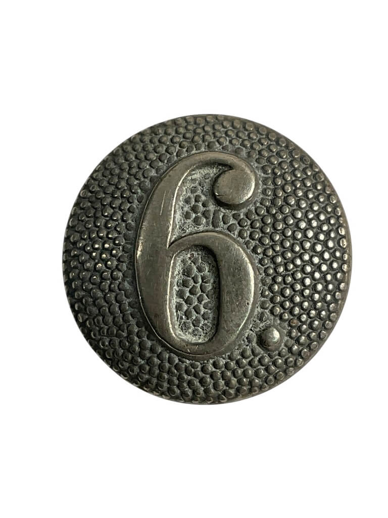 This item is a World War II-era German Army 6th Company button, representative of the uniform accoutrements used by Heer (Army) personnel during the conflict. Made from stamped metal, the button displays the numeral “6,” designating the soldier’s assignment to the 6th Company within a regiment or battalion. Buttons of this type were typically affixed to the shoulder straps of field blouses or tunics, serving both a functional and organizational role. The design adheres to the standardized forms adopted by the Wehrmacht, featuring a flat or slightly convex profile with a shank on the reverse for attachment. Surface finishes may range from a silvered, grey, or field-painted appearance, depending on production period and manufacturer. Such items are valuable for collectors and historians interested in German military equipment, providing insight into unit identification practices during the Second World War. This example reflects the material culture and organizational methods of the German Army from 1939 to 1945.