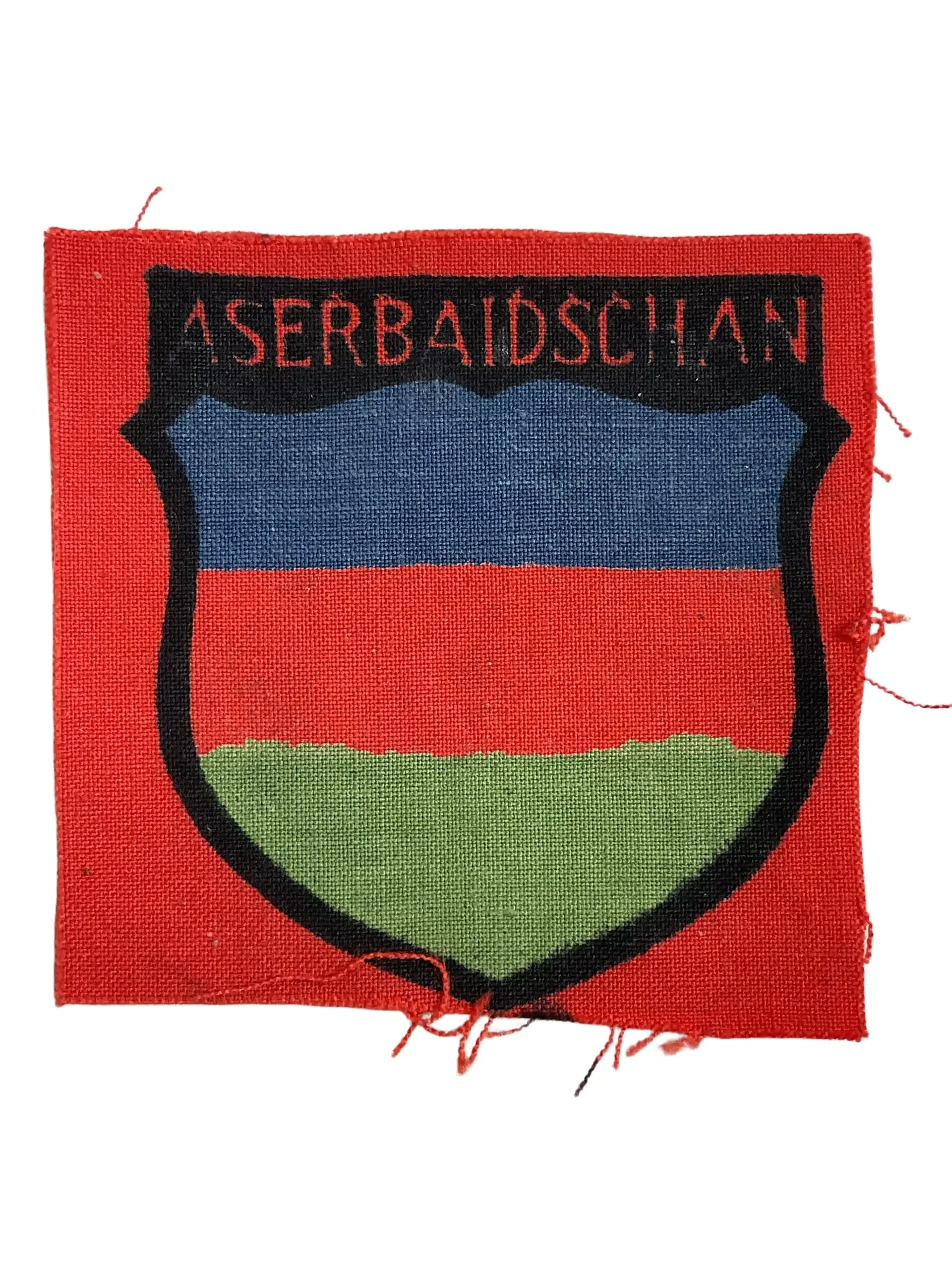 The WW2 German Army Foreign Volunteers Azerbaijan Printed Sleeve Insignia Patch represents the emblem worn by members of the Azerbaijan Legion, a foreign volunteer unit that served within the German Wehrmacht during the Second World War. This cloth patch was authorized for Azerbaijani personnel recruited primarily from Soviet prisoners of war and émigrés. The design features a shield with traditional Azerbaijani colors and motifs, printed on