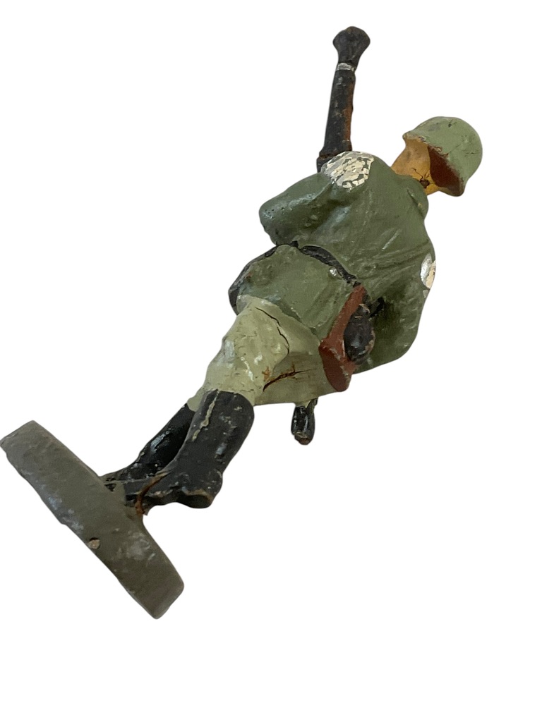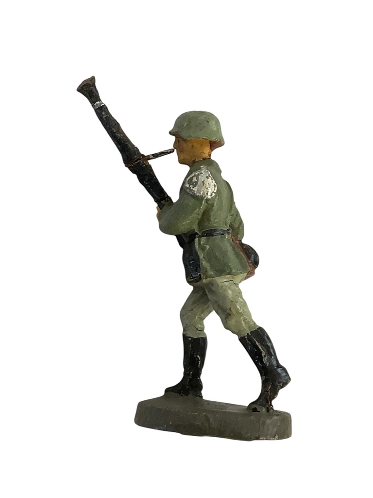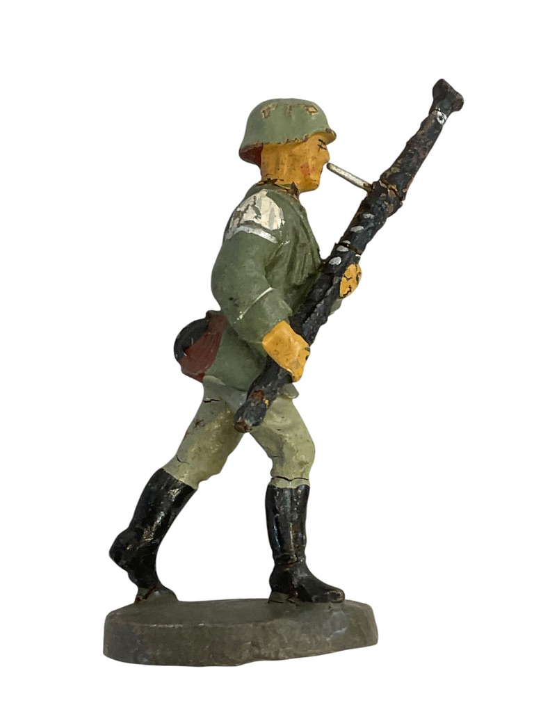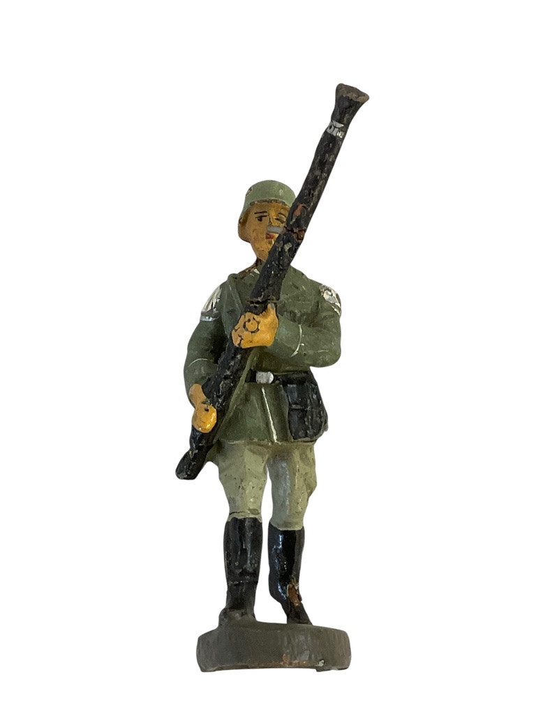 This collectible piece, titled ‘WW2 German Army Heer Bandsman With Bassoon Elastolin Toy Soldier’, is a unique find for history enthusiasts and toy collectors. Esteemed for its detail and authenticity, it features a WW2 era German Army Heer Bandsman, accurately portrayed with his bassoon – a significant symbol of the military band. Created by Elastolin, a renowned German toy manufacturer, it showcases the company’s exceptional craftsmanship and attention to historical accuracy. Made from a composite material, the toy soldier is hand-painted to bring out the intricate details of the bandsman’s uniform, instrument, and stance. This rare piece not only reflects Elastolin’s dedication to quality but also provides a fascinating glimpse into the role of music in the German military during the Second World War. It’s an invaluable addition to any toy soldier collection or historical display.
