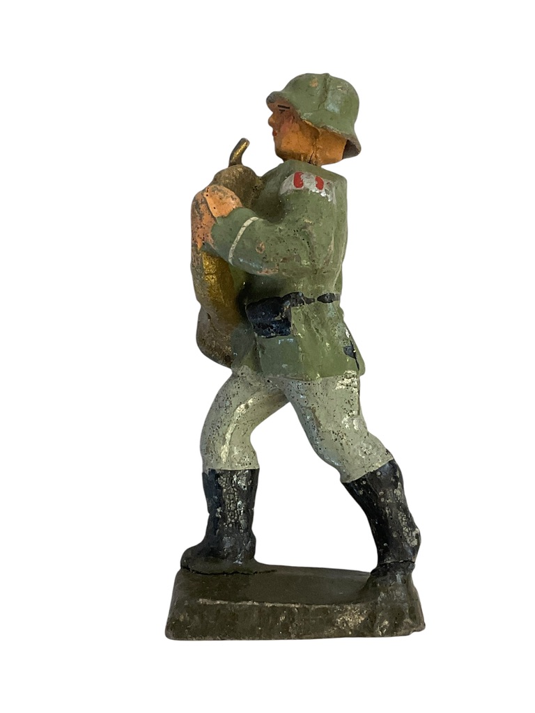 The ‘WW2 German Army Heer Bandsman With French Horn Elastolin Toy Soldier’ is a meticulously crafted collectible that embodies a unique aspect of World War II history. Manufactured by Elastolin, a renowned German toy company, this soldier figurine is an authentic representation of a Heer bandsman, a member of the German Army’s military band, cradling a French Horn. The intricate detailing and fine craftsmanship embody the company’s commitment to accuracy and quality. Measuring approximately 7.5 cm in height, the soldier is poised mid-note, decked out in a historically accurate uniform. The toy’s composition of elastolin, a durable, composite material, ensures its longevity. This figurine is a must-have for any military history enthusiast, vintage toy collector, or anyone interested in World War II memorabilia.