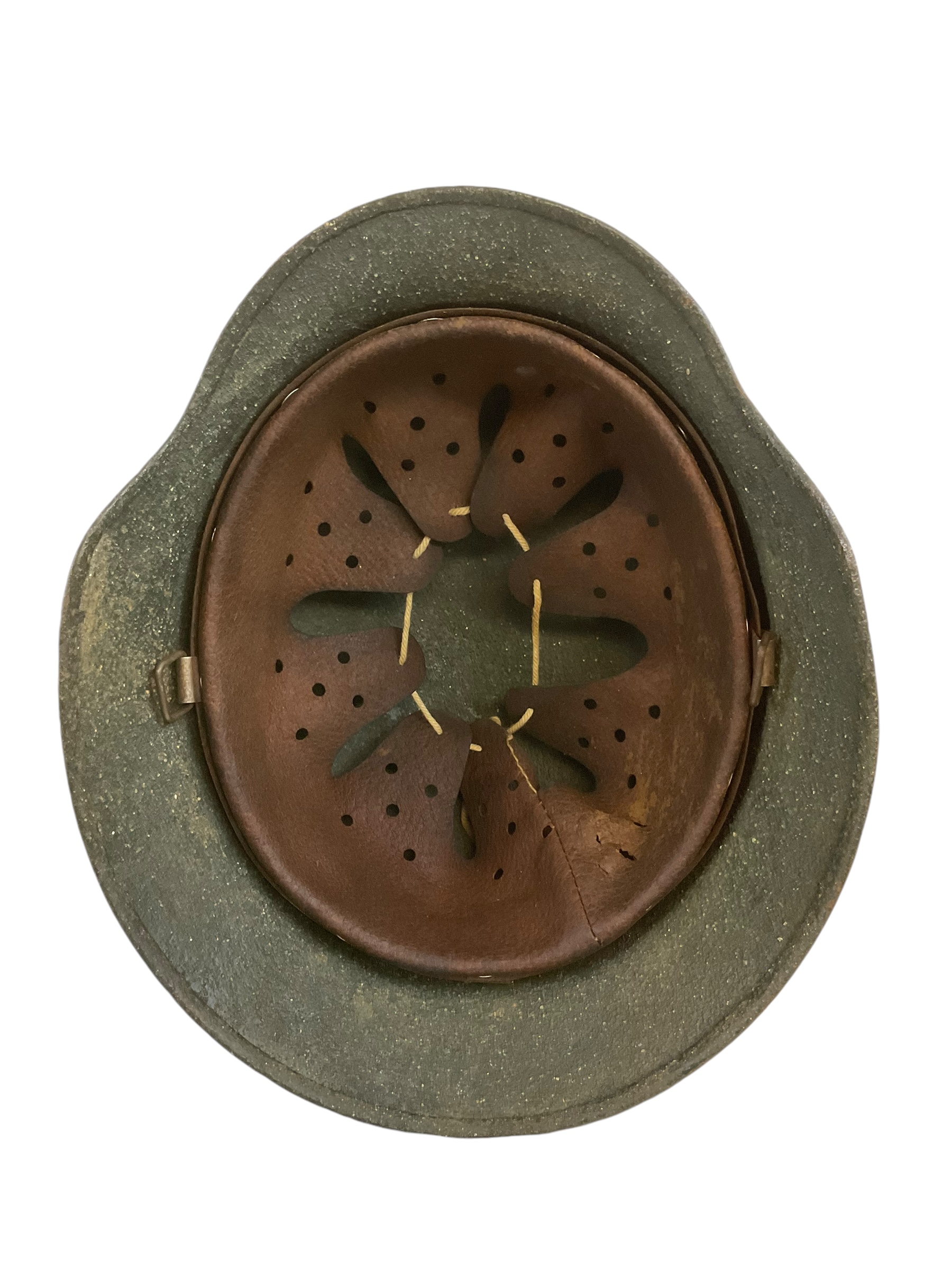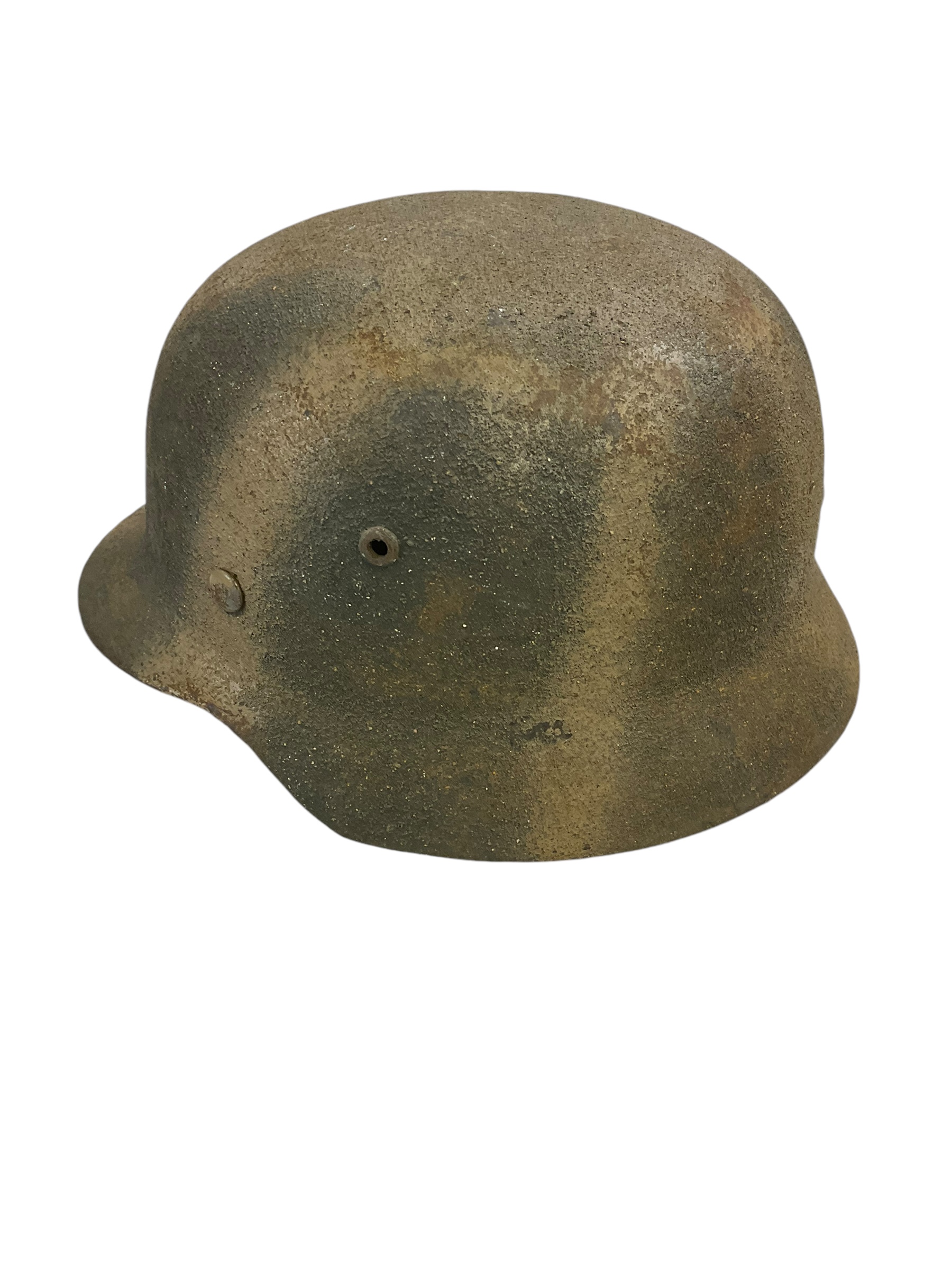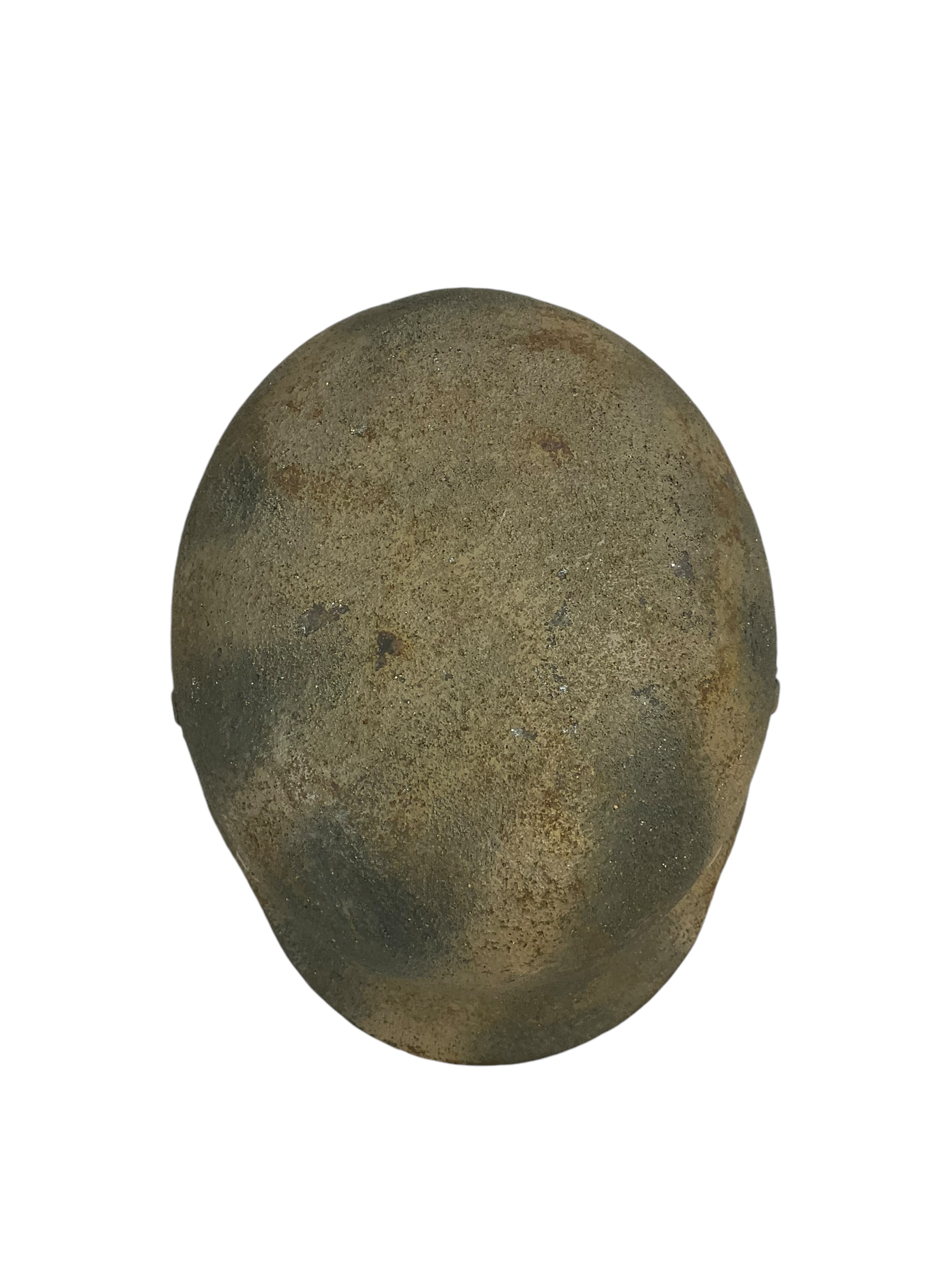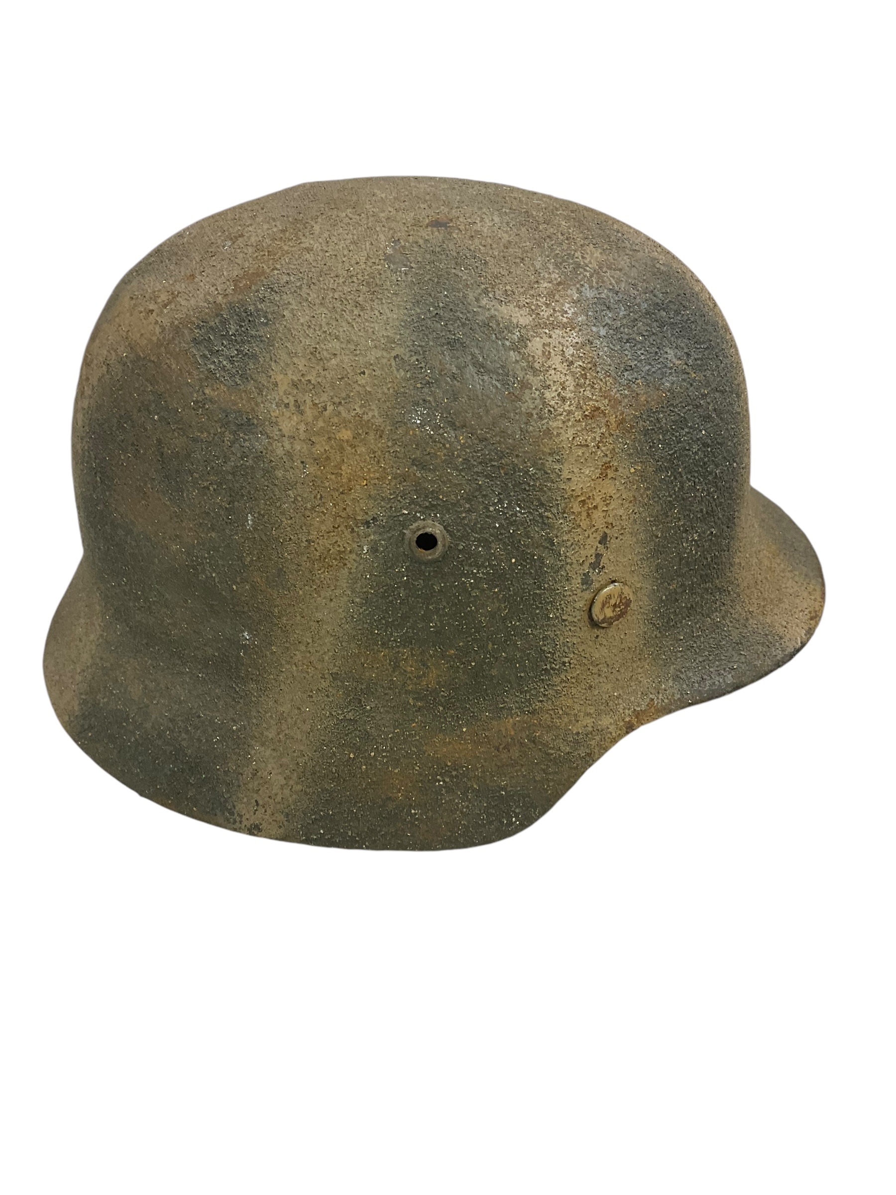 This is a restored original shell WWII German m35 Steel Helmet size 66. It is not an all original piece but an imitation, designed to resemble the authentic helmets used by German soldiers during the Second World War. The helmet is an original m35 steel shell with restored paint, Liner and decals as well as a unique two-tone woodchip painted camo overpaint; Similar to the pattern of the Italian campaign or FJR6 in Normandy. The marking, indicating its size and maker, is obscured by paint however the liner size is 58cm indicating a size 66 shell. Though this helmet is a fake, it has been restored to maintain a vintage look and feel. It serves as a fascinating piece of historical memorabilia and can be an excellent addition to any WWII collection or display. Please remember, this is not a genuine all original piece.