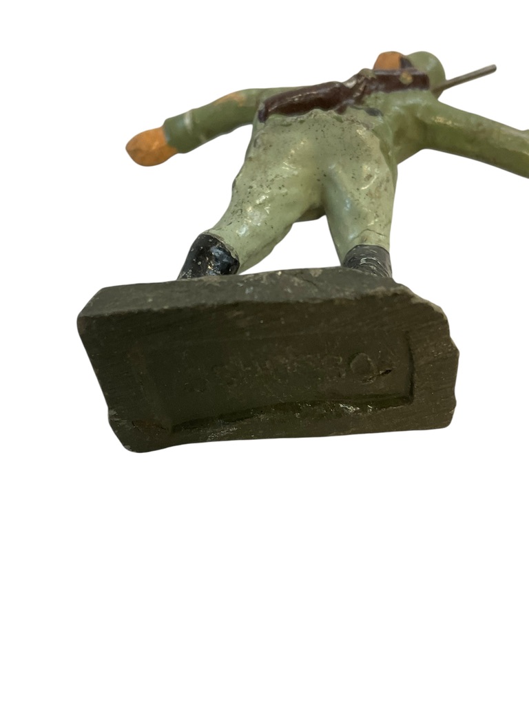 This collectible item is a WW2 German Army Heer Elastolin Toy Soldier Throwing Grenade. Crafted with a keen eye for detail, this miniature figurine is a noteworthy piece of military history, representing a soldier from the German Heer, the land forces component of the Wehrmacht, during the World War II era. Displaying a dynamic action pose, the soldier is portrayed in the midst of a grenade throw, a depiction that evokes the tension and drama of battlefield scenarios. The Elastolin brand, renowned for its high-quality models, ensures that this toy soldier is made with durability and authenticity in mind. Its intricate design and careful painting make it a must-have for any military memorabilia enthusiast, history buff, or toy soldier collector. This item is not only a toy but also a piece of history that brings the past to life in a tangible way.