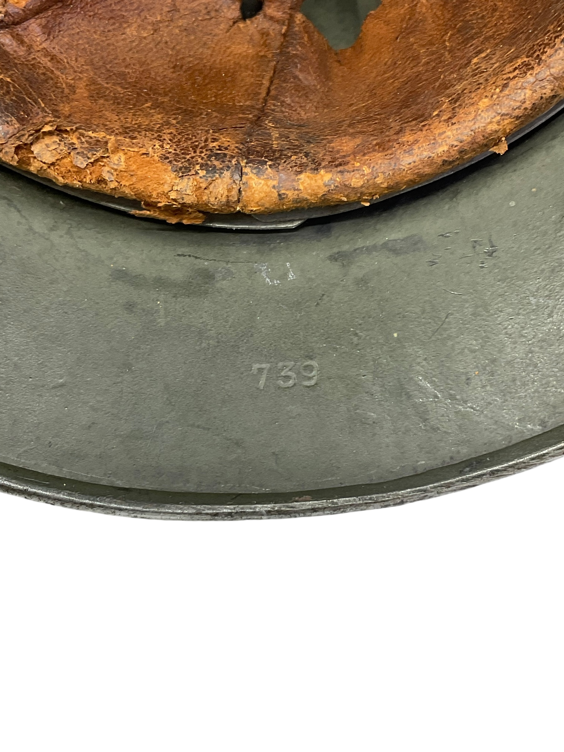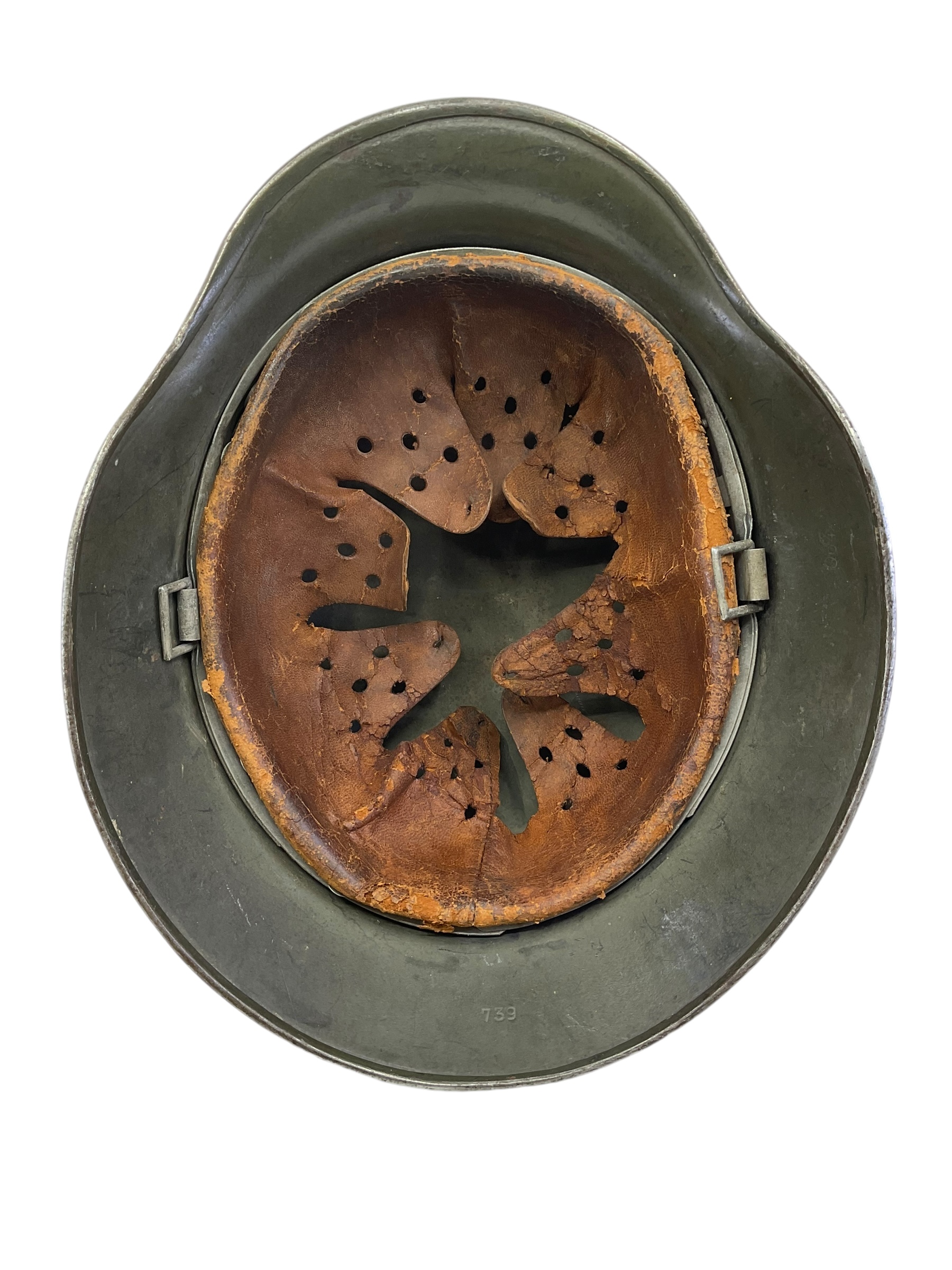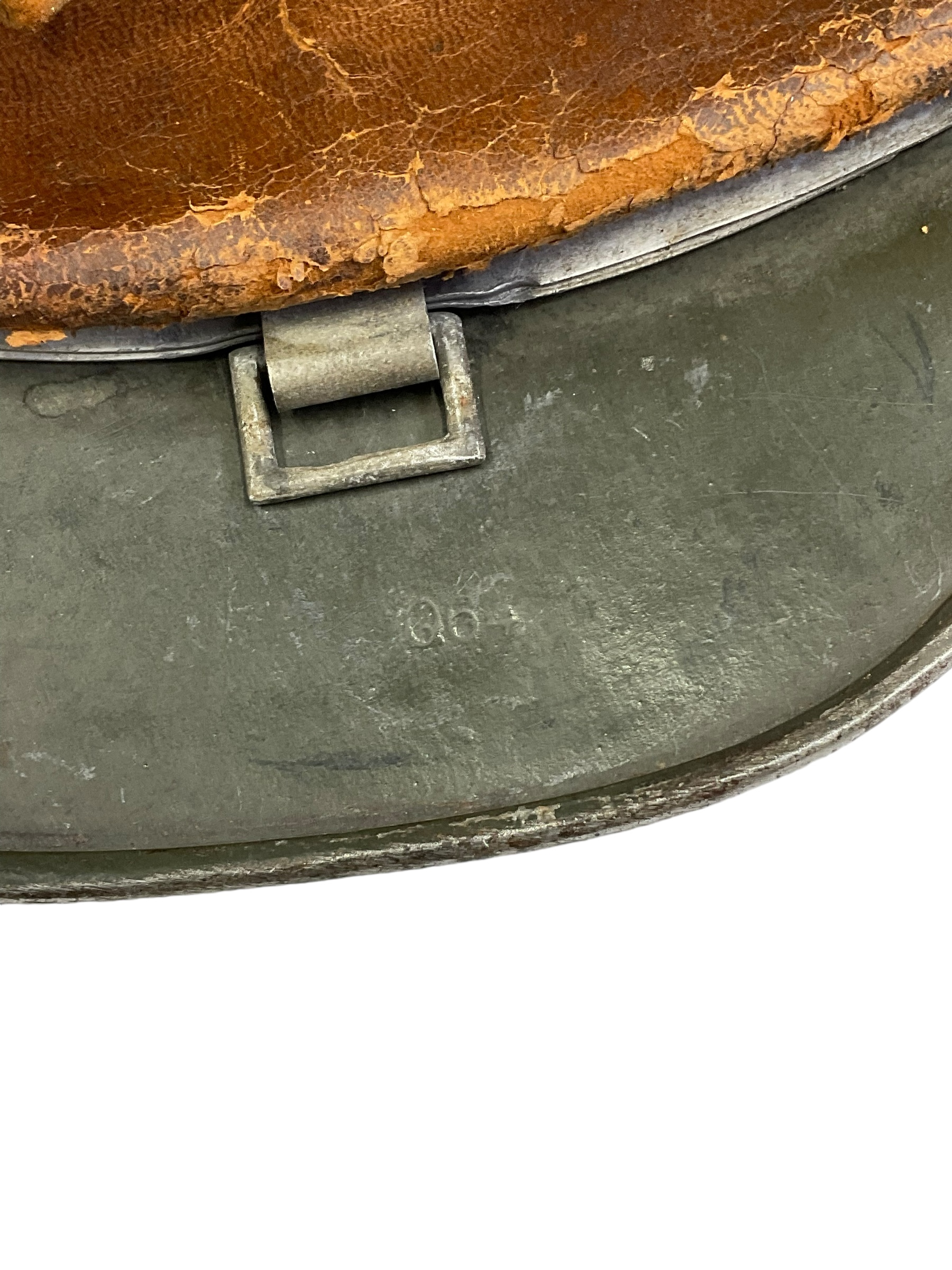This is an all original Q64 M35 steel helmet. The helmet has been reissued with a textured slate gray overpaint (as per 1940 regulation). The inside retains the original pre 1940 deep apple green smooth factory paint. The liner is an early aluminum band with reinforced chinstrap rings. The chinstrap rings are early square cast aluminum. The leather is still somewhat pliable and shows heavy use. The rarely seen early aluminum split pins have been removed and reinstalled at some point. Unfortunately, someone has attempted to “dig” the decals out from under the reissue paint using a chemical stripper. This has removed the decals – the price reflects this. This is an opportunity to add an early m35 to your collection or mannequin display for a much less than the cost of a pristine example.