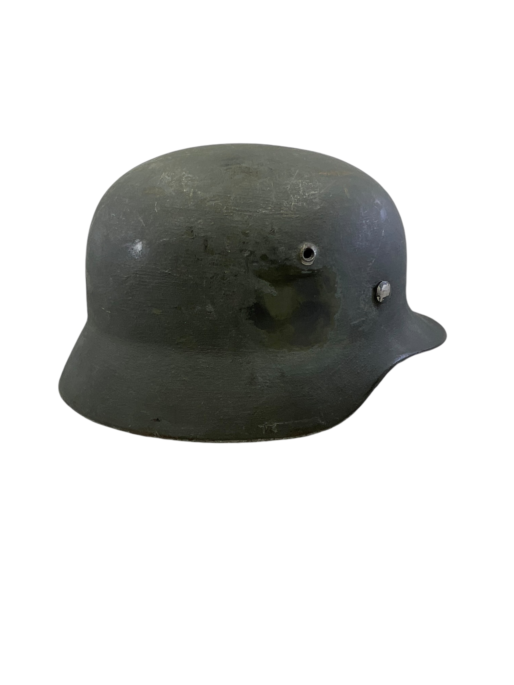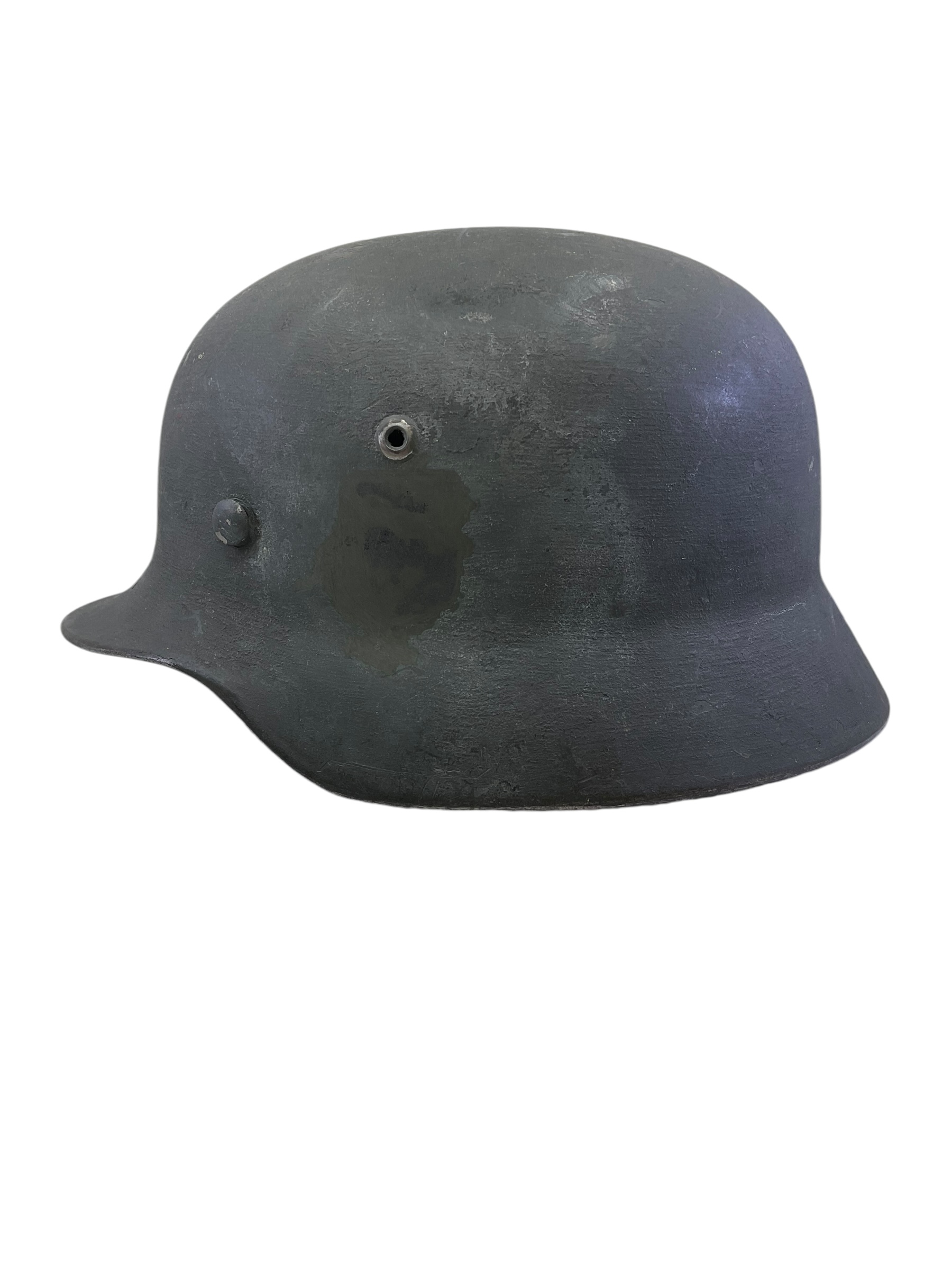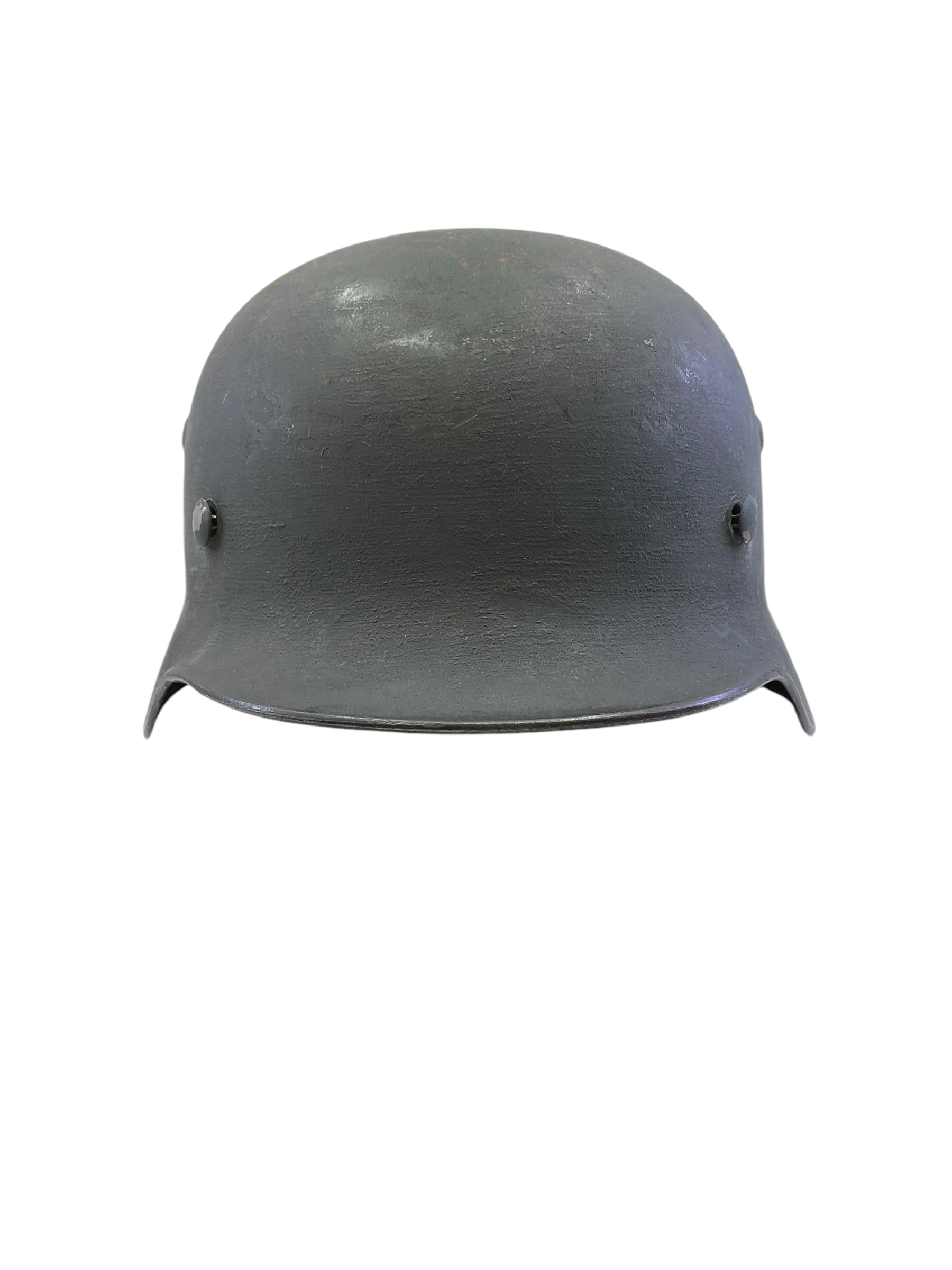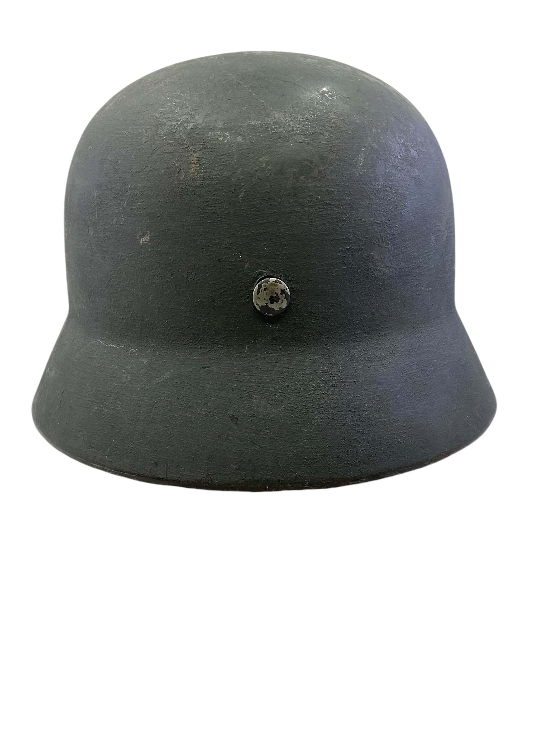 This is an all original Q64 M35 steel helmet. The helmet has been reissued with a textured slate gray overpaint (as per 1940 regulation). The inside retains the original pre 1940 deep apple green smooth factory paint. The liner is an early aluminum band with reinforced chinstrap rings. The chinstrap rings are early square cast aluminum. The leather is still somewhat pliable and shows heavy use. The rarely seen early aluminum split pins have been removed and reinstalled at some point. Unfortunately, someone has attempted to “dig” the decals out from under the reissue paint using a chemical stripper. This has removed the decals – the price reflects this. This is an opportunity to add an early m35 to your collection or mannequin display for a much less than the cost of a pristine example.