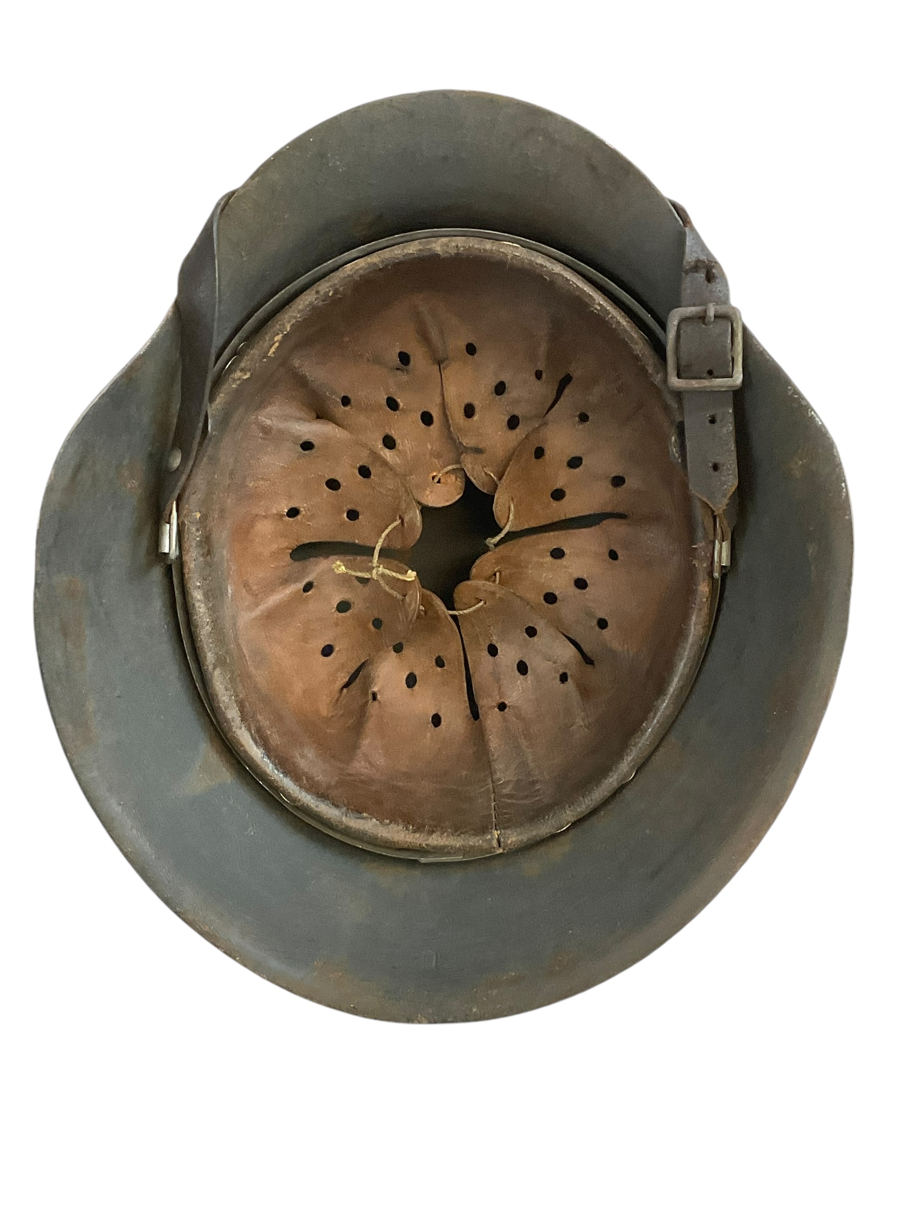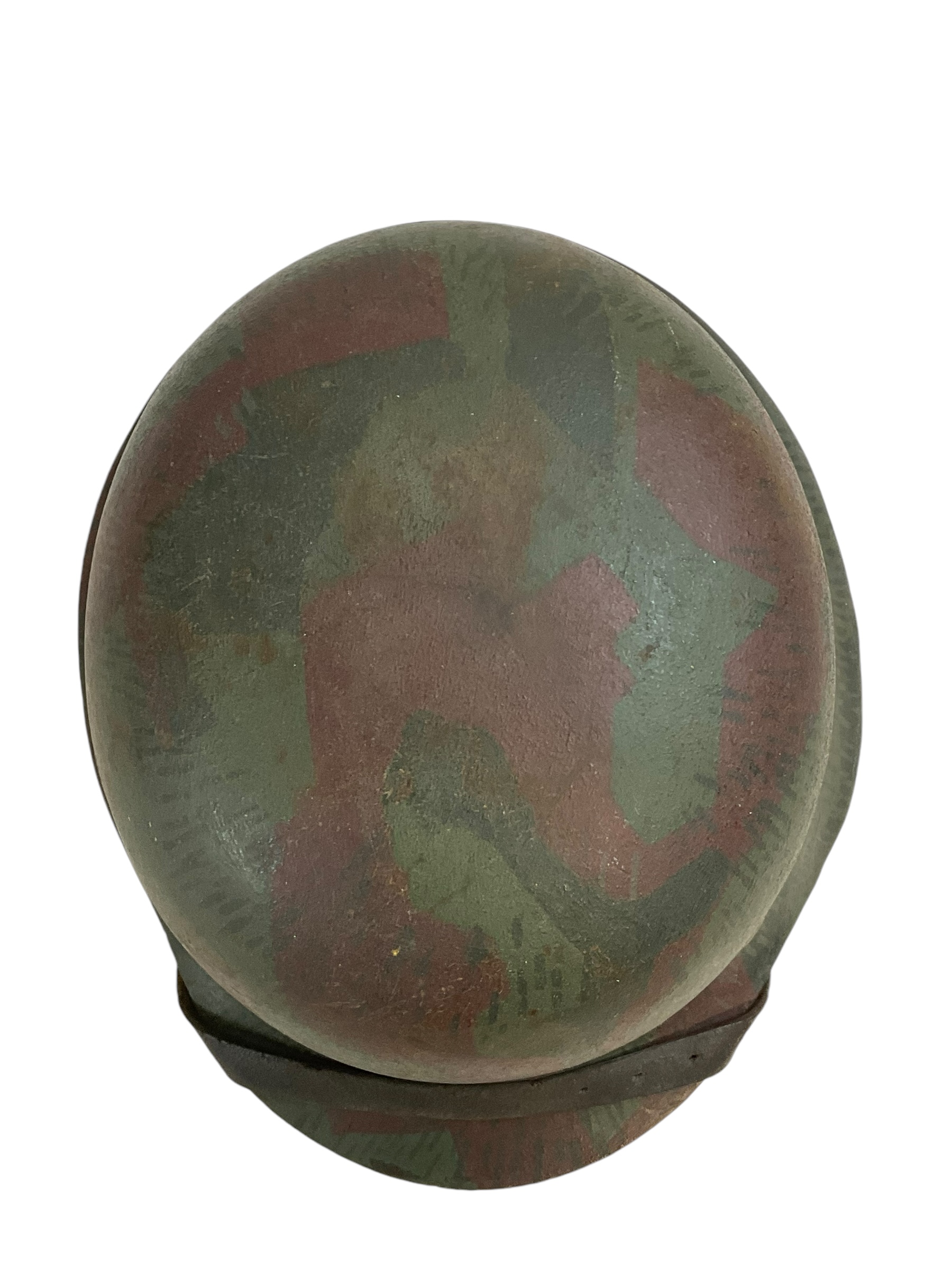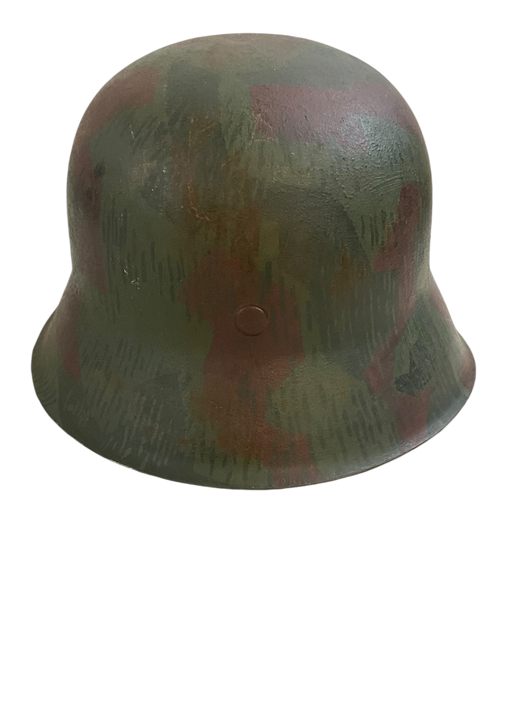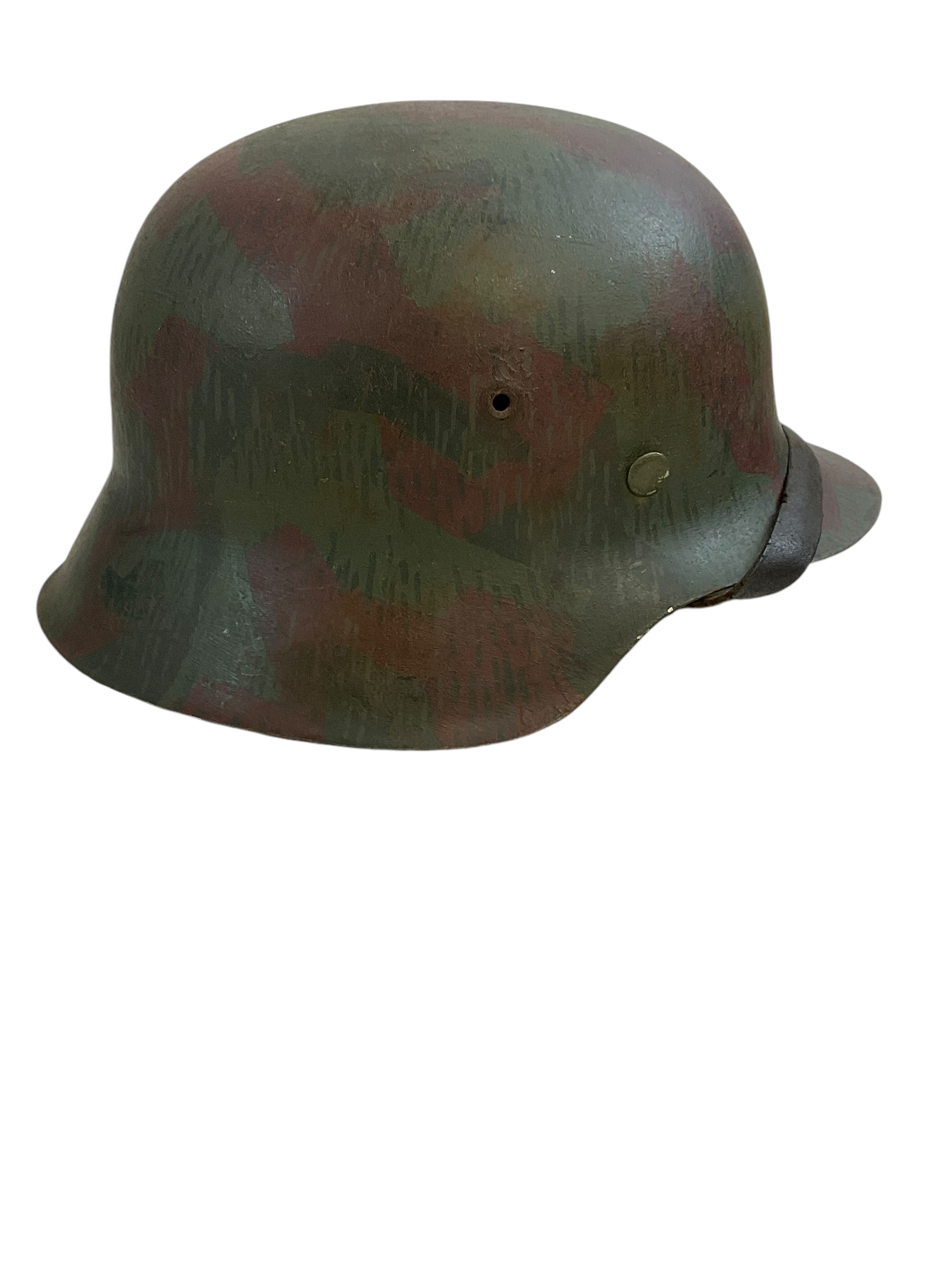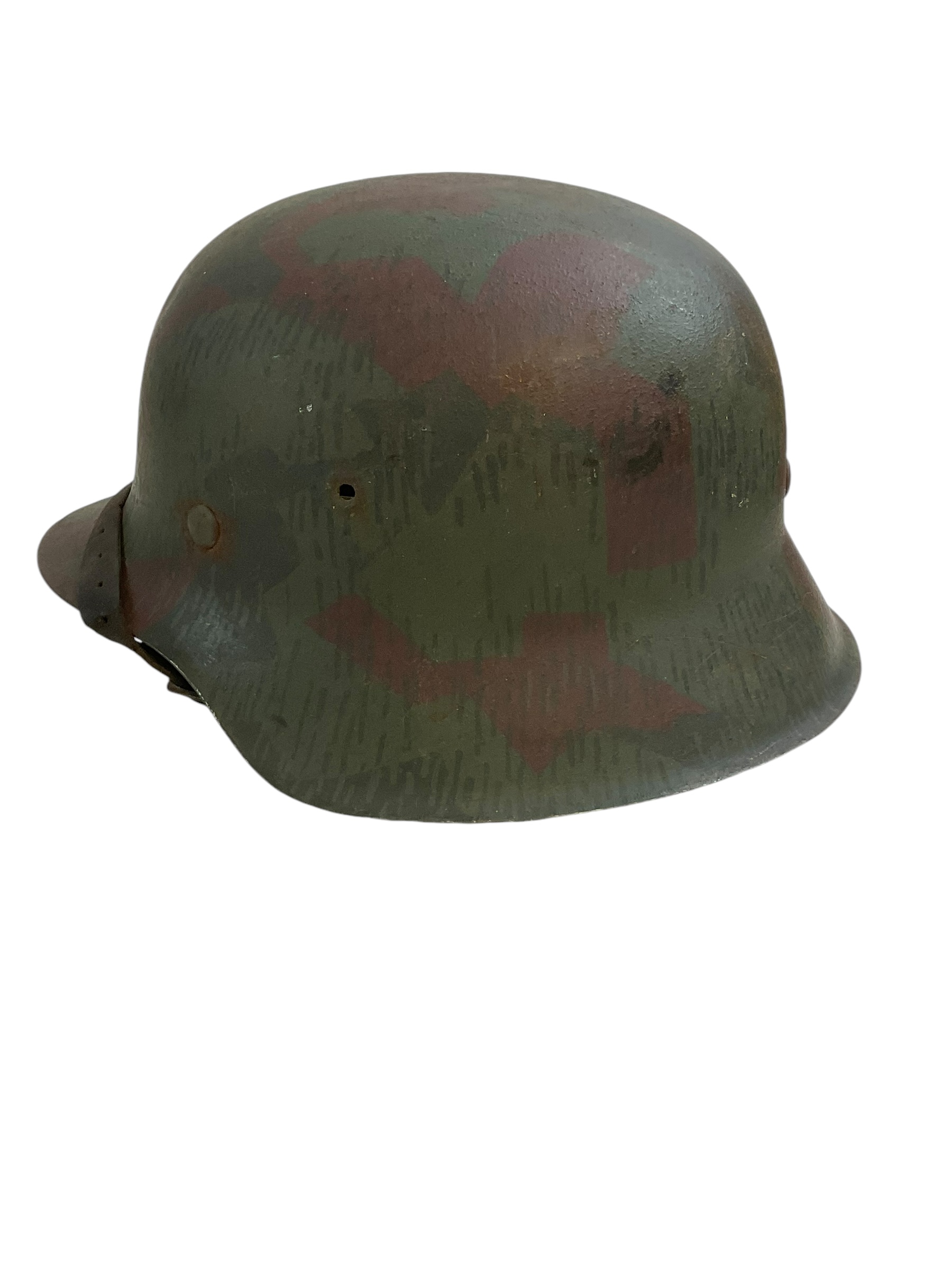 This is a restored original shell WWII German m42 Steel Helmet size 62. It is not an all original piece but an imitation, designed to resemble the authentic helmets used by German soldiers during the Second World War. The helmet is an original m42 steel shell with restored paint, Liner and decals as well as a unique hand painted camo overpaint; Similar to the splinter pattern of the German army zeltbahn shelter quarter . The marking, indicating its size and maker, is obscured by paint however the liner size is 55cm indicating a size 62 shell. Though this helmet is a fake, it has been restored to maintain a vintage look and feel. It serves as a fascinating piece of historical memorabilia and can be an excellent addition to any WWII collection or display. Please remember, this is not a genuine all original piece.