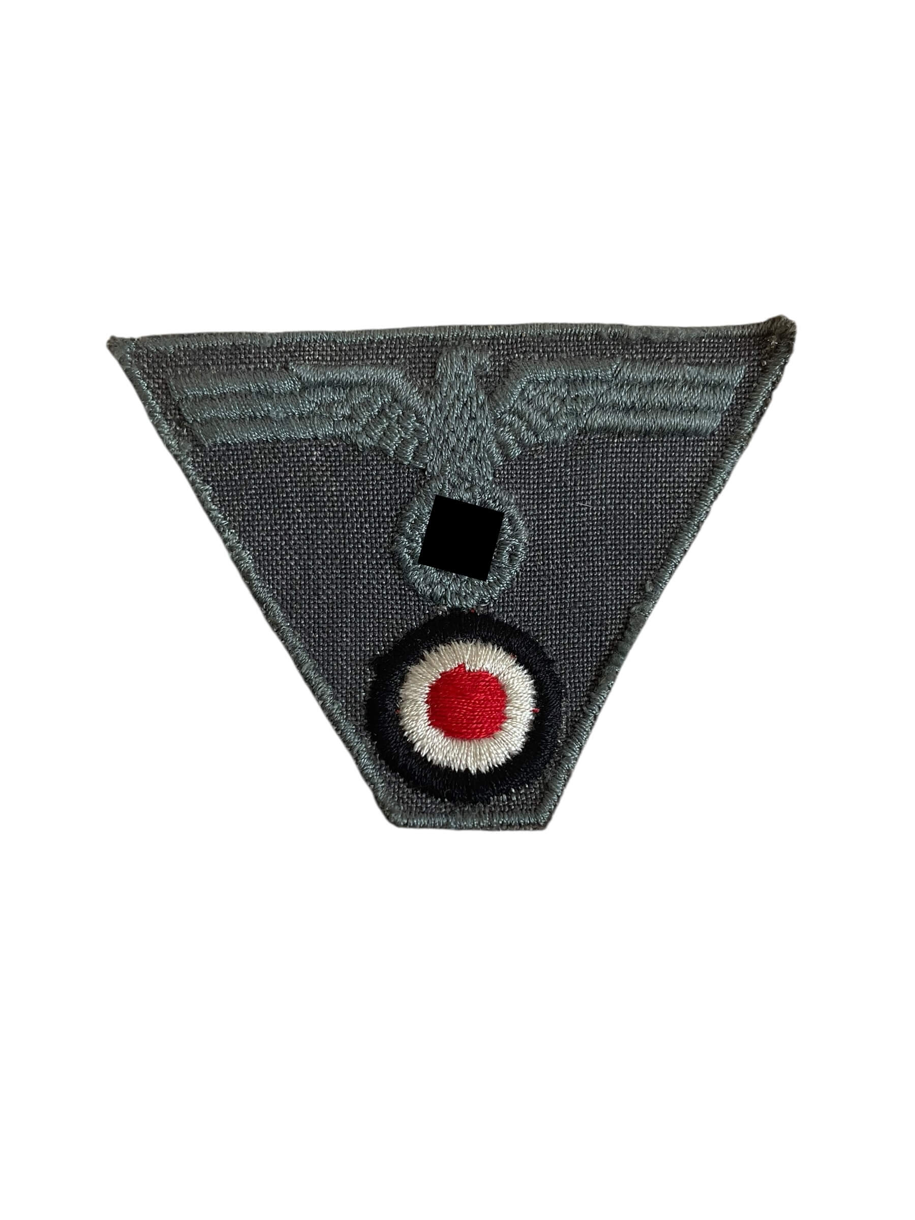 The WW2 German Army M43 Cap Eagle is an insignia originally issued for the M43 field cap (Einheitsfeldmütze) worn by Heer (Army) personnel during the Second World War. This eagle emblem features a stylized Wehrmacht eagle clutching a swastika, with outstretched wings, and is typically machine-embroidered in silver-grey or white thread on a dark green or field-grey backing to match standard uniform colors. The patch is rectangular in shape and designed for stitching above the cap’s visor. During the late war period, these eagles were produced in large quantities and may exhibit variations in materials and manufacturing quality due to manufacturing constraints. The M43 Cap Eagle indicates the rank-and-file status of the wearer and reflects the standardized insignia introduced as part of uniform reforms in 1943. This insignia is a key component in the identification and authentication of original German Army M43 caps from the Second World War.