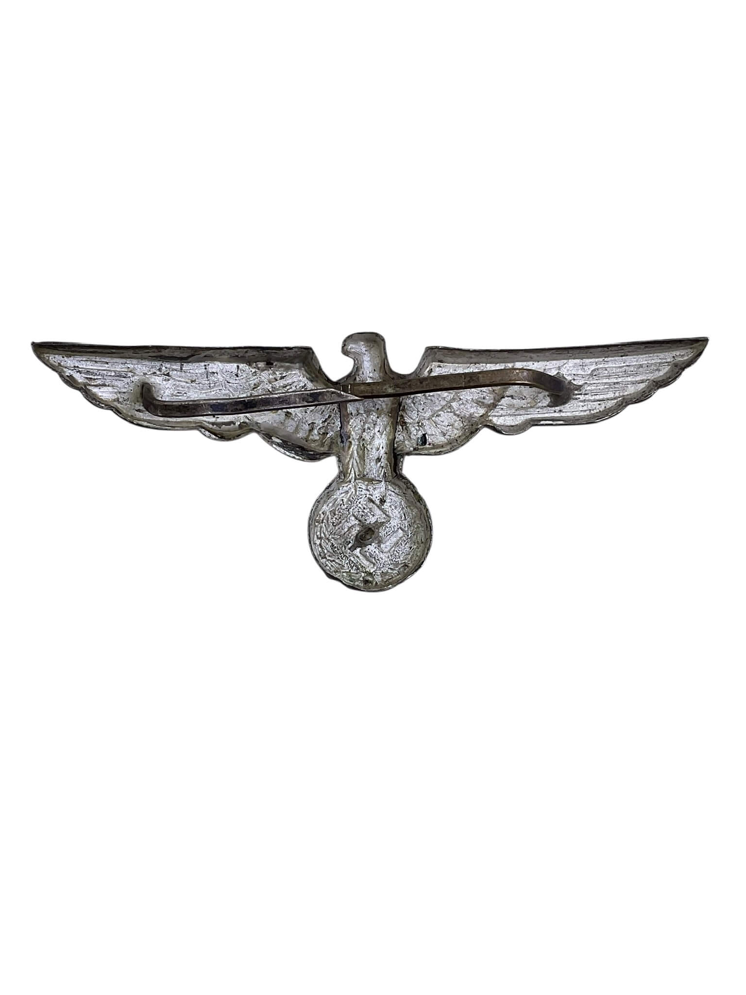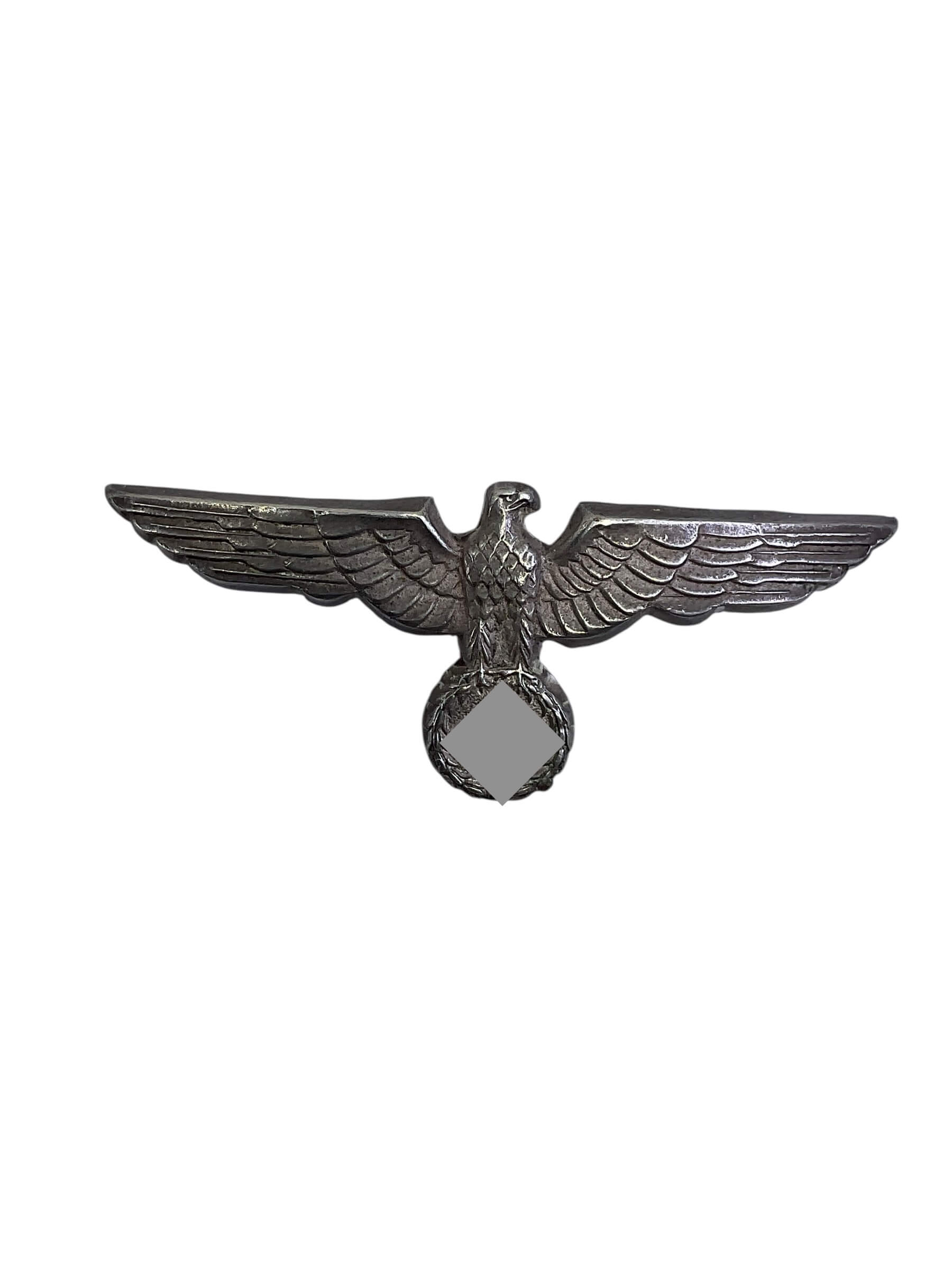 The WW2 German Army Officers Cap Eagle is a military insignia used by officers of the German Army (Heer) during the Second World War. Produced from stamped metal, typically aluminum or zinc, the cap eagle features an outstretched eagle clutching a swastika, symbolizing national insignia of the period. This emblem was worn above the visor on the peaked service caps (Schirmmütze) of officers and was designed as a key component in distinguishing rank and branch within the armed forces. The detailing often includes precise feathering on the eagle and distinct definition around the swastika and wreath. Variations exist depending on the manufacturer and year of production, but the overall configuration remained consistent from 1935 through 1945. The cap eagle is frequently sought by collectors and historians for its role in illustrating the uniform and organizational structure of the WW2 German Army officer corps.