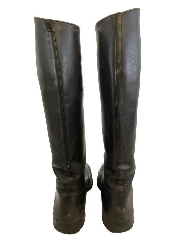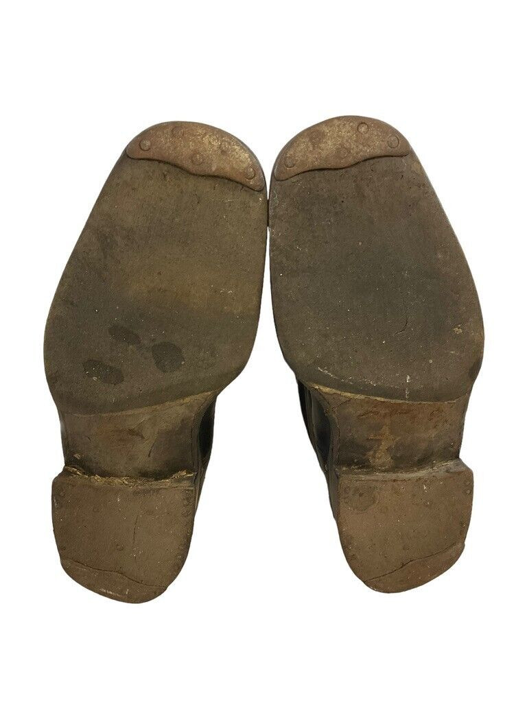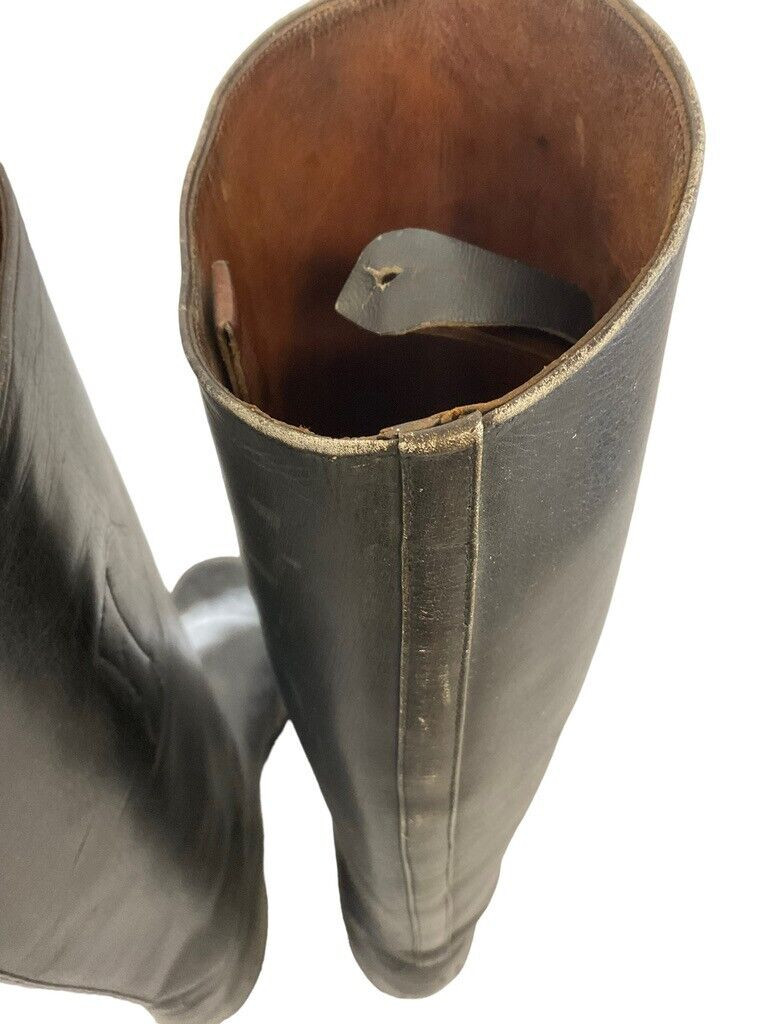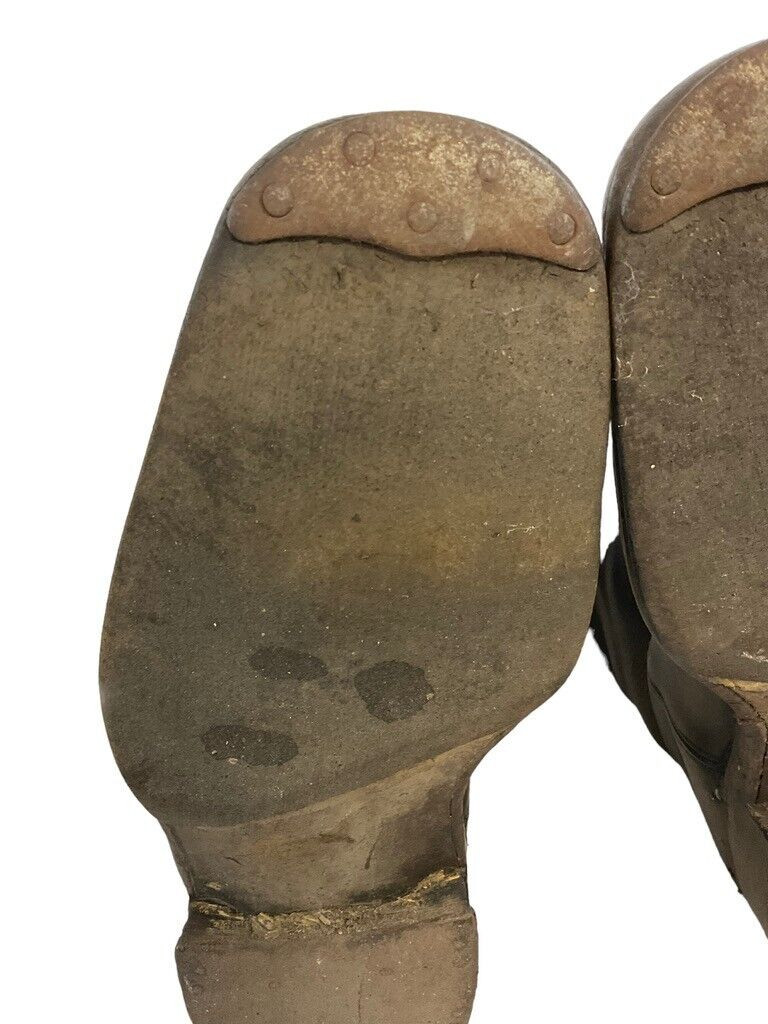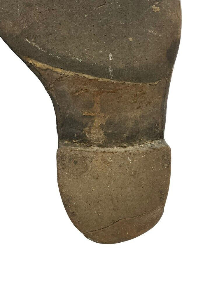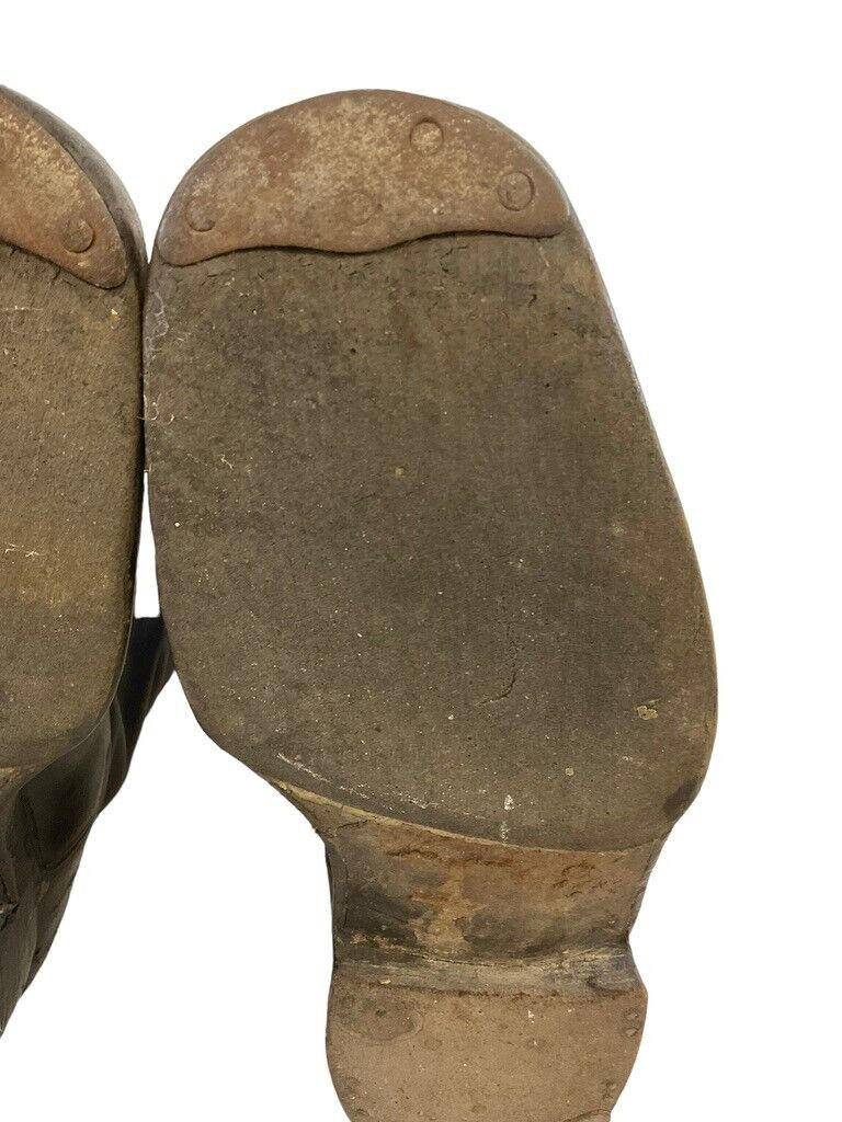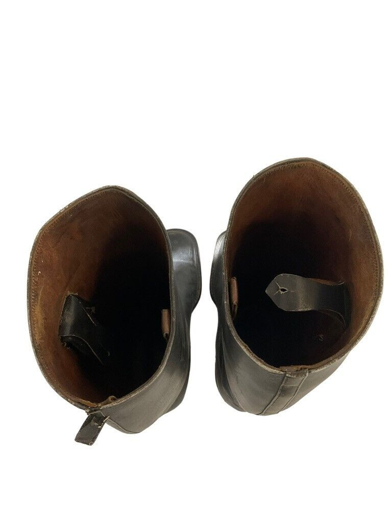 Step back in time with these authentic WW2 German Black Leather Officers Boots 2, a striking piece of military history. Crafted from high-quality black leather, these boots were designed for the distinguished officers of the German forces during World War II. They exhibit the meticulous craftsmanship and durability necessary for both the rigors of battle and the formality of military parades. Featuring a sleek, commanding design with sturdy soles and reinforced stitching, these boots not only embody the functionality required by officers but also their status and authority. Whether you are a history enthusiast, a vintage fashion collector, or a reenactor, these boots offer a tangible connection to the past. Preserve a piece of history and let these remarkable boots step into your collection.