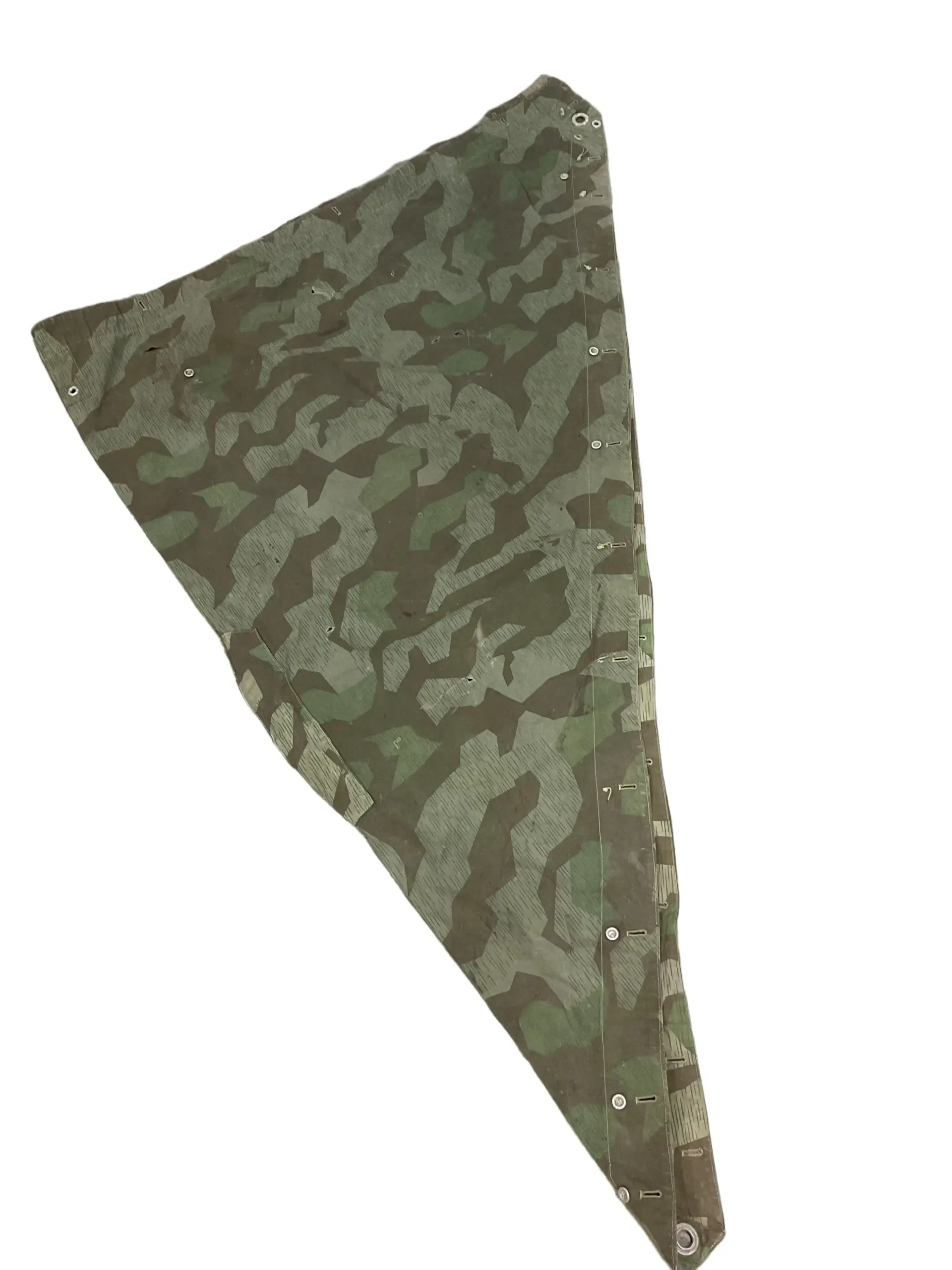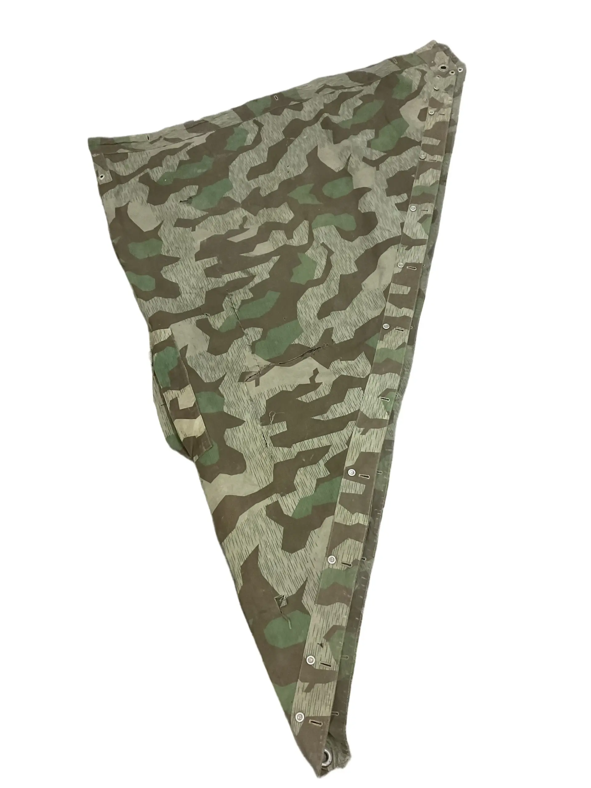 The WW2 German Camouflage Zeltbahn Ground Sheet is a multi-purpose piece of military equipment issued to German soldiers during the Second World War. Made from water-resistant cotton fabric, this ground sheet features the distinctive Wehrmacht camouflage patterns that were introduced in the 1930s to enhance concealment in various environments. The Zeltbahn is characterized by its triangular shape, metal grommets along the edges, and button closures. These features allowed multiple sheets to be connected together, forming shelters, tents, or larger covers as needed. In addition to use as a shelter quarter, the Zeltbahn served as a rain poncho, groundsheet, or improvised stretcher. Its design reflects the emphasis on versatility and adaptability in German military equipment of the era. Original examples may show period markings, manufacturer stamps, or date codes. The Zeltbahn is regarded as an iconic and practical component of WW2 German field gear.