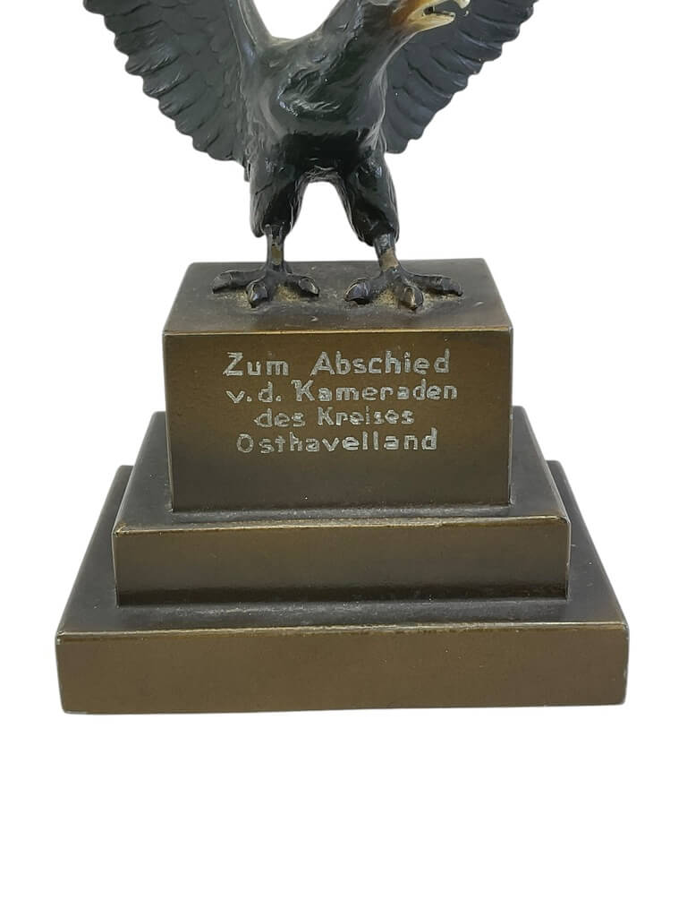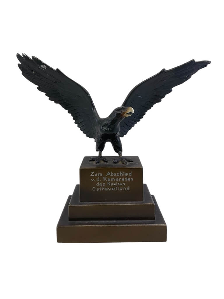 This item, titled ‘WW2 German Desk Eagle Non-Portable Award Named’, is a unique piece of World War II memorabilia. It’s a meticulously crafted, non-portable desk eagle, which was often awarded to high-ranking officers in the German military for their distinguished service. The eagle, which is an iconic symbol of the German Reich, is meticulously detailed, showcasing the superior craftsmanship of the era. This particular item also has a distinct feature – it is named, meaning it was specifically commissioned for an individual, adding to its historical significance and value. This award not only serves as a tangible connection to a crucial period in world history but also offers a glimpse into the intricate military traditions of the German forces during World War II.