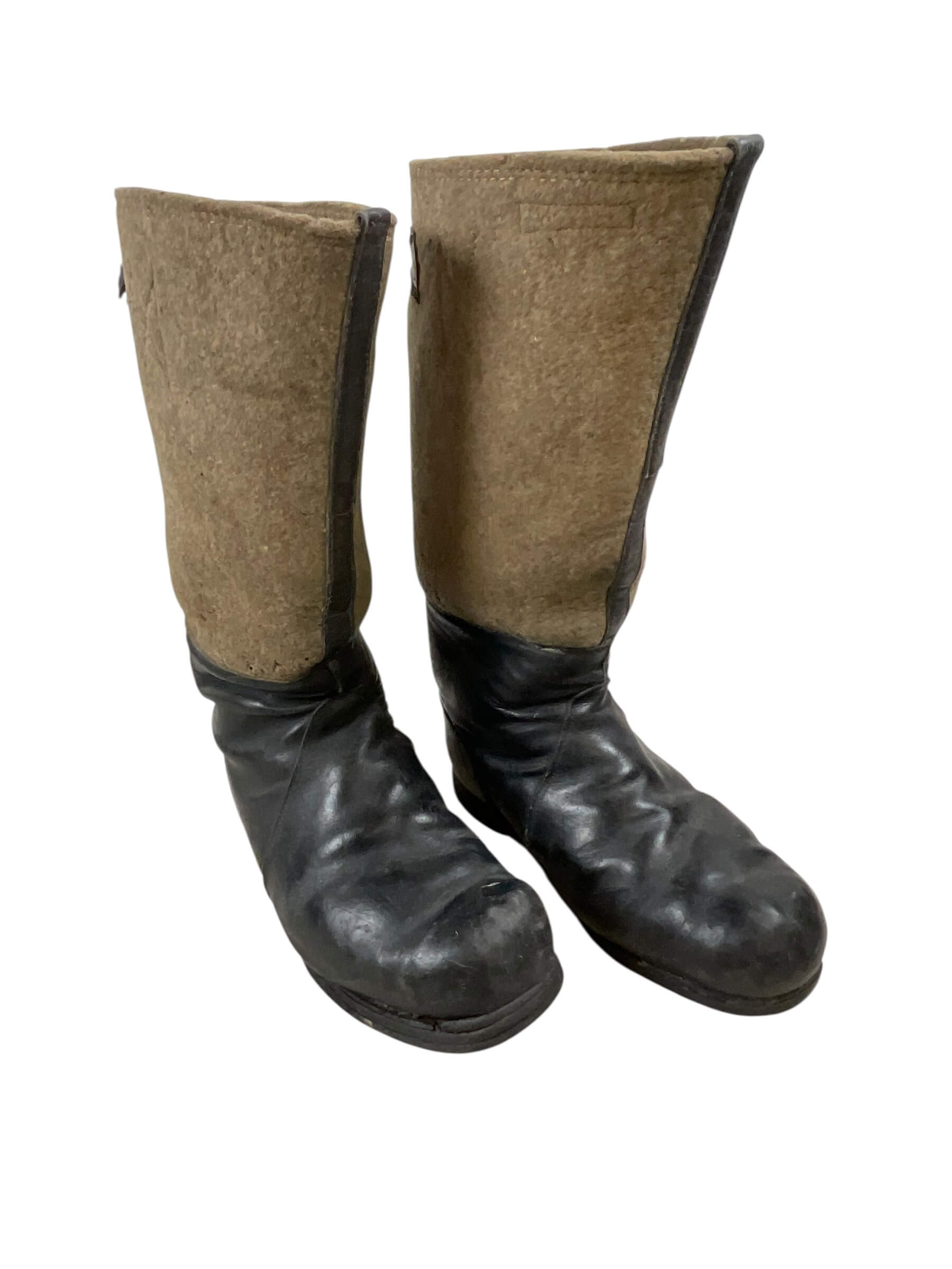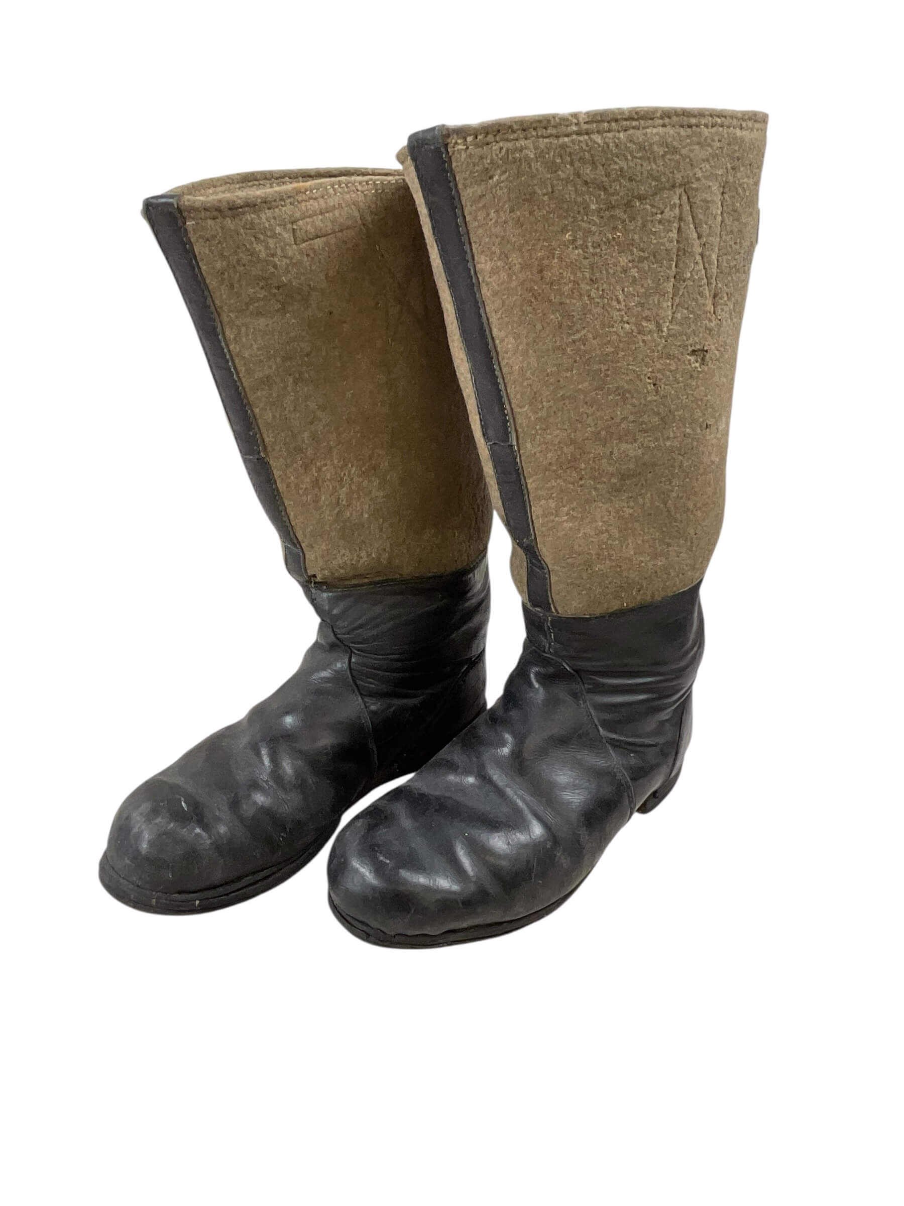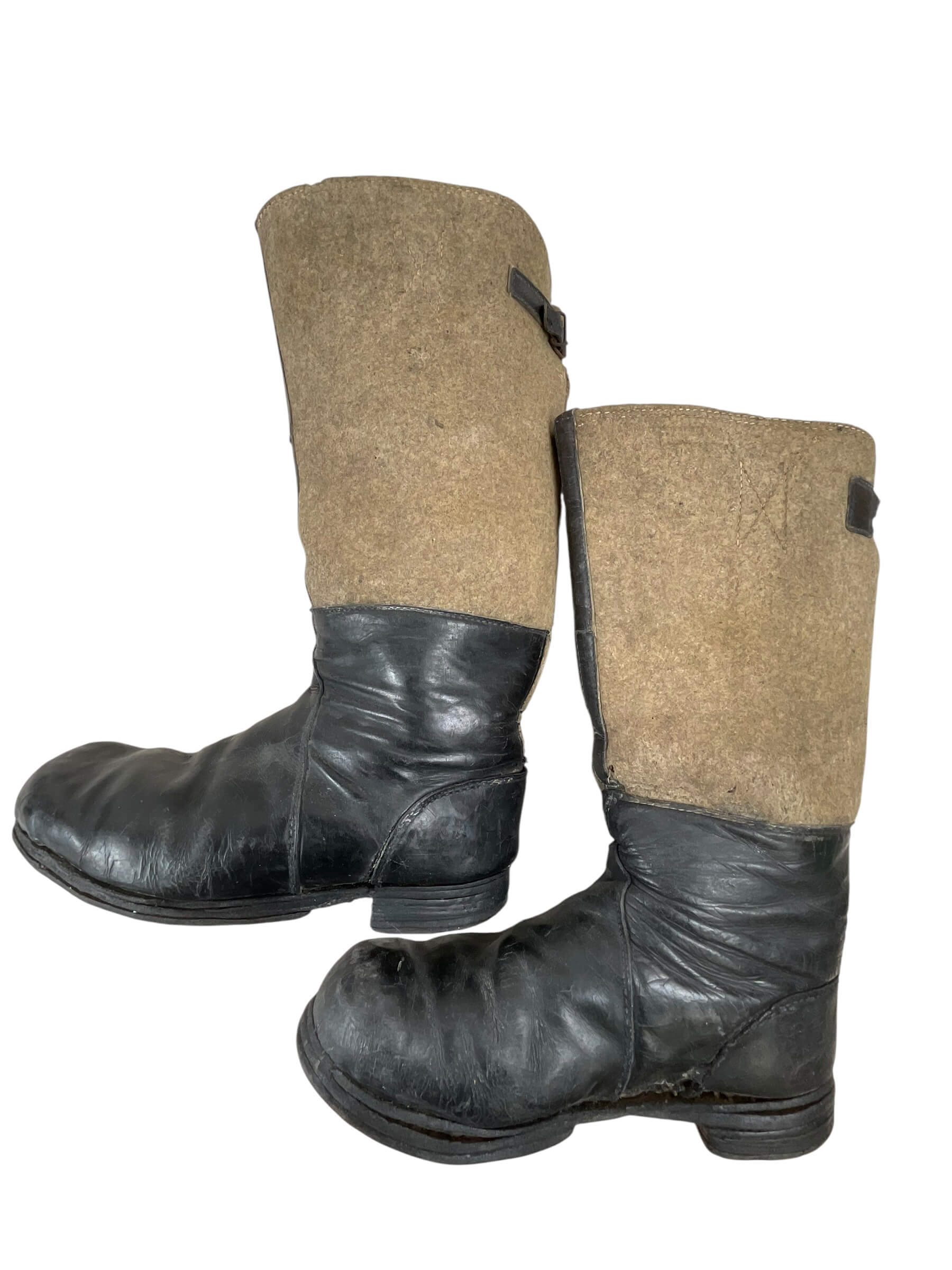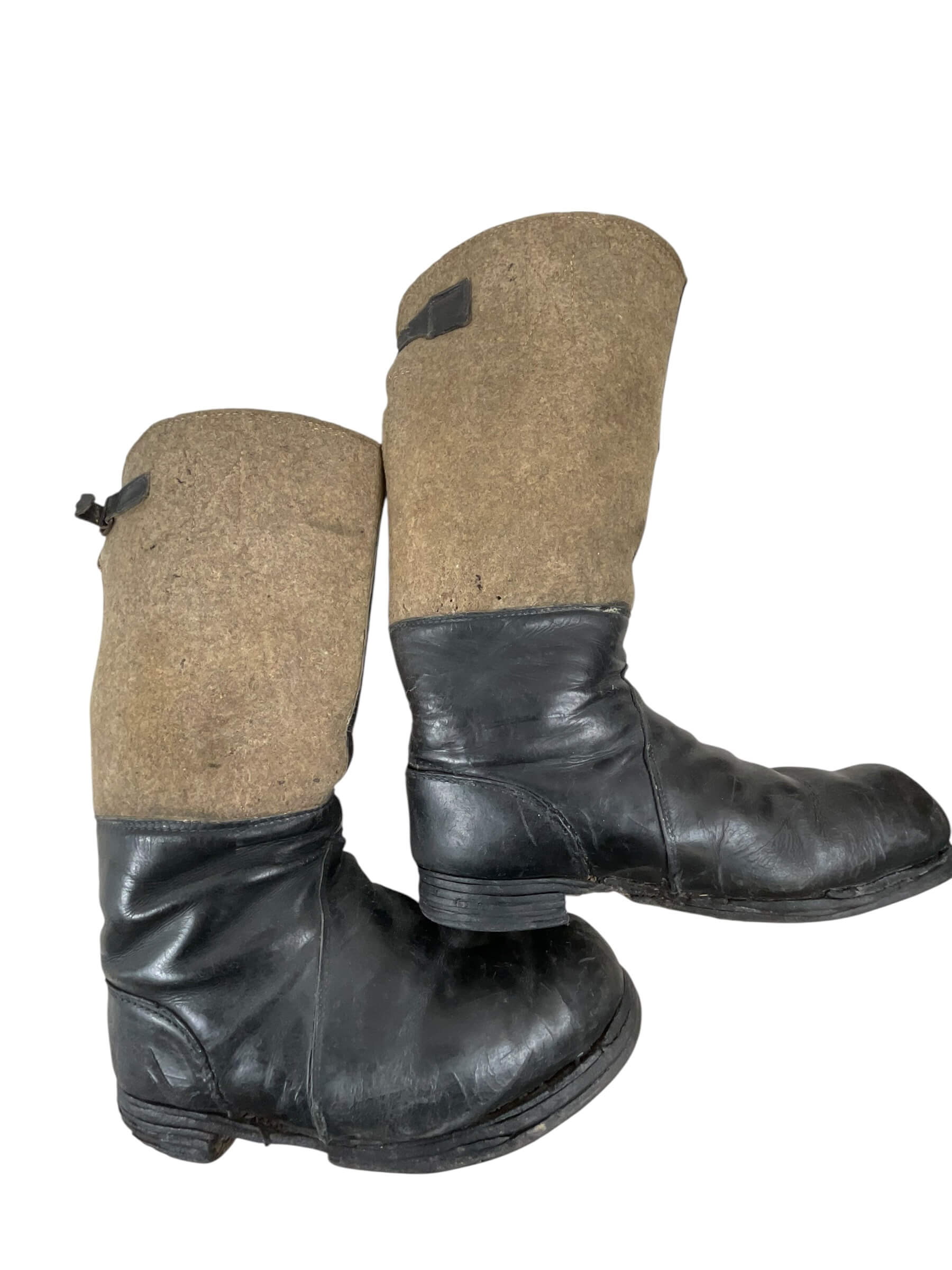 WW2 German Eastern Front Boots are military footwear originally issued to German soldiers deployed on the Eastern Front during the Second World War. These boots are distinguished by their robust construction, typically made from thick leather designed to provide durability and insulation against harsh winter conditions often encountered in Eastern Europe. The design features a high shaft, reaching up to the mid-calf, and may include hobnailed soles to improve grip on snow and muddy terrain. Some variations incorporate felt or additional lining for added warmth. Lacing systems and external heel reinforcement were common for increased foot stability. These boots were standard issue for infantry and other units operating in severe weather, reflecting the specific requirements of the Eastern Front campaigns. WW2 German Eastern Front Boots are of interest to collectors, historians, and reenactors for their historical significance and their role in the adaption of military gear to environmental challenges during the conflict.