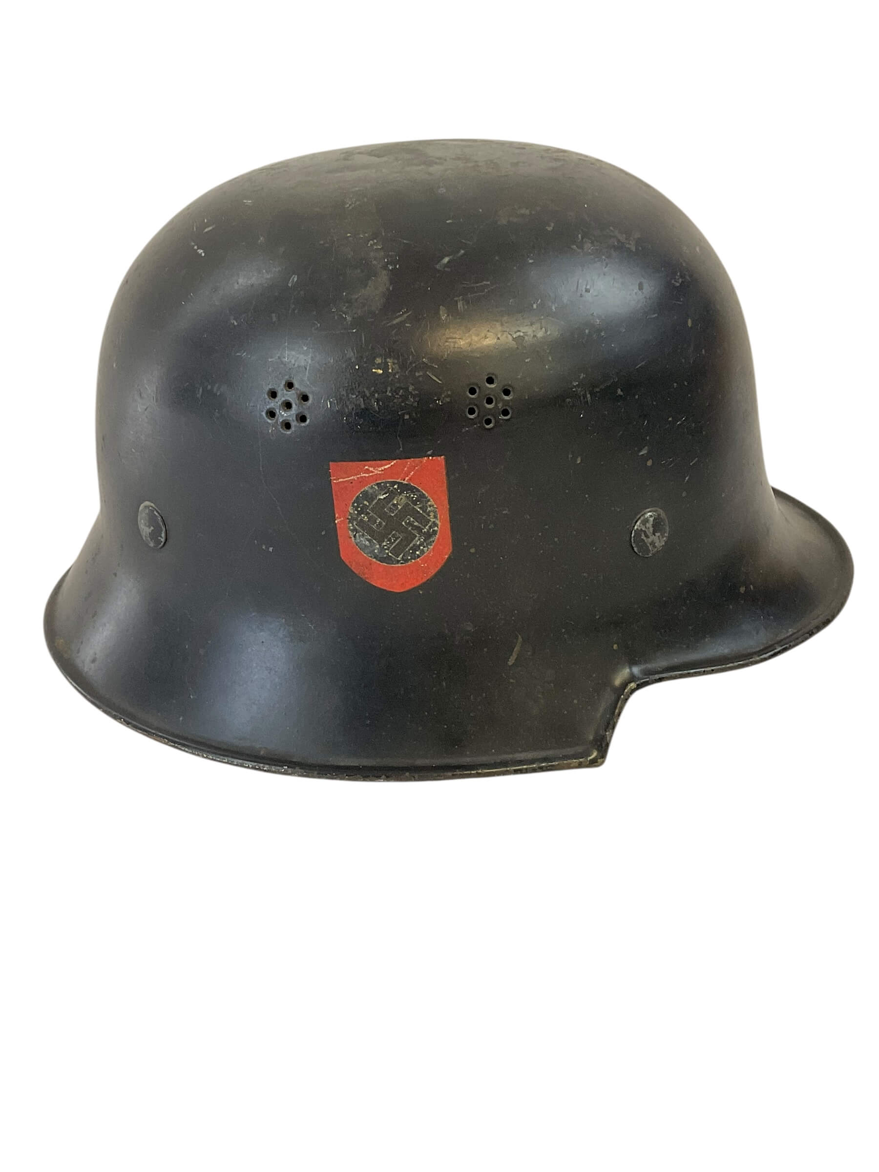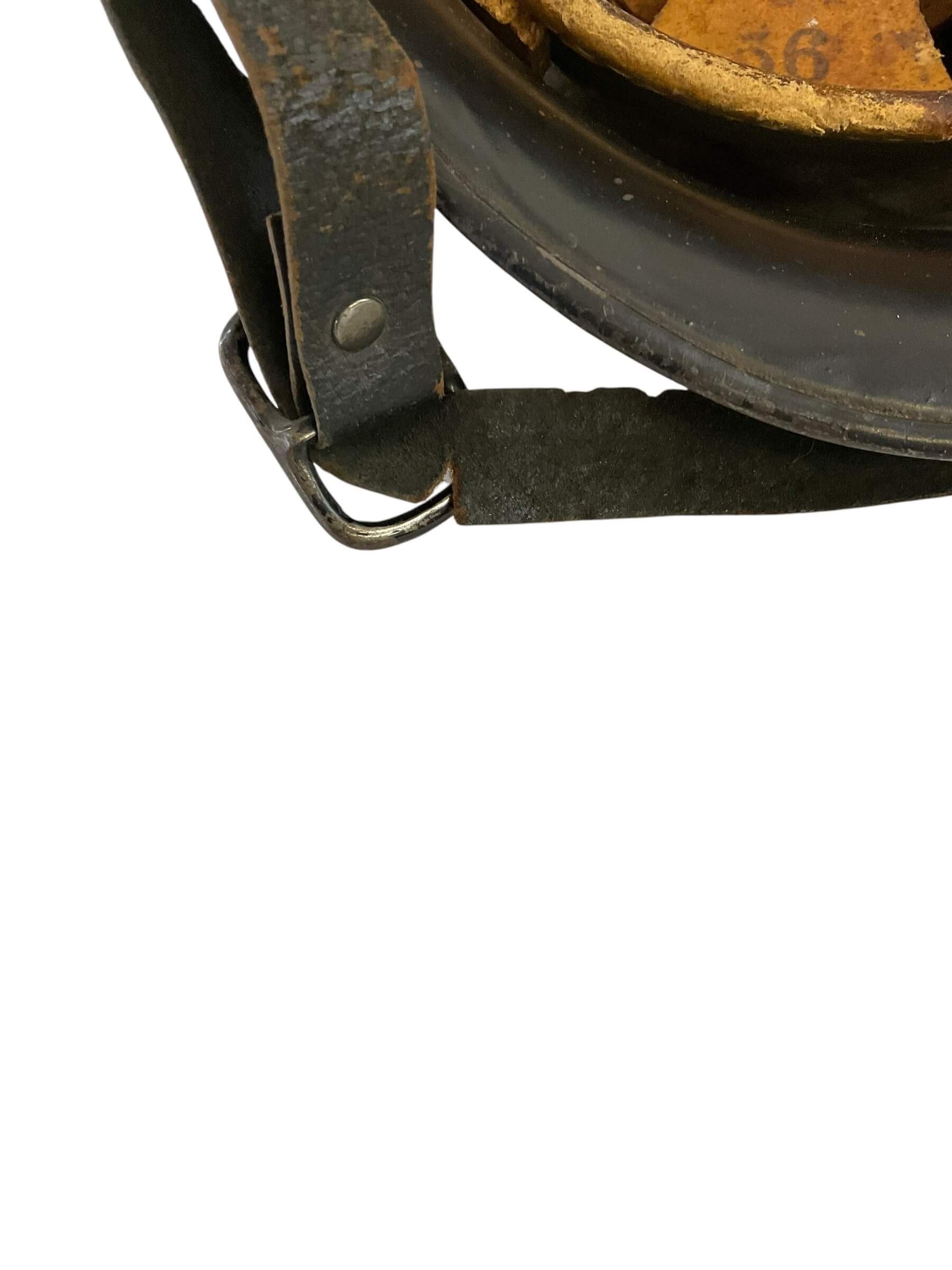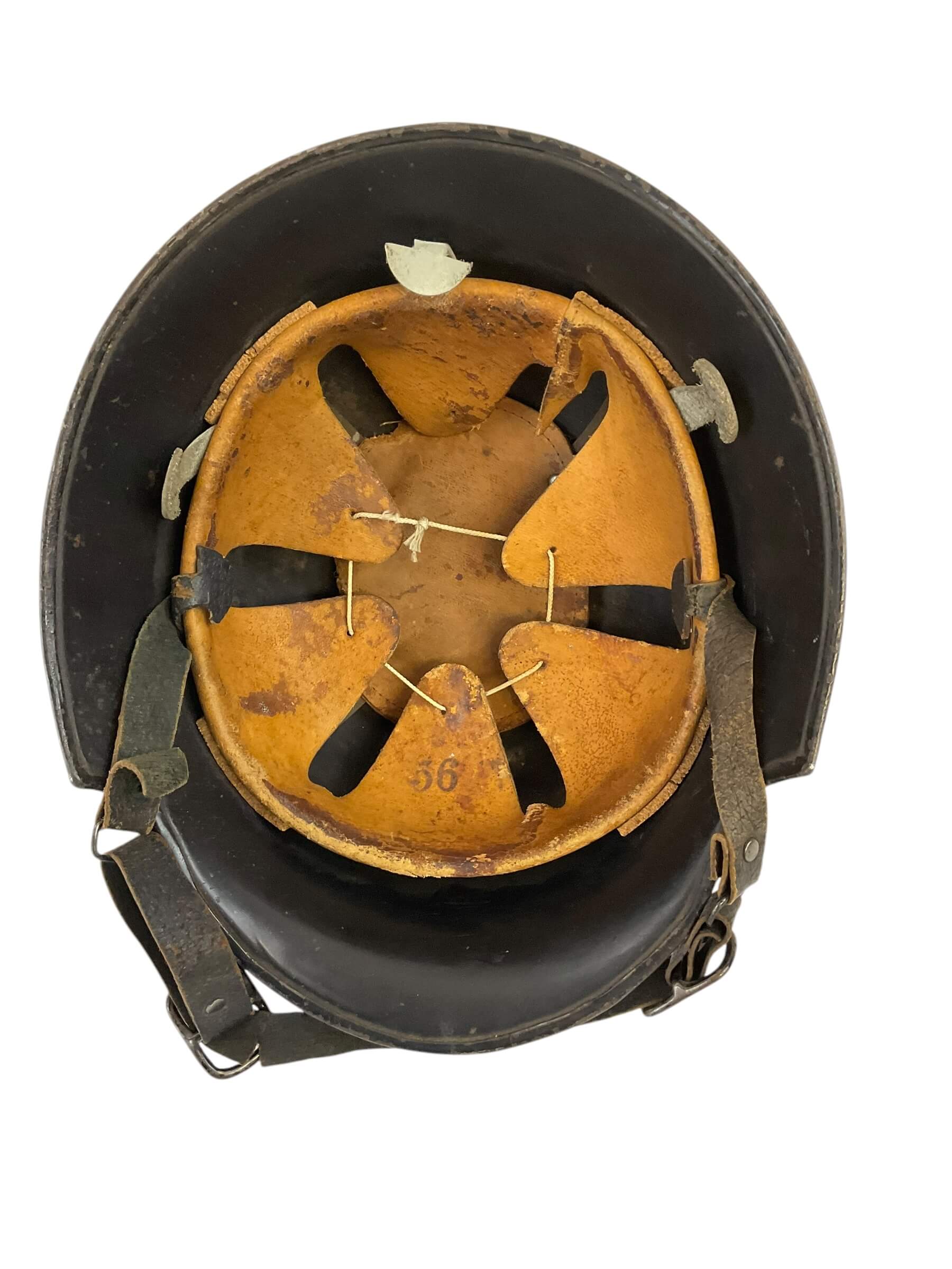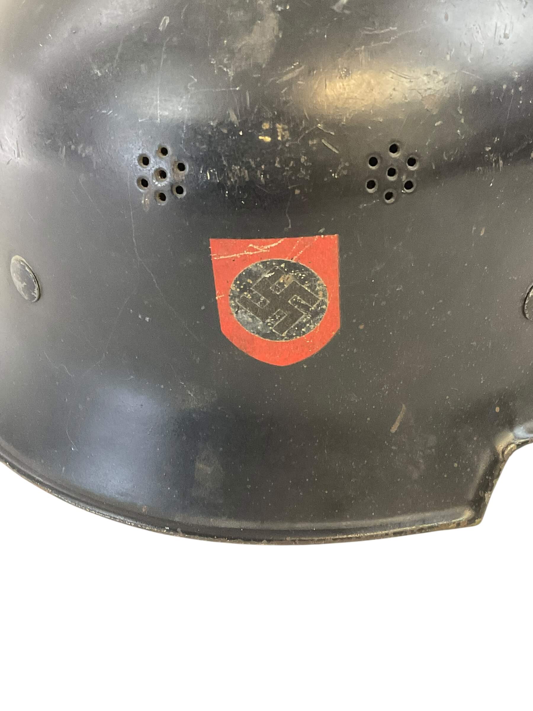 This WW2 German Fire Police Helmet Size 56 Delstah is a unique artifact from a critical period in world history. The helmet, worn by the German Fire Police during the Second World War, is a testament to the bravery of those who worked to protect lives amidst the chaos of a war-torn nation. Crafted by Delstah, a renowned manufacturer of the era, the helmet is a size 56, designed to provide a snug fit for its wearer. It features the traditional black and white color scheme of the German Fire Police, with the standard insignia emblazoned on the front. The helmet is constructed from durable materials, designed to withstand the rigors of firefighting and rescue operations. Despite its age, this helmet has been preserved in good condition, making it a valuable piece for historians, antique collectors, or WW2 enthusiasts.