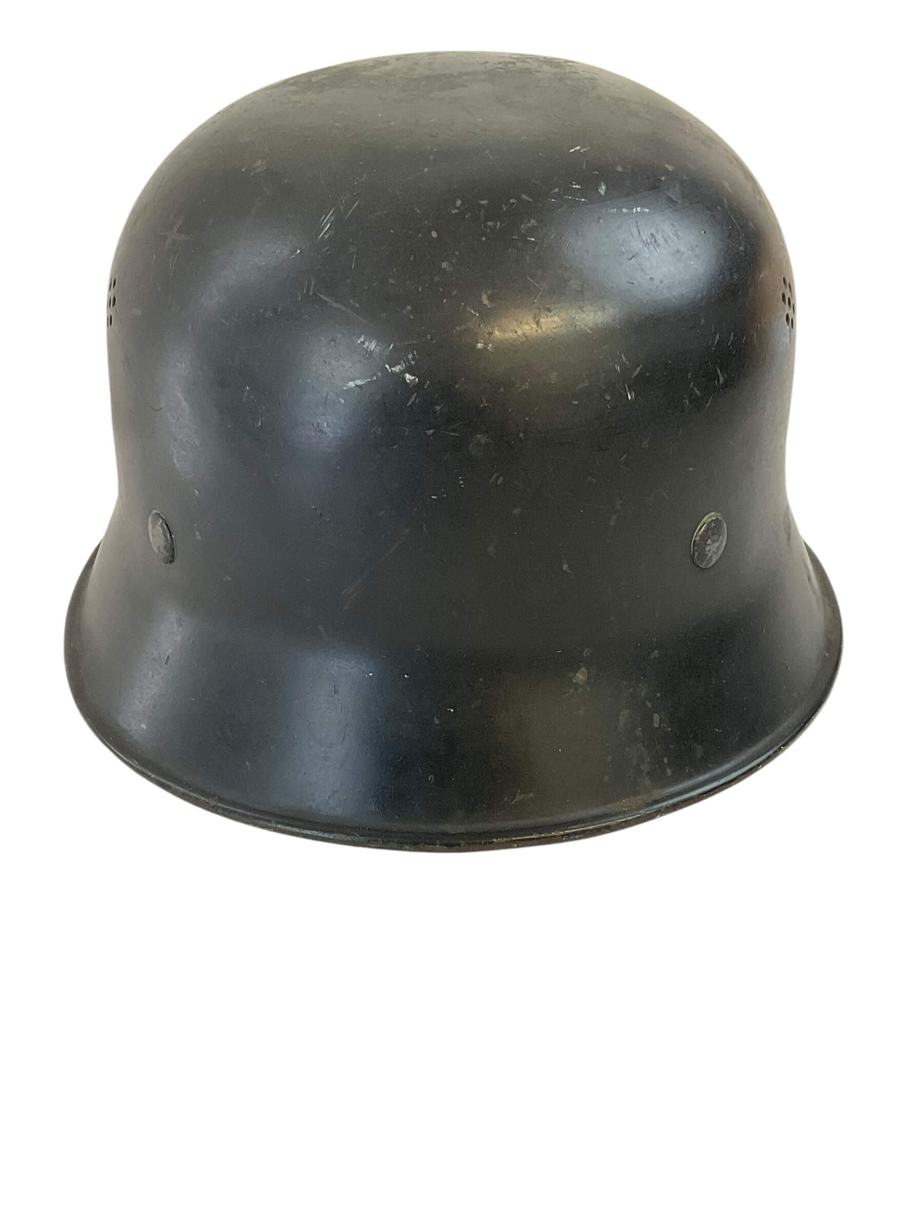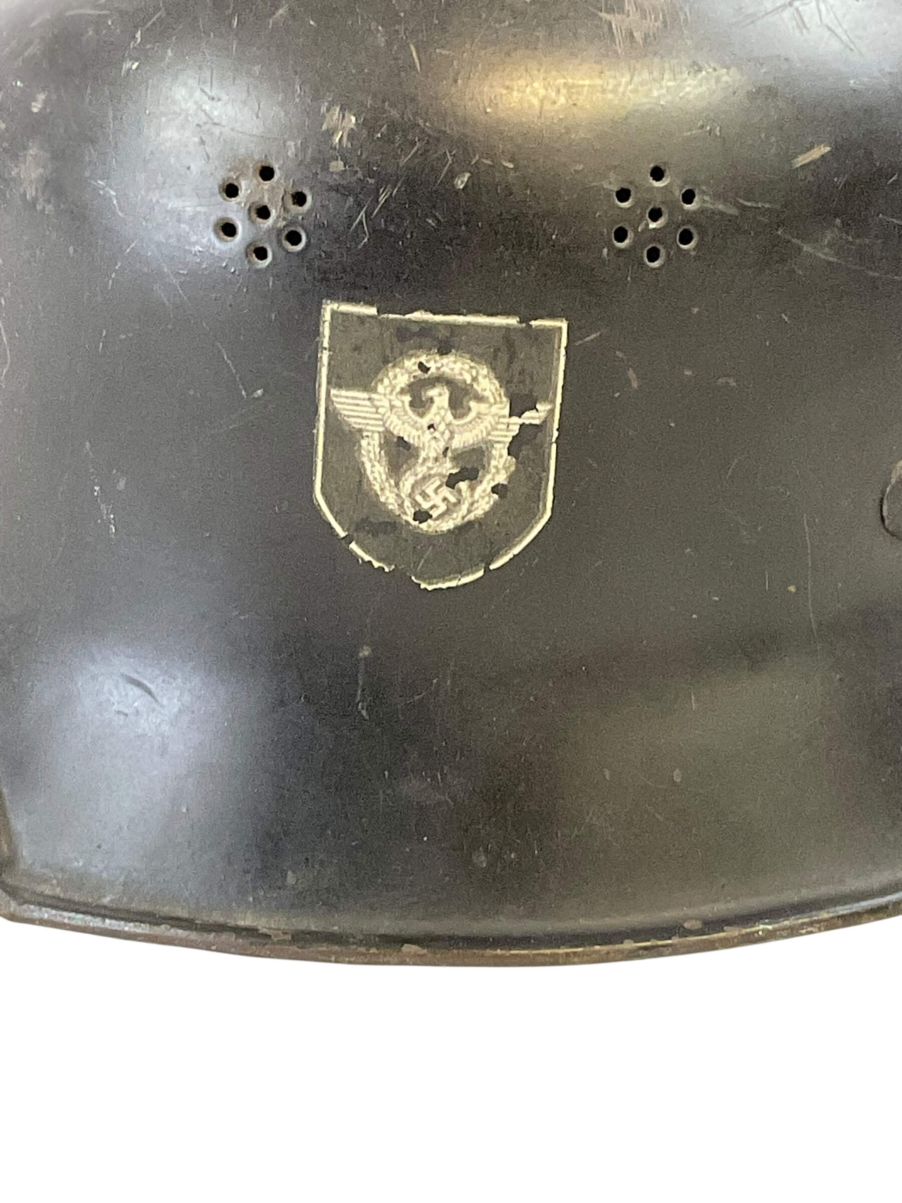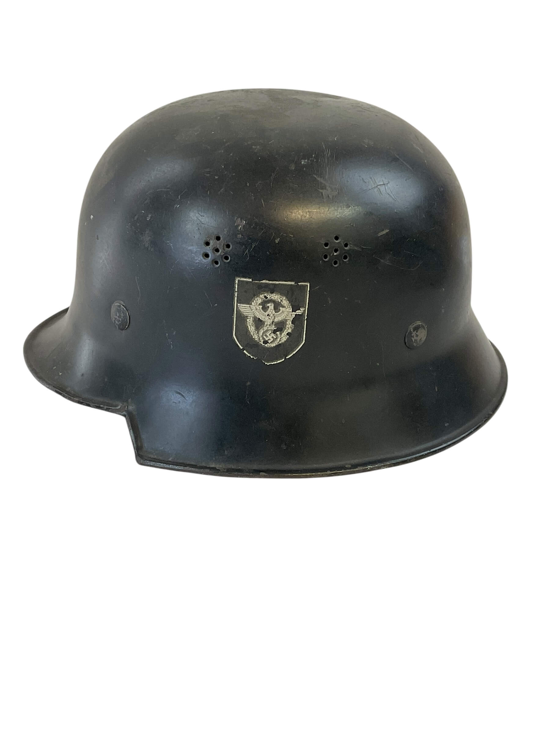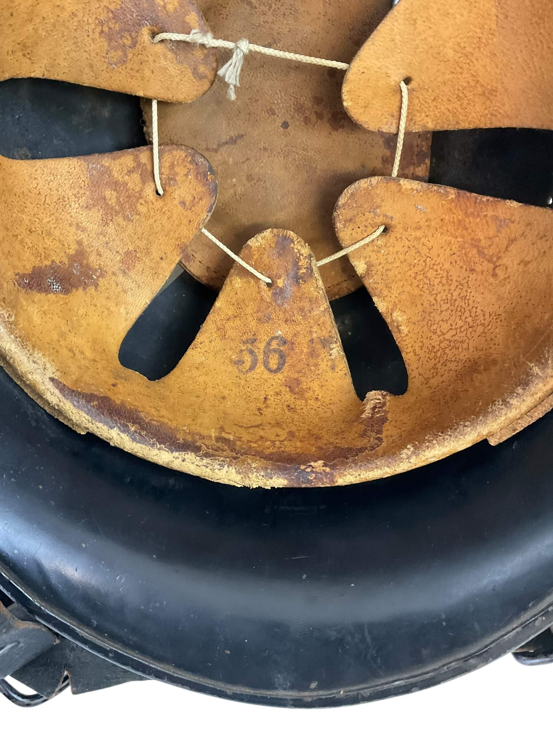 This WW2 German Fire Police Helmet Size 56 Delstah is a unique artifact from a critical period in world history. The helmet, worn by the German Fire Police during the Second World War, is a testament to the bravery of those who worked to protect lives amidst the chaos of a war-torn nation. Crafted by Delstah, a renowned manufacturer of the era, the helmet is a size 56, designed to provide a snug fit for its wearer. It features the traditional black and white color scheme of the German Fire Police, with the standard insignia emblazoned on the front. The helmet is constructed from durable materials, designed to withstand the rigors of firefighting and rescue operations. Despite its age, this helmet has been preserved in good condition, making it a valuable piece for historians, antique collectors, or WW2 enthusiasts.