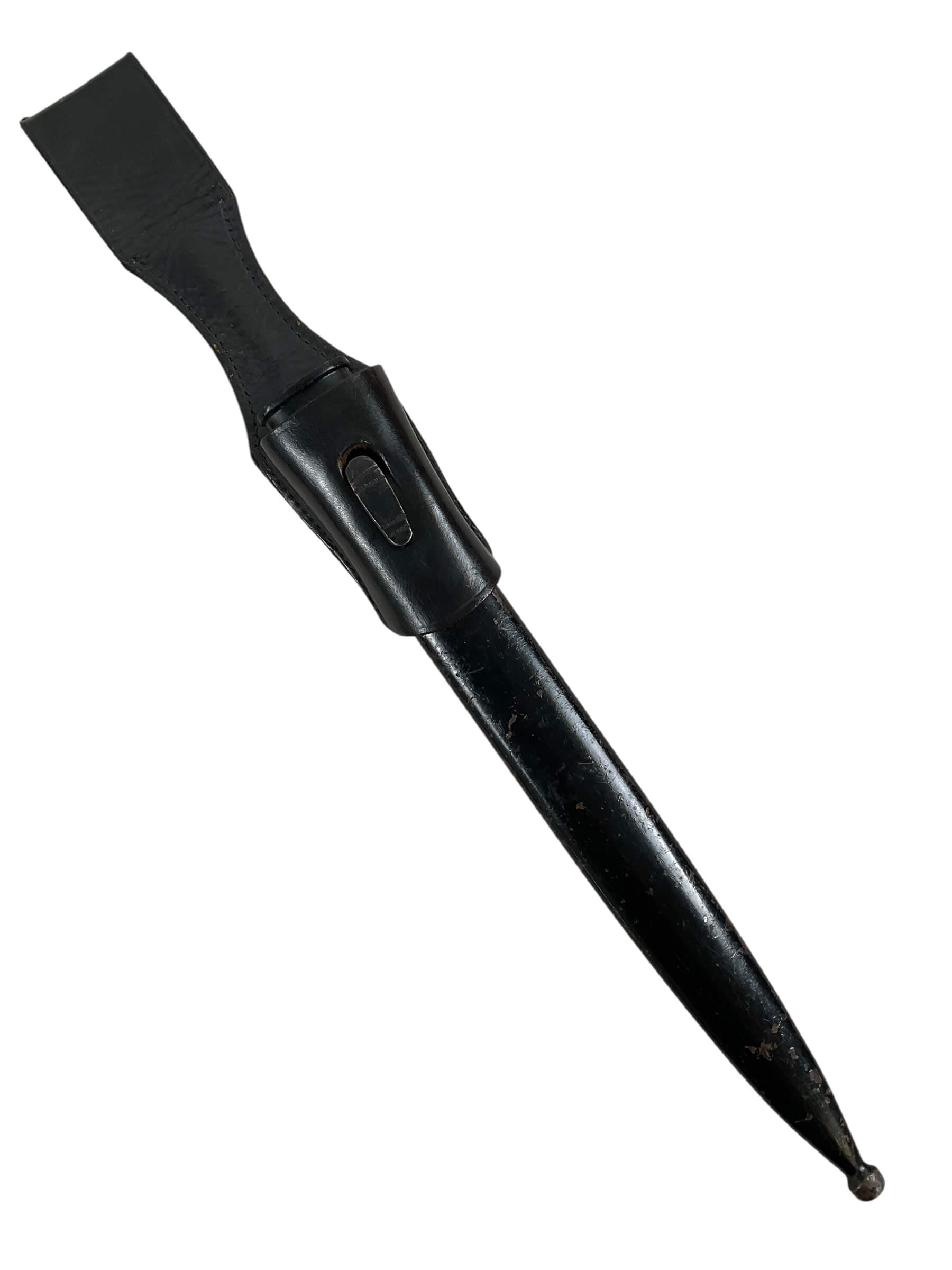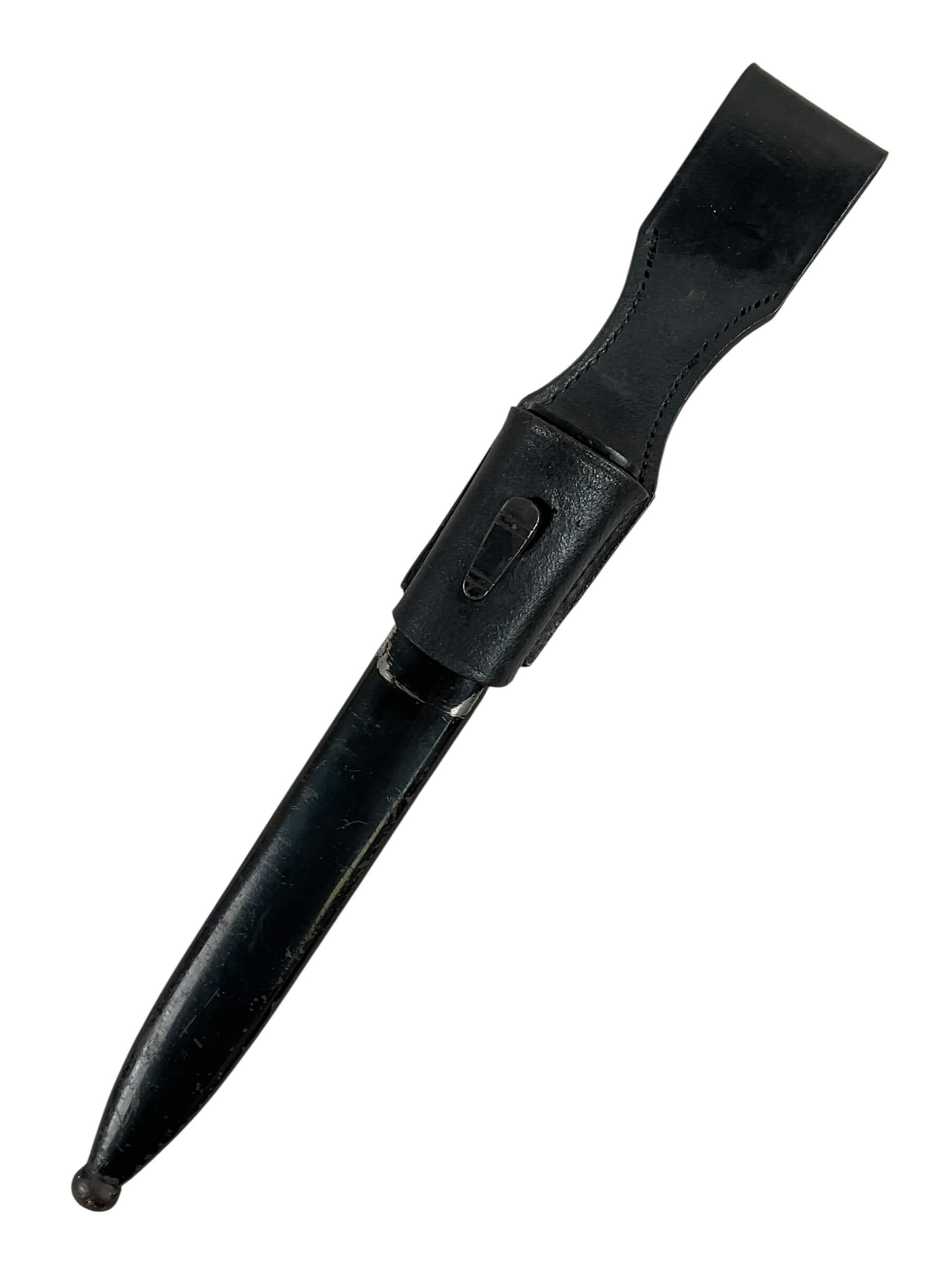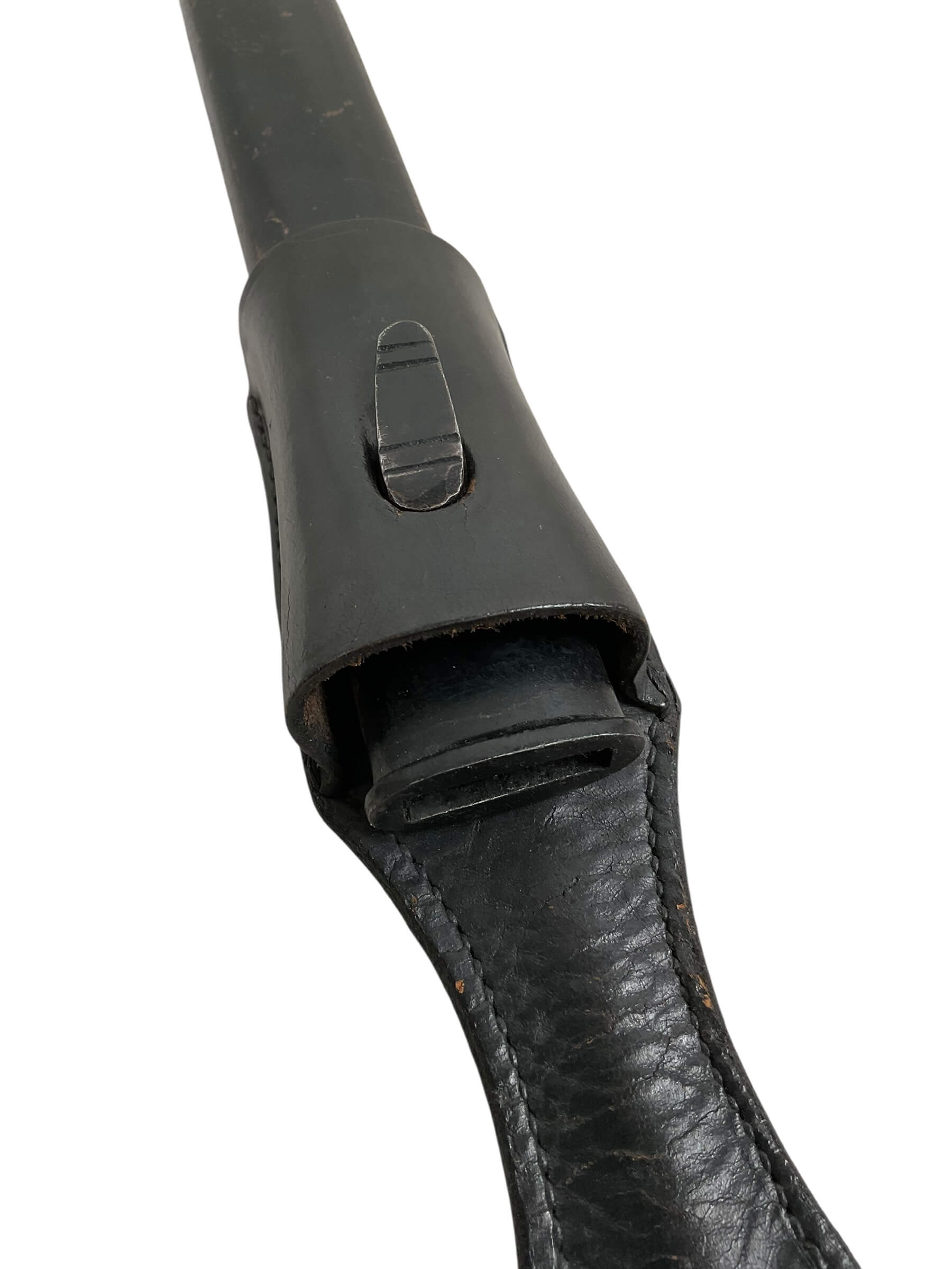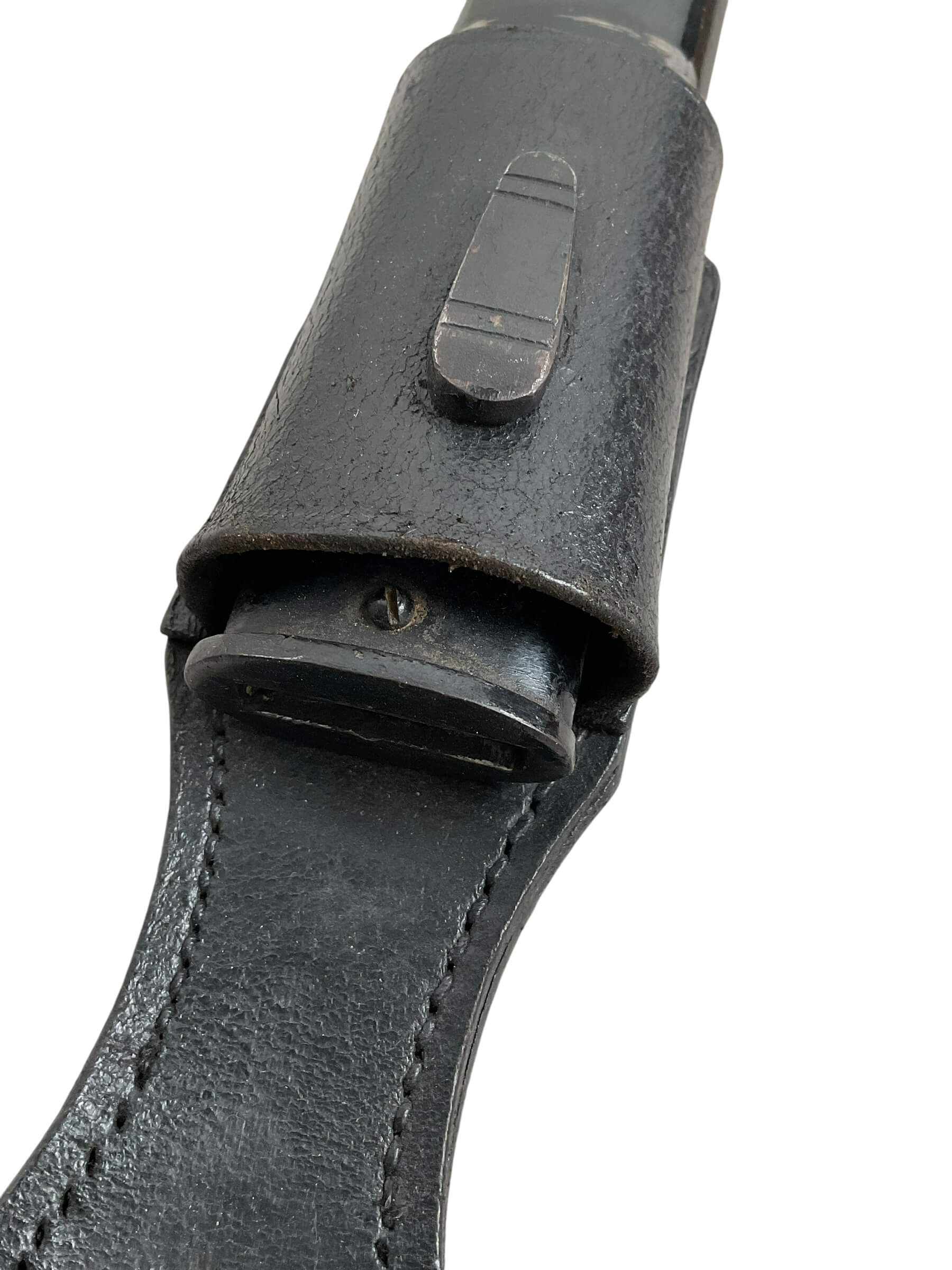 This WW2 German Fireman’s Dress Bayonet with Frog is an authentic piece of historical memorabilia. The bayonet, designed specifically for the German fire brigades during the Second World War, is a testament to the unique military aesthetics of the era. The handle is meticulously crafted, with an intricately detailed grip. The blade is unsharpened, as per tradition for dress bayonets, signifying its ceremonial use. The included frog, a type of sheath for the bayonet, is made from high-quality leather, reflecting the standard of German craftsmanship. This collectible item is steeped in history, representing a specific facet of the German uniform during a significant period. It is an intriguing artifact for any collector with an interest in military history or World War II artifacts.