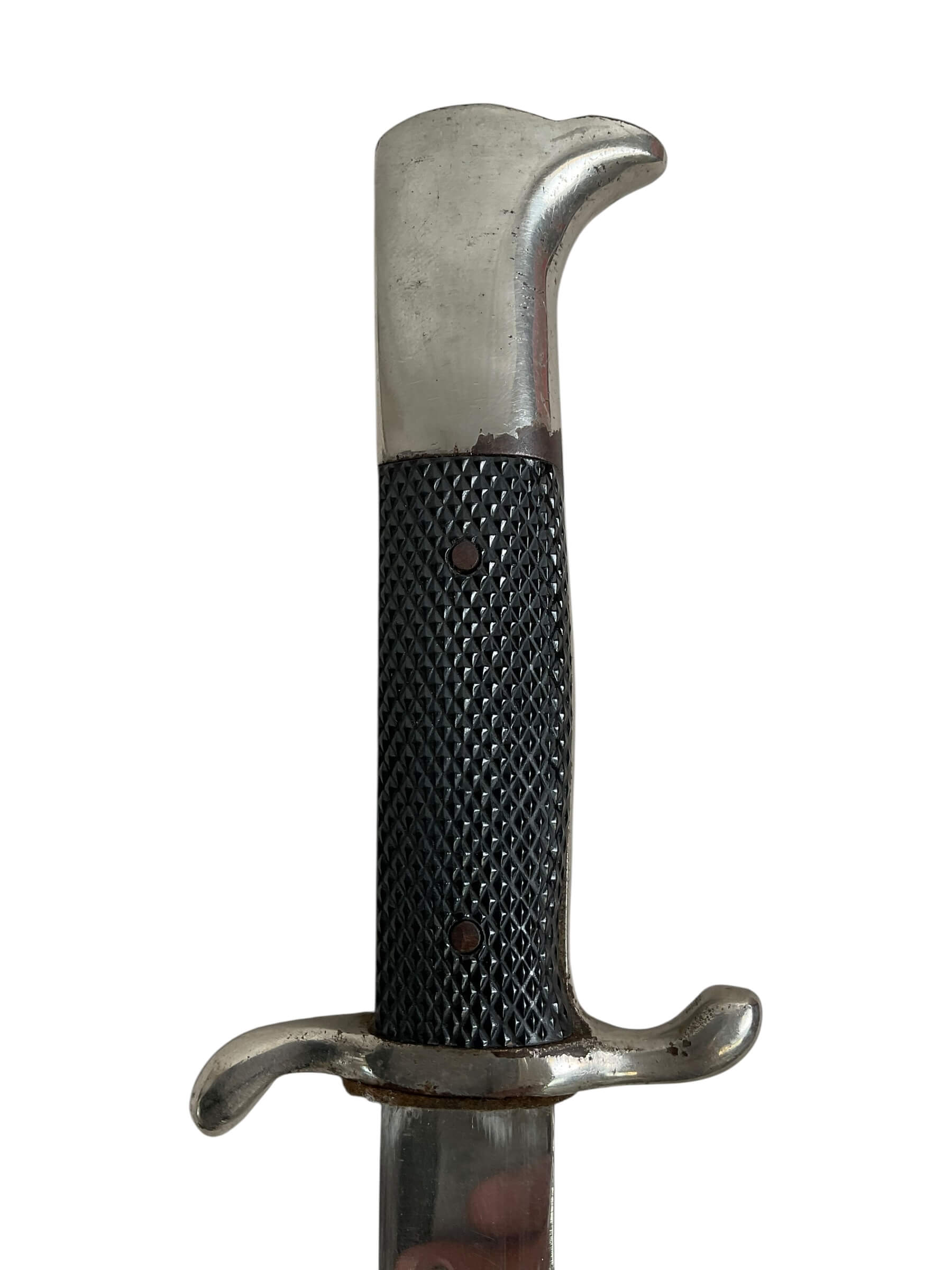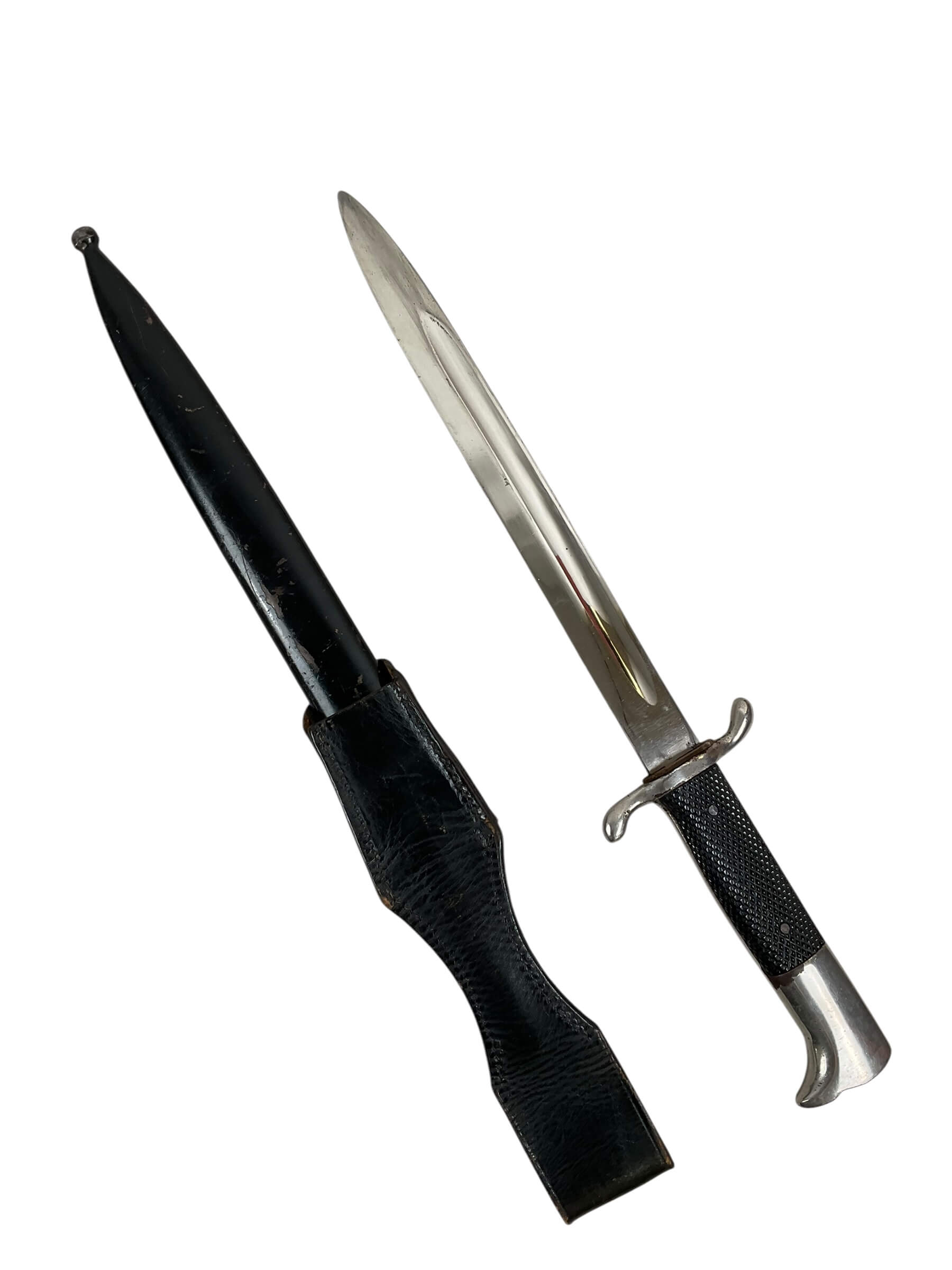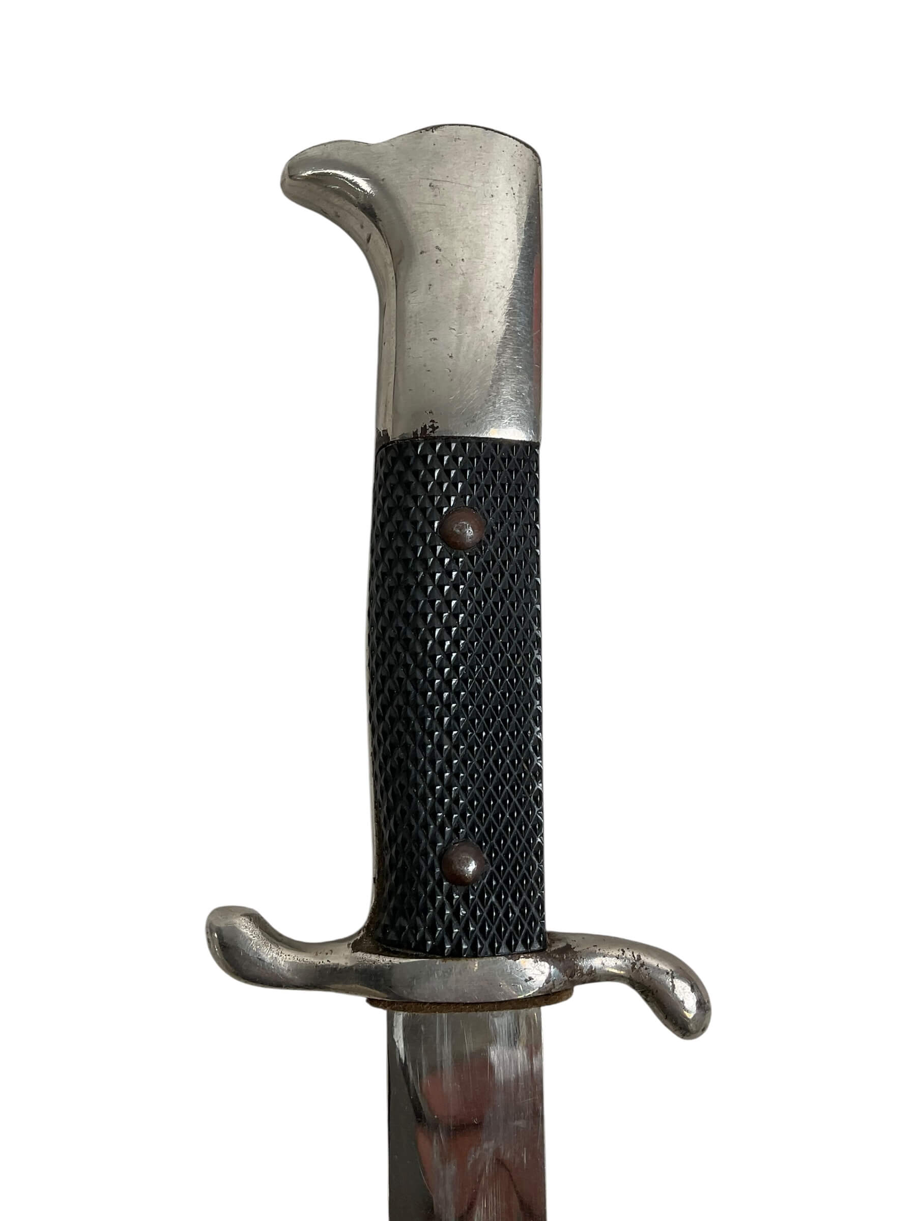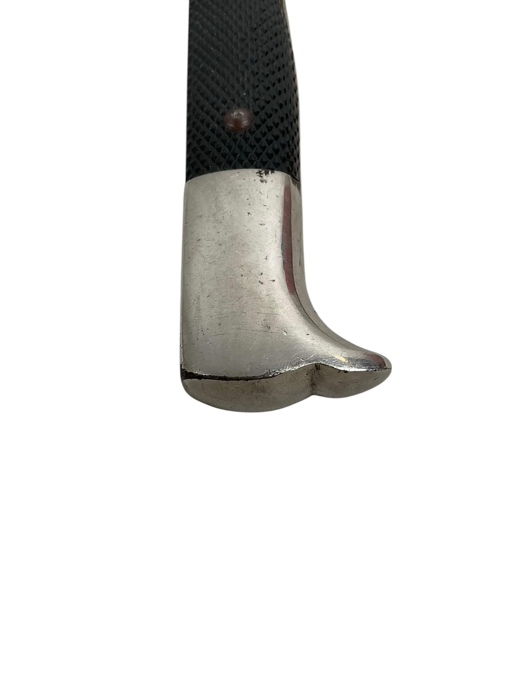 This WW2 German Fireman’s Dress Bayonet with Frog is an authentic piece of historical memorabilia. The bayonet, designed specifically for the German fire brigades during the Second World War, is a testament to the unique military aesthetics of the era. The handle is meticulously crafted, with an intricately detailed grip. The blade is unsharpened, as per tradition for dress bayonets, signifying its ceremonial use. The included frog, a type of sheath for the bayonet, is made from high-quality leather, reflecting the standard of German craftsmanship. This collectible item is steeped in history, representing a specific facet of the German uniform during a significant period. It is an intriguing artifact for any collector with an interest in military history or World War II artifacts.