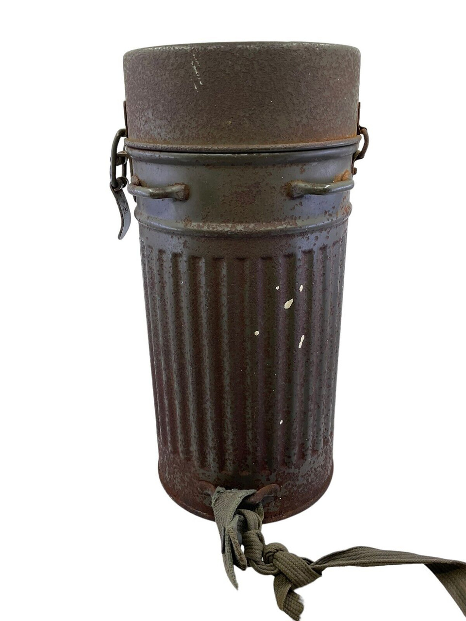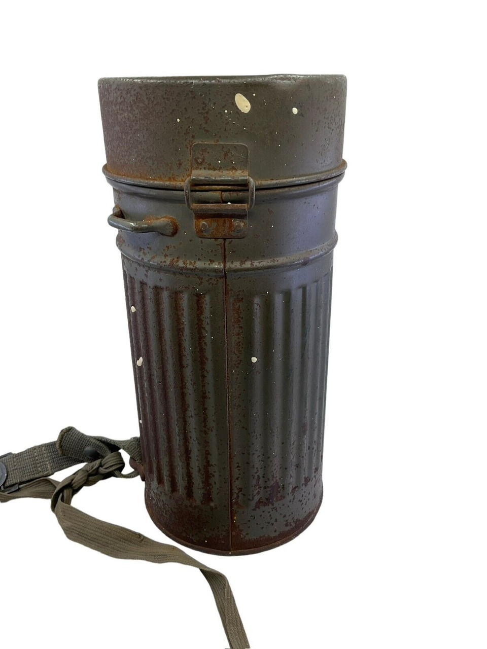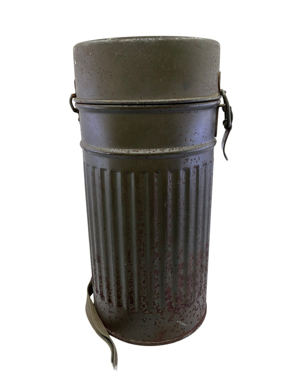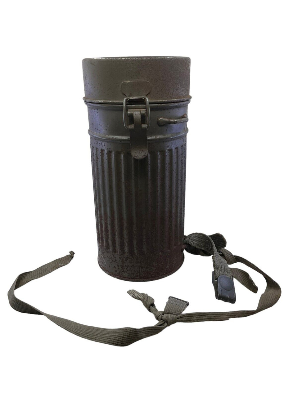 The WW2 German Gas Mask Tin Auer, now available without its original contents, is a poignant piece of military history. This tin, once housing a crucial protective gas mask, exemplifies the design and practicality of wartime equipment used by German soldiers during World War II. Crafted from sturdy metal, it features the typical cylindrical shape with secure clasps and a carrying strap, ensuring it would have been easy to transport during the chaos of battle. Its wear and patina speak volumes about its journey through time, making it a tangible link to the past. Although the gas mask itself is no longer included, the tin serves as an evocative relic for collectors, historians, or enthusiasts of military memorabilia, offering a unique glimpse into the everyday lives of those who served on the front lines. Perfect for display or study, this empty tin continues to tell the story of its era.