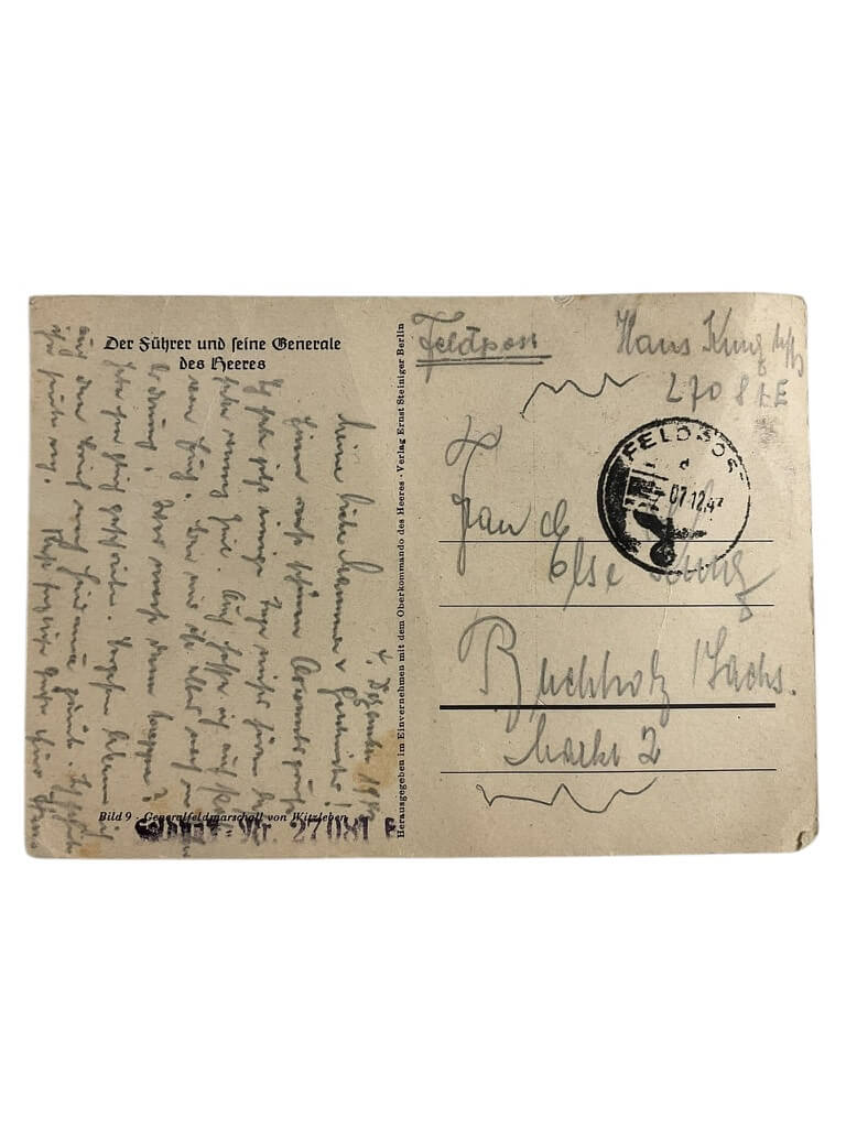 The WW2 German Generals Photograph Postcard is a period artifact measuring 4 by 6 inches. Dated 1942, this postcard features an original photographic image of German military generals during the Second World War. The photograph presents uniformed officers in formal attire, reflecting the military hierarchy and command structure of the German armed forces at that time. The date inscribed on the postcard situates it within the active years of World War II, providing historical context related to the German military operations of 1942. Such items were commonly circulated during the era, either as collectibles or as a means of documenting key personnel and moments within the German military. This postcard offers insight into wartime photographic practices and serves as a historical record of military leadership during a significant period of twentieth-century history. The piece is suitable for collectors and researchers interested in World War II memorabilia or German military history.