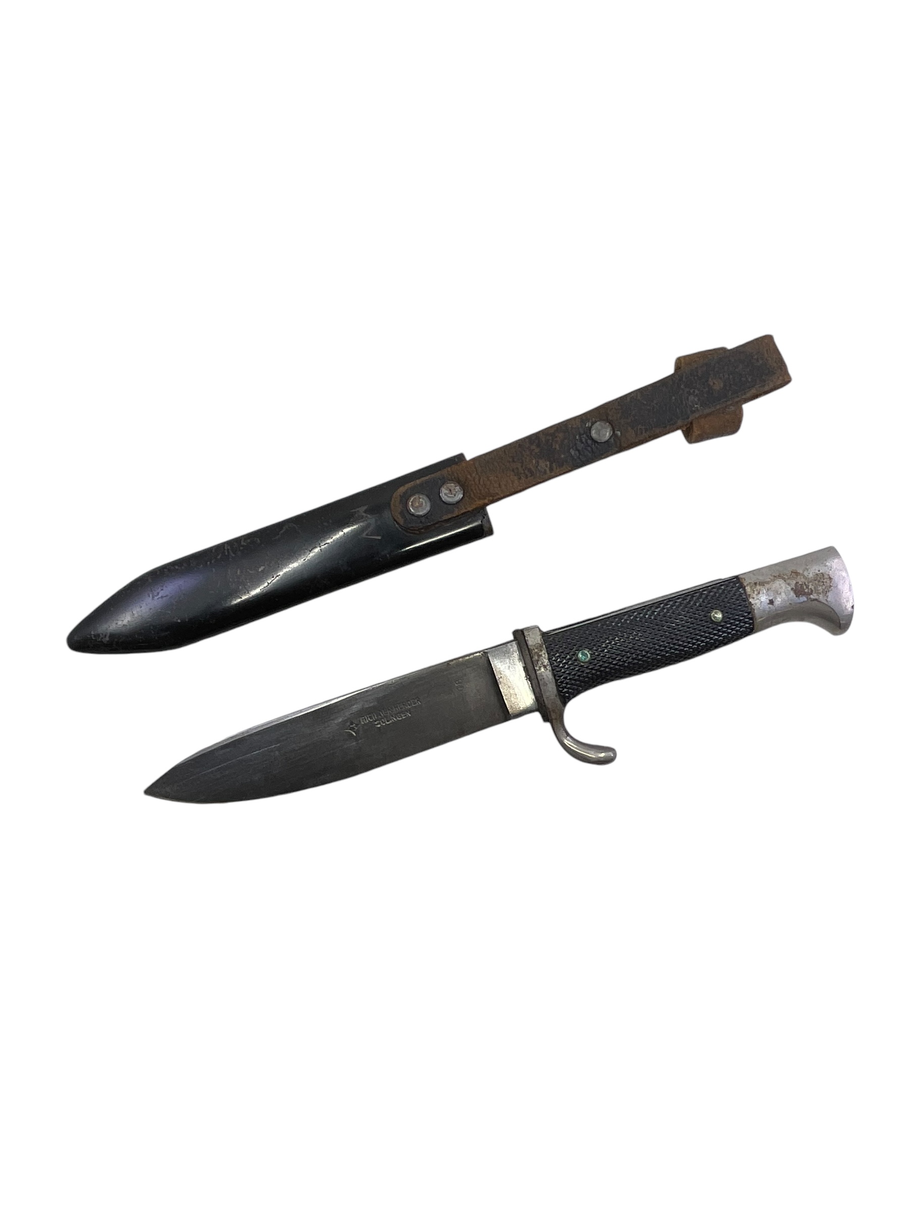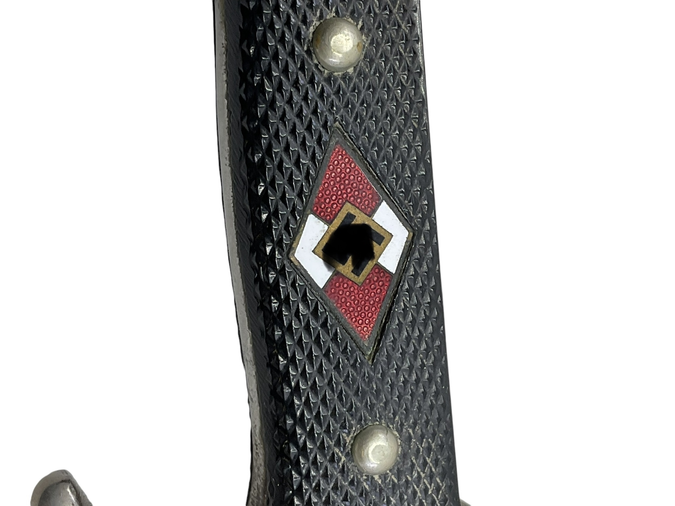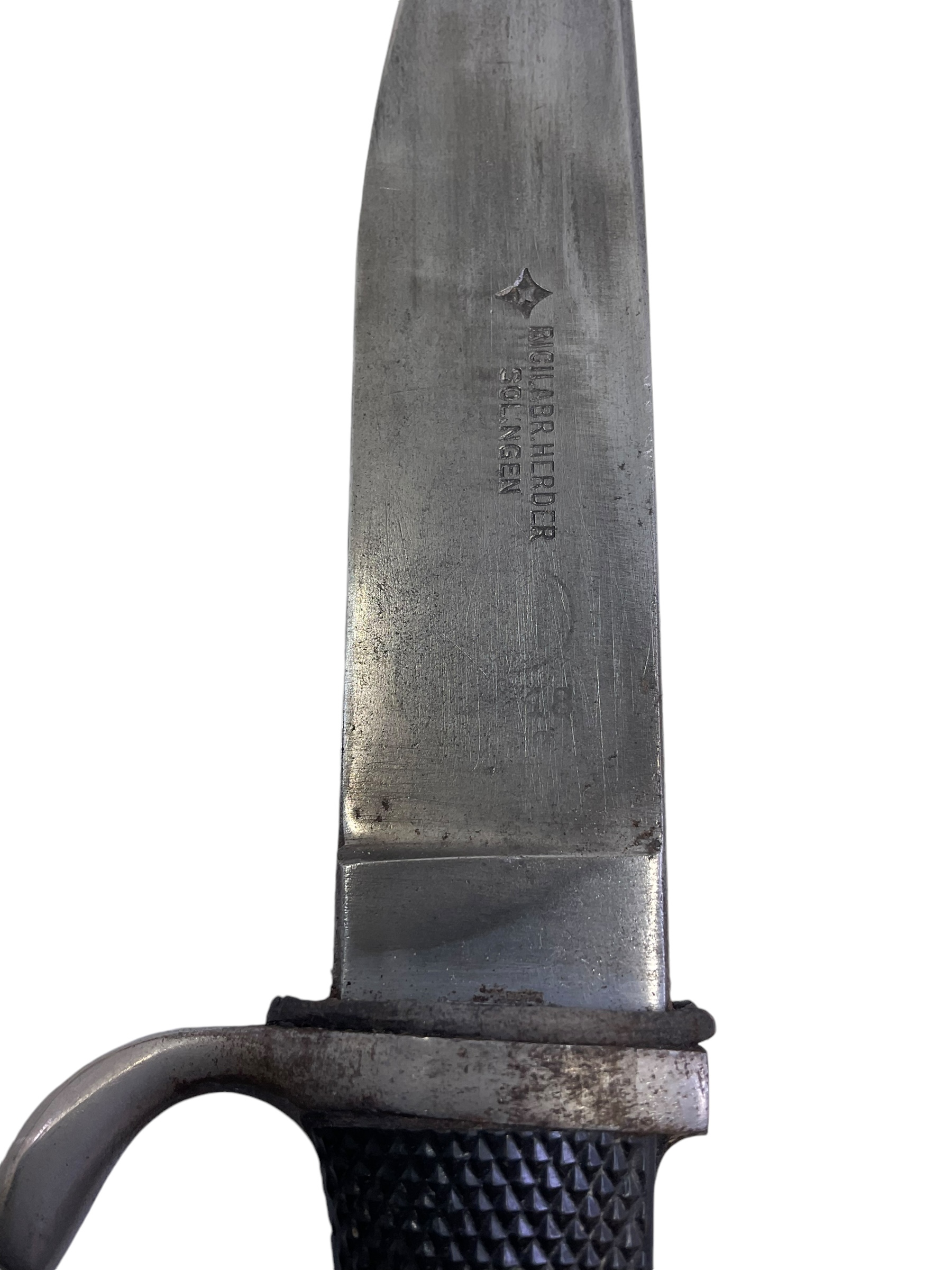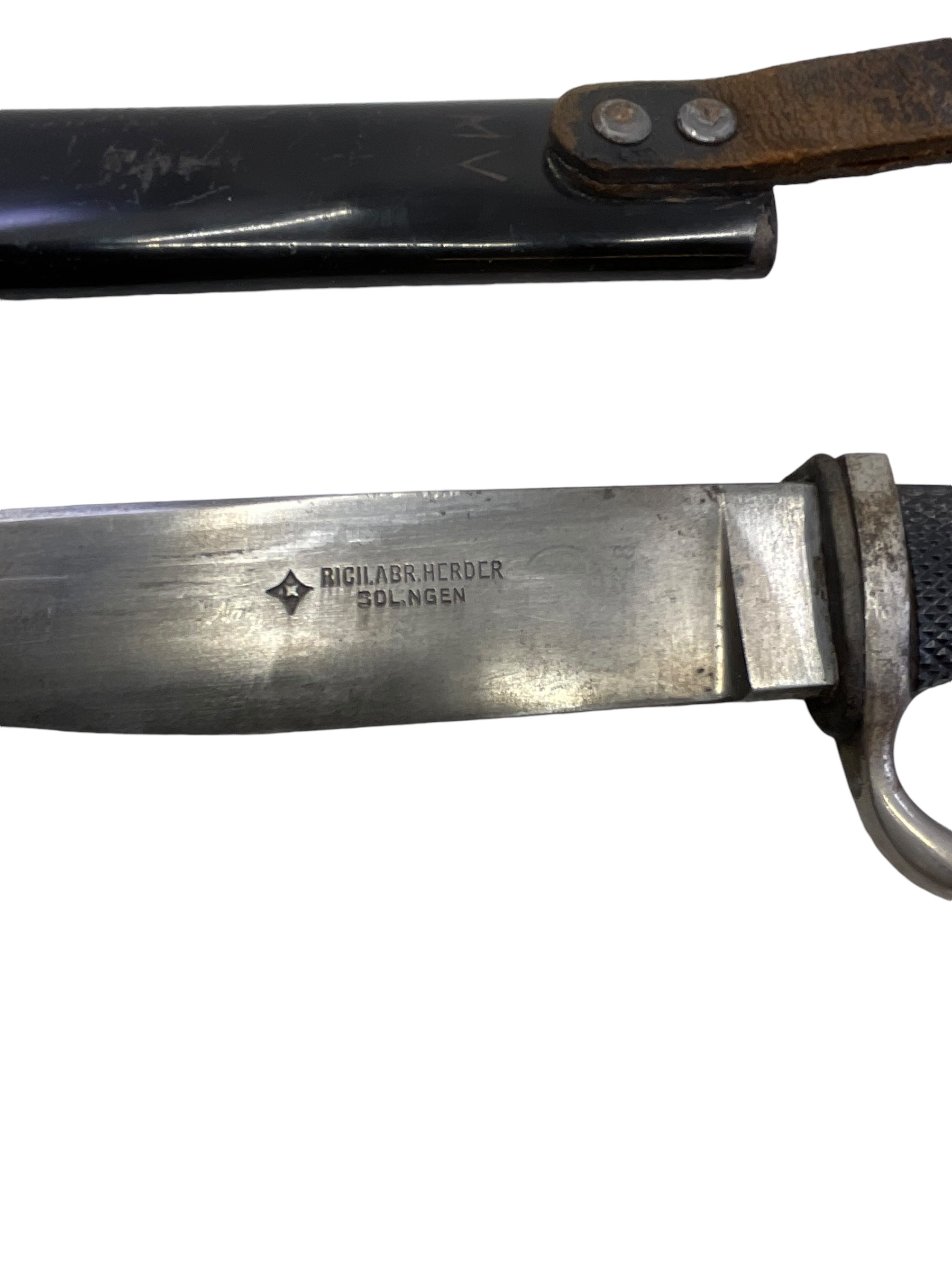 This item is an authentic WWII German Hitler Youth HJ Dagger, complete with its original scabbard. Made by the esteemed manufacturer Herder, a well-known German manufacturer, the dagger exhibits excellent craftsmanship with its sturdy build and detailed design. It features a diamond-shaped insignia on the grip, a mark of Hitler Youth. The scabbard, with its black finish and silver fittings, complements the dagger perfectly. Both pieces are in good condition, a testament to their durability and the care taken in their preservation. This dagger is more than just a weapon; it’s a piece of history, a tangible reminder of the turbulent times of WWII. Collectors and history enthusiasts would appreciate the value and significance of this rare artifact.