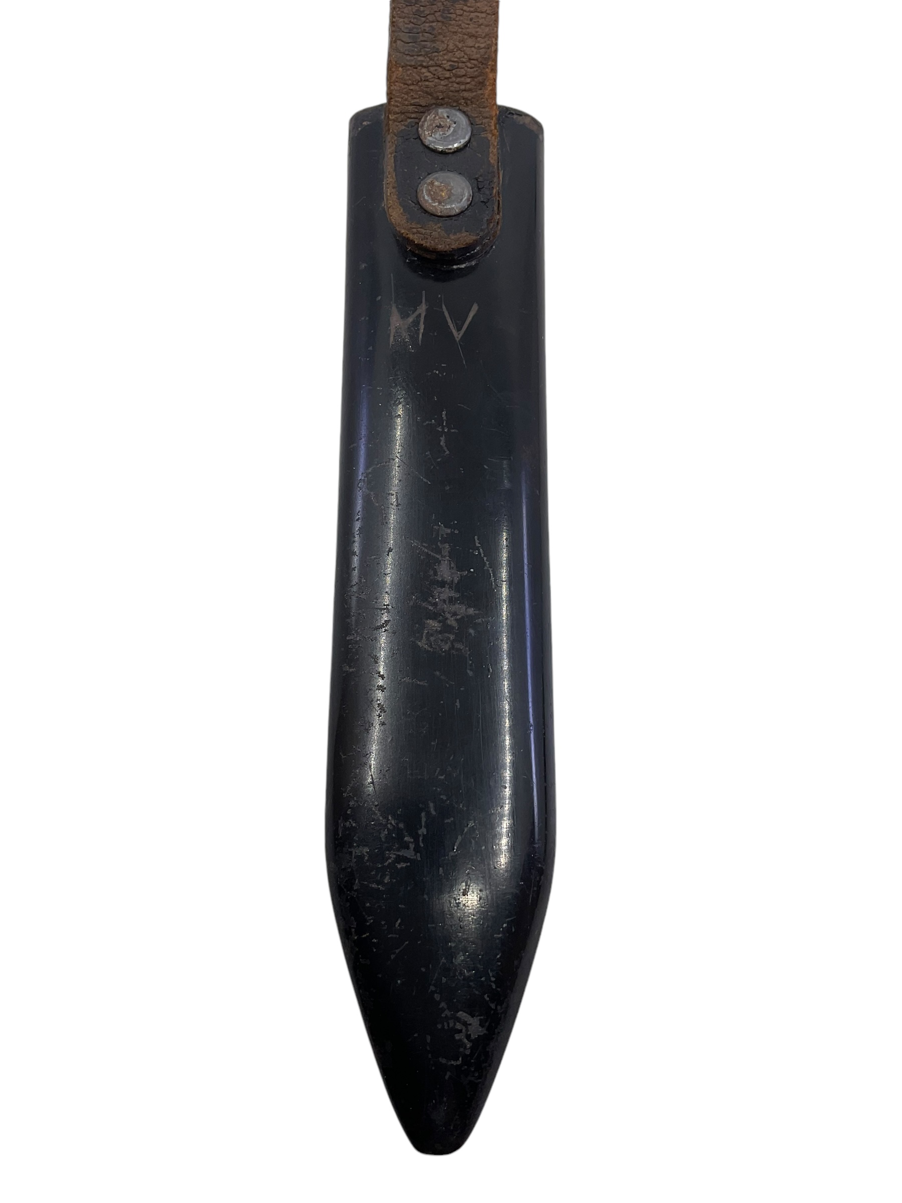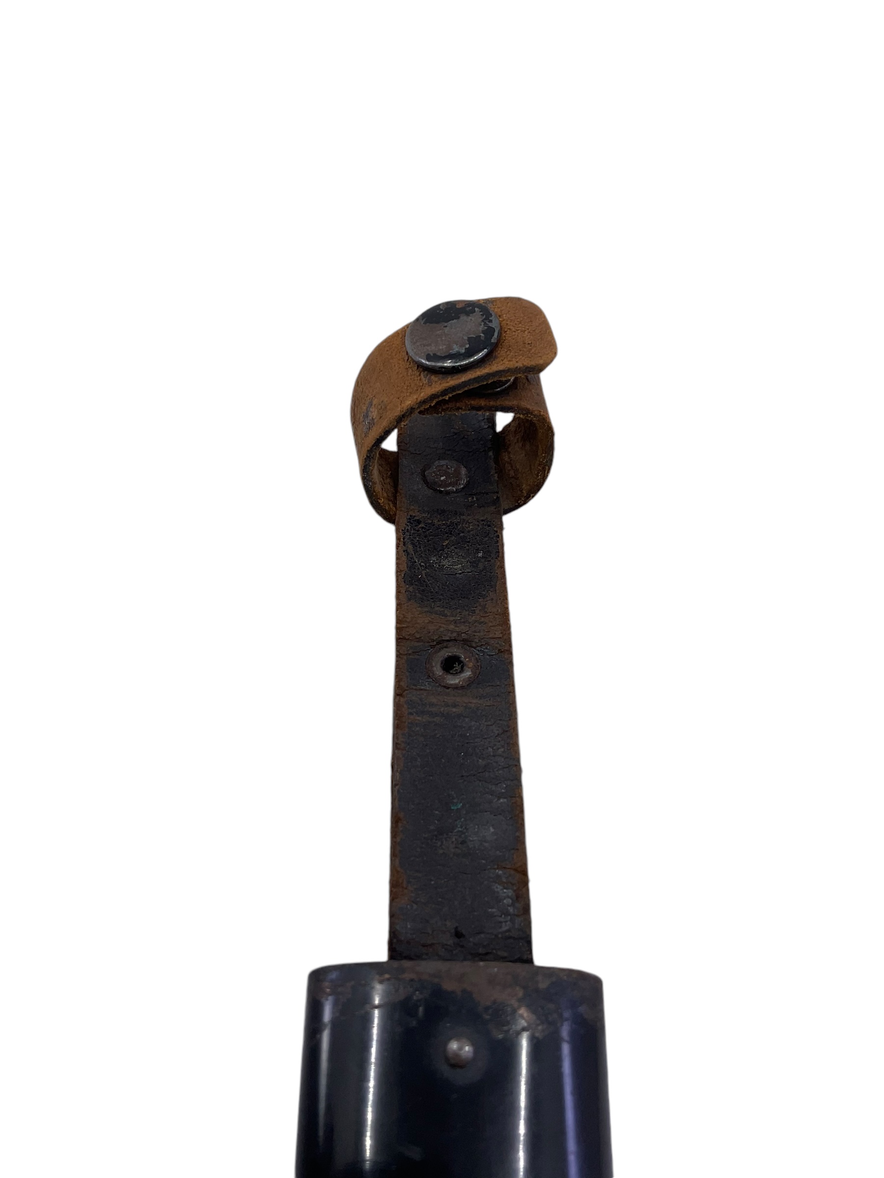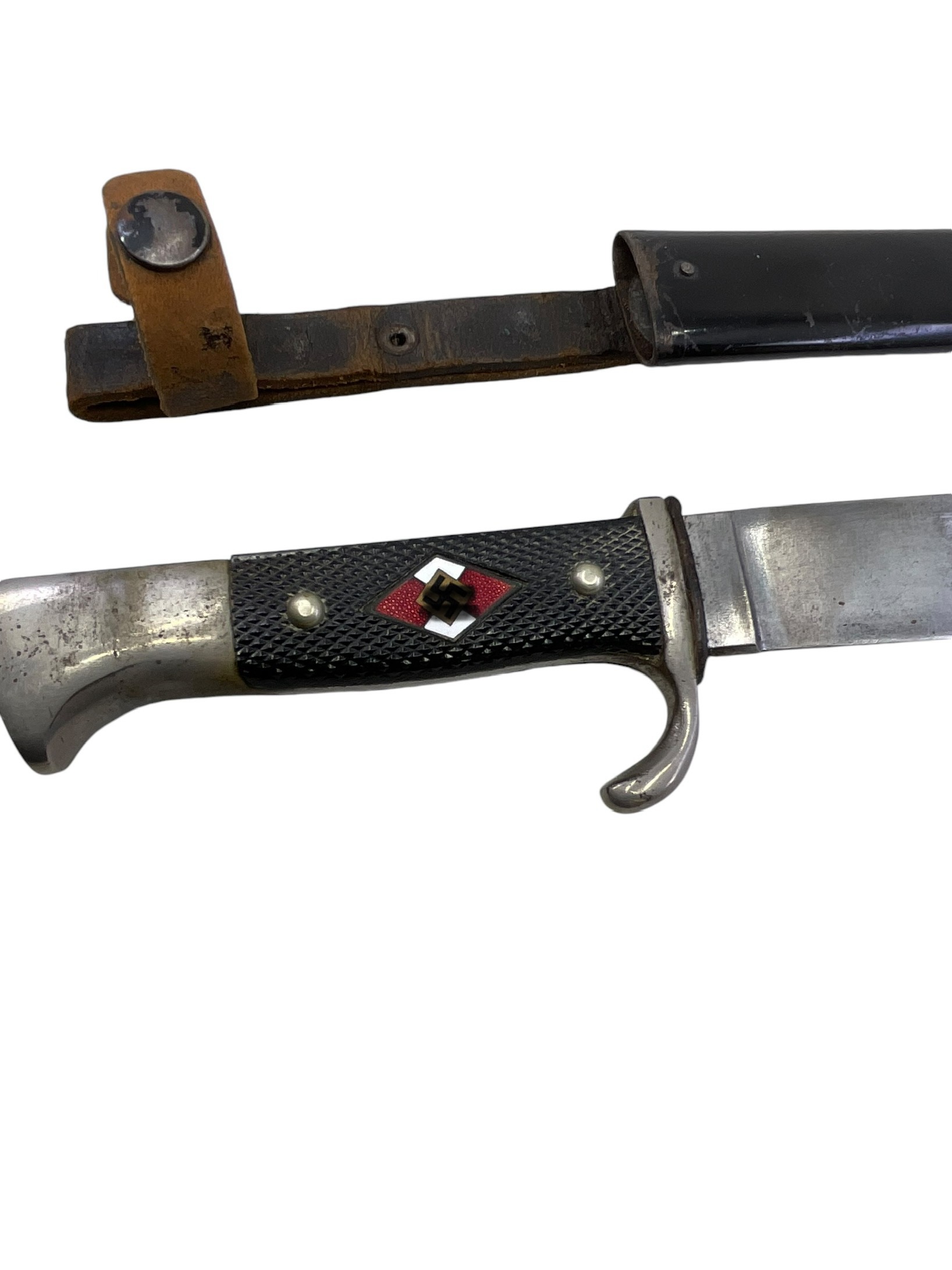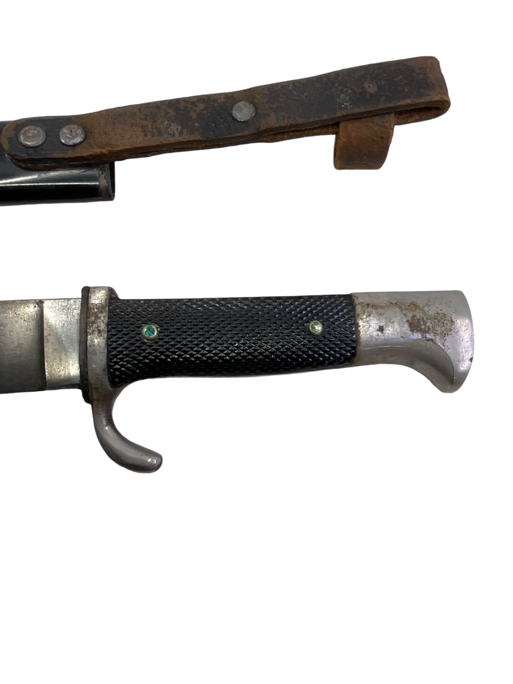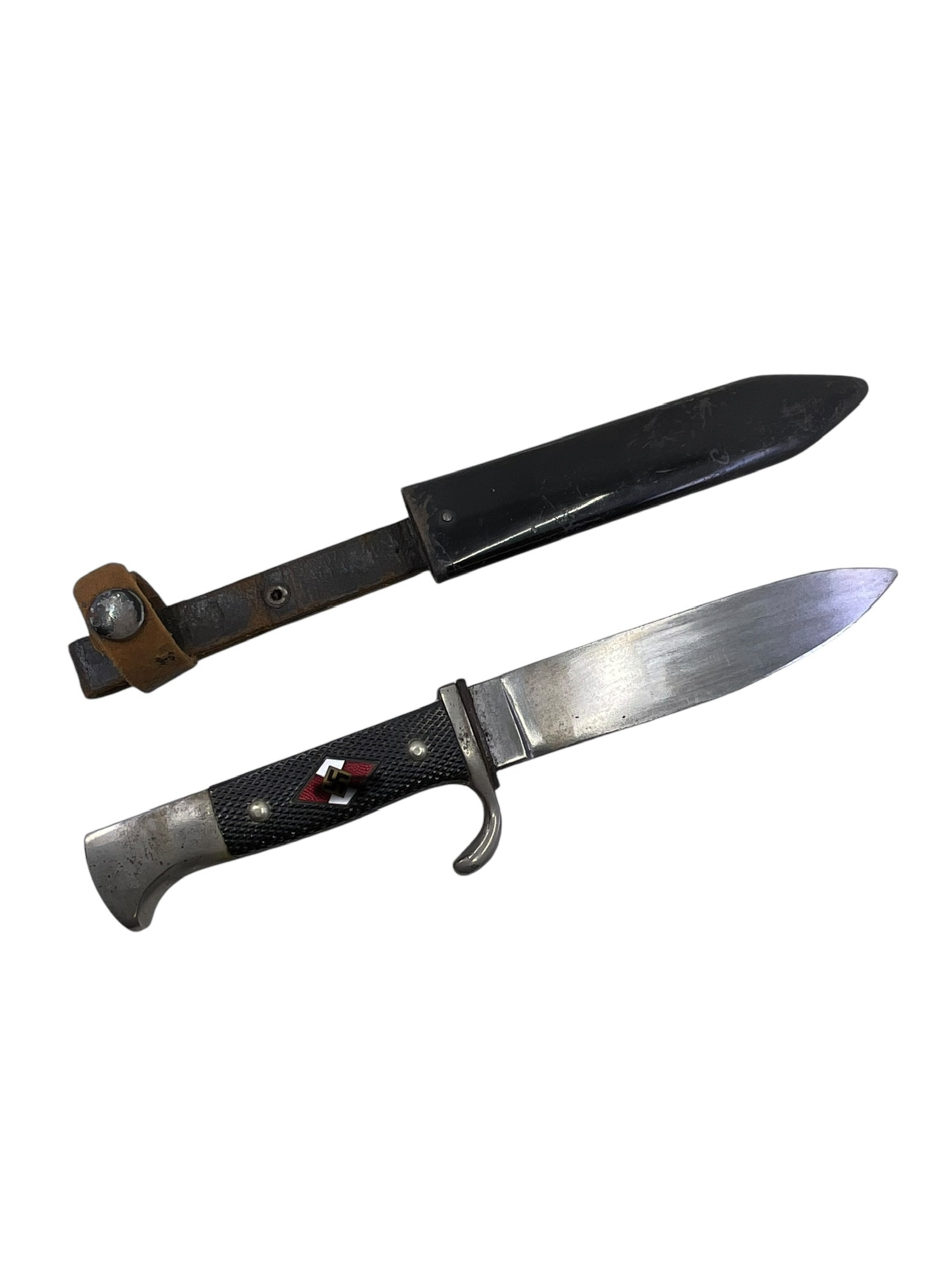 This item is an authentic WWII German Hitler Youth HJ Dagger, complete with its original scabbard. Made by the esteemed manufacturer Herder, a well-known German manufacturer, the dagger exhibits excellent craftsmanship with its sturdy build and detailed design. It features a diamond-shaped insignia on the grip, a mark of Hitler Youth. The scabbard, with its black finish and silver fittings, complements the dagger perfectly. Both pieces are in good condition, a testament to their durability and the care taken in their preservation. This dagger is more than just a weapon; it’s a piece of history, a tangible reminder of the turbulent times of WWII. Collectors and history enthusiasts would appreciate the value and significance of this rare artifact.