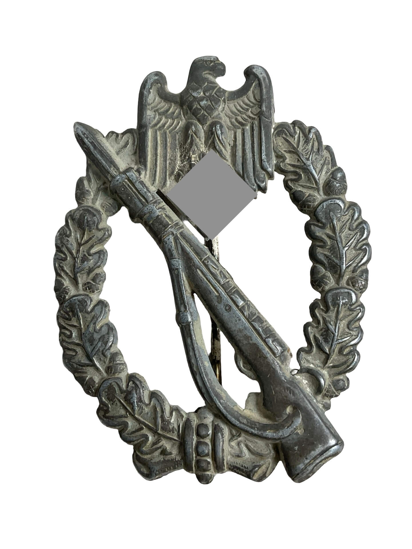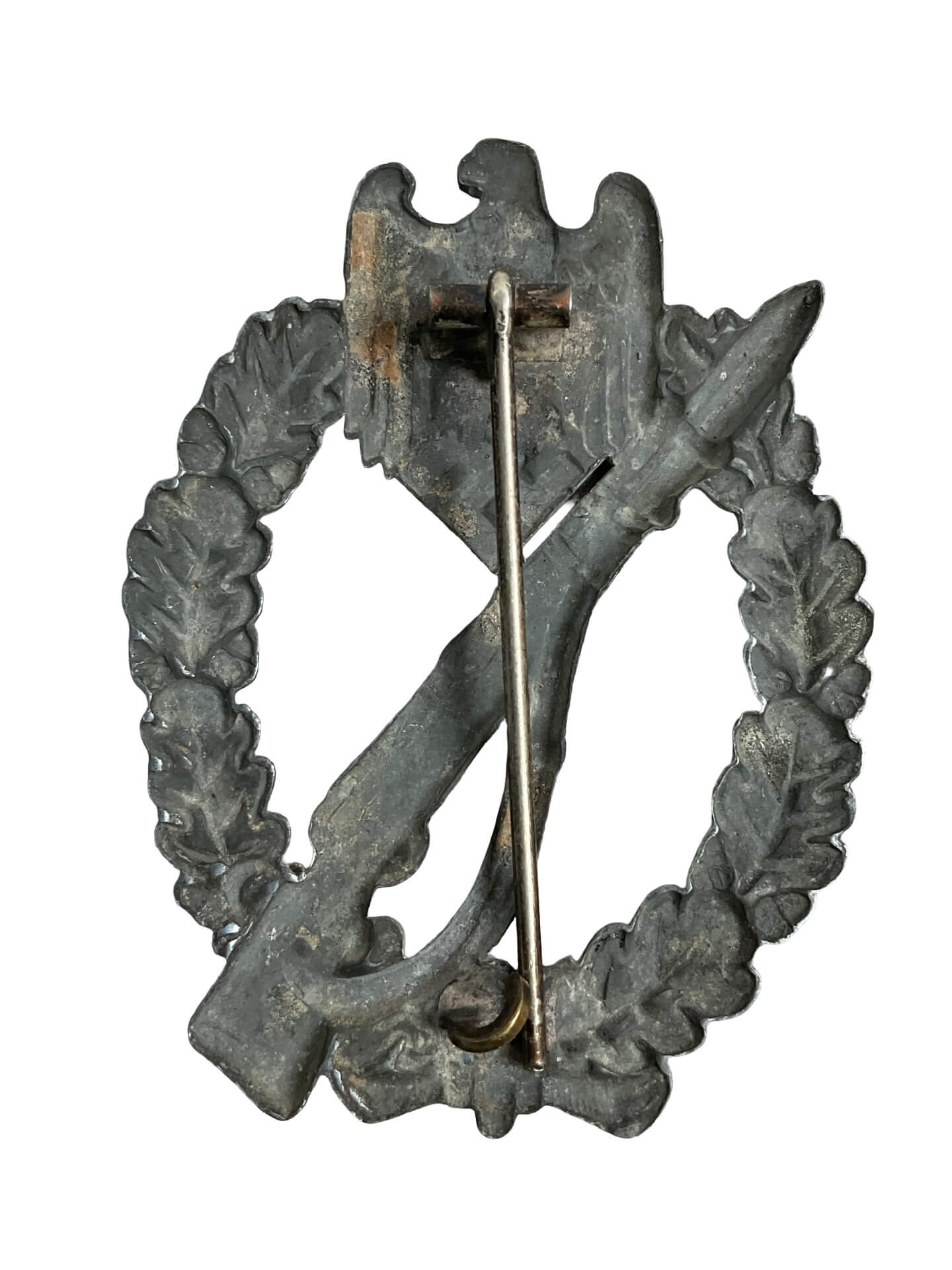 The WW2 German Infantry Assault Badge was instituted on December 20, 1939, to recognize the achievements of Wehrmacht infantry personnel during combat operations. This example is a standard issue badge produced without a maker mark, which was common among original wartime pieces. Constructed primarily from zinc alloy, the badge features an oval oak leaf wreath, surmounted by the German national eagle clutching a swastika. At the center, a rifle with a fixed bayonet is depicted, symbolizing front-line infantry engagement. The badge was awarded to members of infantry and motorized infantry units who participated in at least three infantry assaults, hand-to-hand combat, or similar engagements. Absence of a maker’s mark does not detract from authenticity, as numerous manufacturers remained anonymous during production due to wartime regulations or resource constraints. The reverse side typically exhibits a vertical pin and catch assembly for attachment to the uniform. This item is representative of German military awards issued during the Second World War.