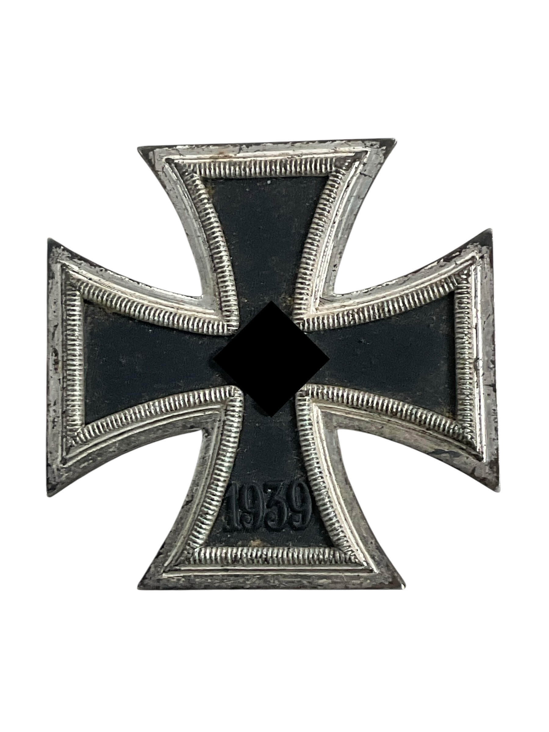 The WW2 German Iron Cross 1st Class Maker L/11 was a military decoration awarded for acts of bravery or leadership during combat in the Second World War. This example is attributed to Wilhelm Deumer, a recognized maker whose identification mark, L/11, is stamped on the reverse of the piece. The Iron Cross 1st Class features a blackened magnetic iron core surrounded by a silvered frame, with a pin-back design for wear on the uniform. The front displays a swastika at the center, with the date “1939” beneath, referencing the year of institution for the World War II version of the award. The reverse side is plain except for the maker’s code. The Iron Cross 1st Class was worn above the left breast pocket, signifying a higher recognition than the 2nd Class. Pieces by Wilhelm Deumer are noted for their quality of manufacture, consistent construction methods, and accurate maker’s markings.