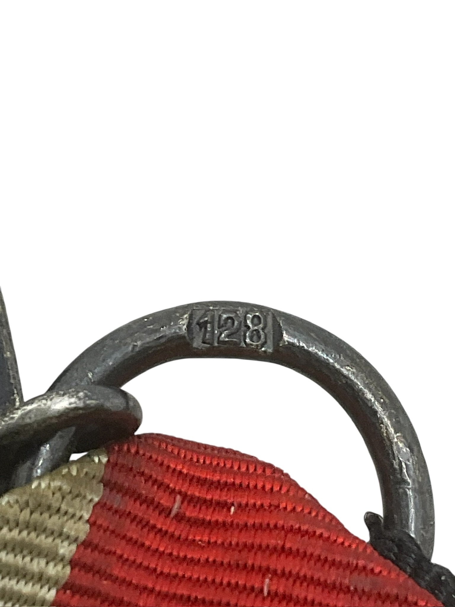 The WW2 German Iron Cross 2nd Class, marked by maker number “128” for S. Jablonski and Co, Posen, is an original military decoration awarded during the Second World War. The Iron Cross was instituted by the Kingdom of Prussia and continued as a prominent military honor in Germany. The 2nd Class variant was typically awarded for acts of bravery in combat or significant contributions to military operations. This piece features the standard design, with a blackened iron core bearing a raised “1939” motif, surrounded by a silvered frame and a suspension ring marked with the manufacturer’s code “128.” The original ribbon is generally included with this award and displays the characteristic black, white, and red stripes. S. Jablonski and Co, based in Posen, was an authorized manufacturer during the conflict, known for producing Iron Crosses to official specifications. Items like this are valued for their historical context and reference to German military history.