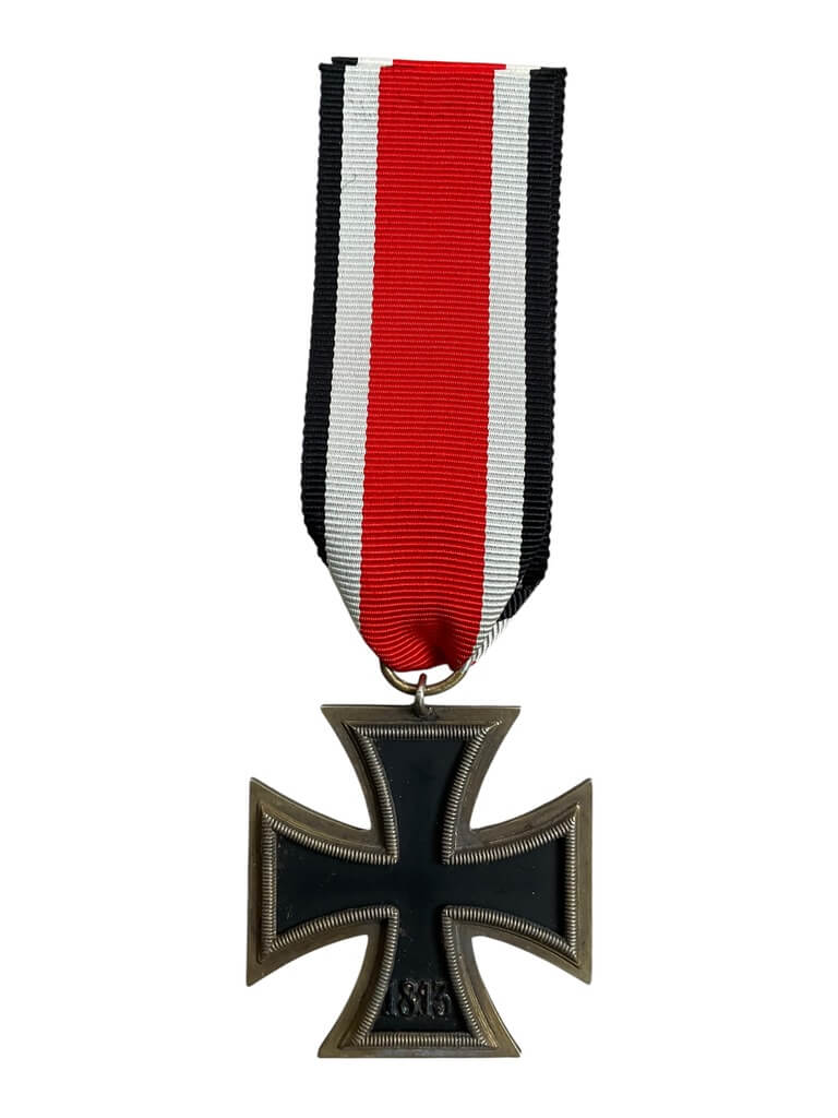 The WW2 German Iron Cross 2nd Class No Maker With Ribbon is a military decoration from World War II. Originally from Germany, it has no identifiable maker markings. This Iron Cross, awarded for bravery in battle, comes attached to a traditional ribbon, enhancing its historical authenticity.