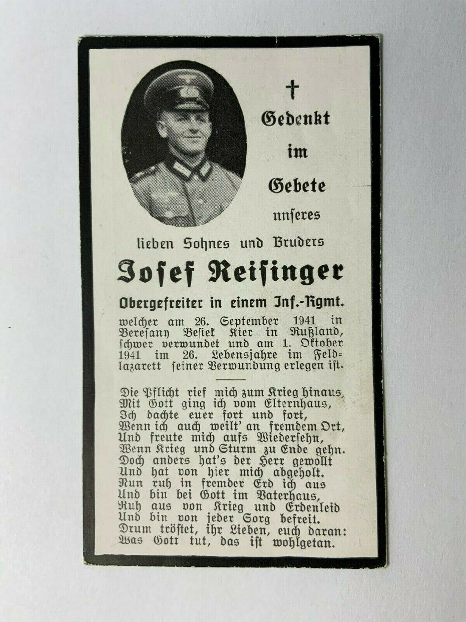 WW2 German Josef Reisinger Infantry Regiment Death Card